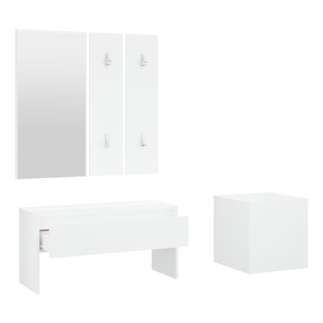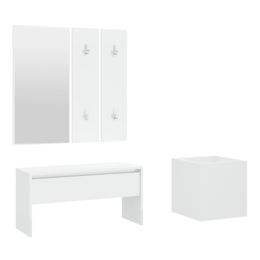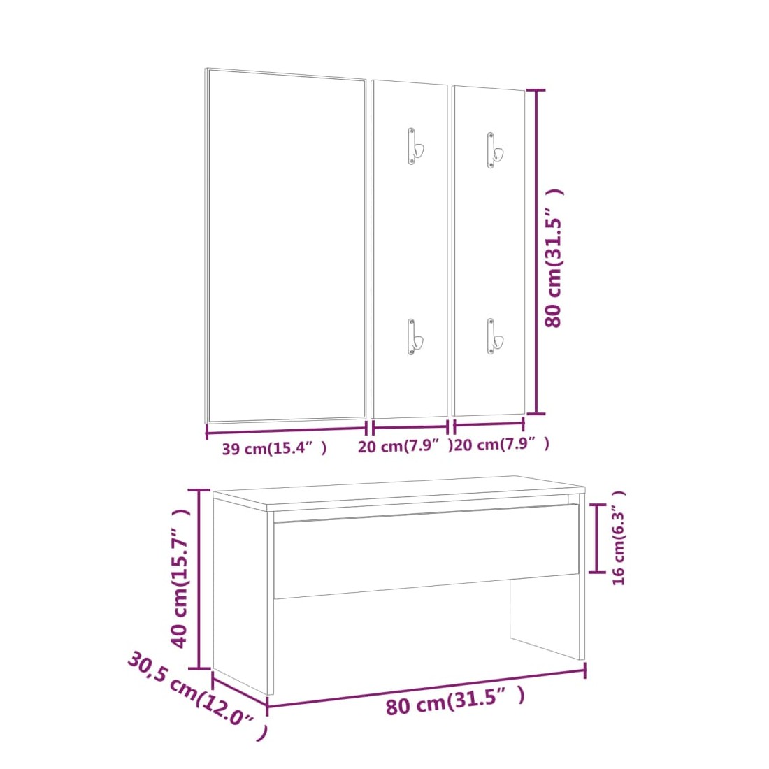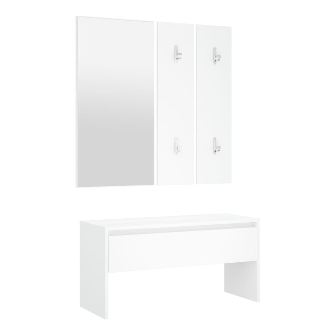 Créez un environnement chaleureux et accueillant juste à côté de votre porte avec cet ensemble de meubles de couloir ! Matériau robuste : le bois d'ingénierie est d'une qualité exceptionnelle avec une surface lisse et présente également résistance, stabilité et résistance à l'humidité.Grand espace de rangement : le banc d'entrée avec un tiroir offre un grand espace de rangement pour ranger des chaussures ou d'autres articles essentiels.Banc multifonctionnel : le banc peut être utilisé comme rangement ou pour placer vos objets décoratifs préférés dans votre espace de vie, il sert également de siège lorsque vous enfilez ou enlevez vos chaussures.Design pratique : le miroir pratique et les porte-manteaux sont pratiques pour suspendre vos vêtements et regarder dans le miroir.Belle jardinière : la jardinière est idéale pour faire pousser des plantes et des fleurs, ce qui en fait un excellent supplément à votre intérieur. Remarque :Chaque produit est livré avec un manuel de montage dans la boîte pour un montage facile.Les vis et les chevilles pour l'intérieur du mur ne sont pas incluses. Recherchez et utilisez des vis et des chevilles adaptées à vos murs. Si vous n'êtes pas sûr, demandez conseil à un professionnel. Lisez et suivez attentivement chaque étape des instructions.