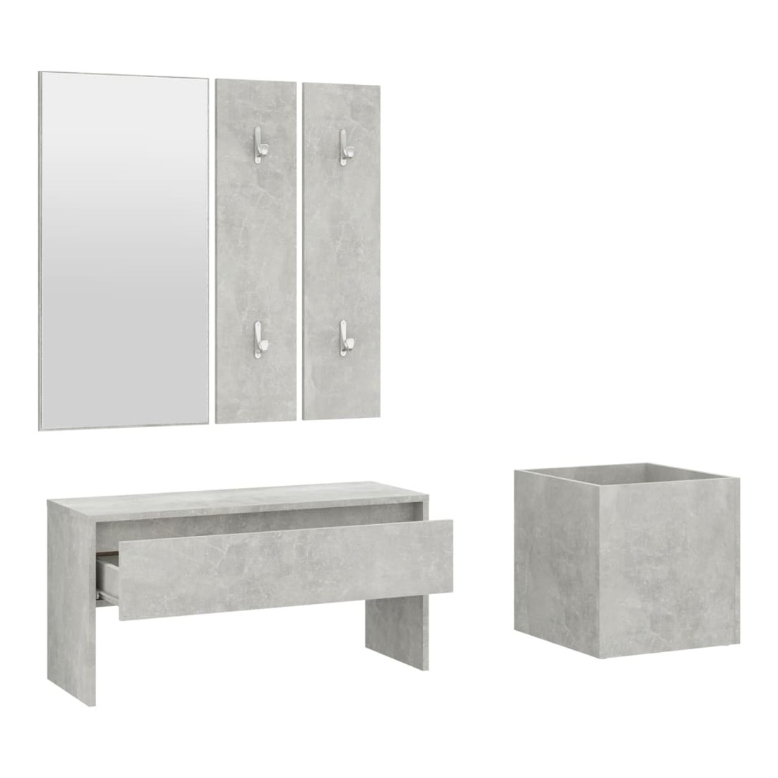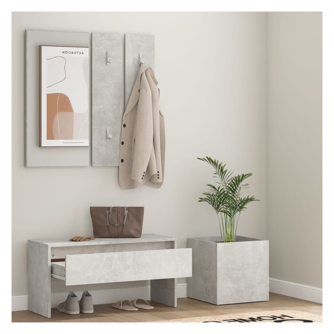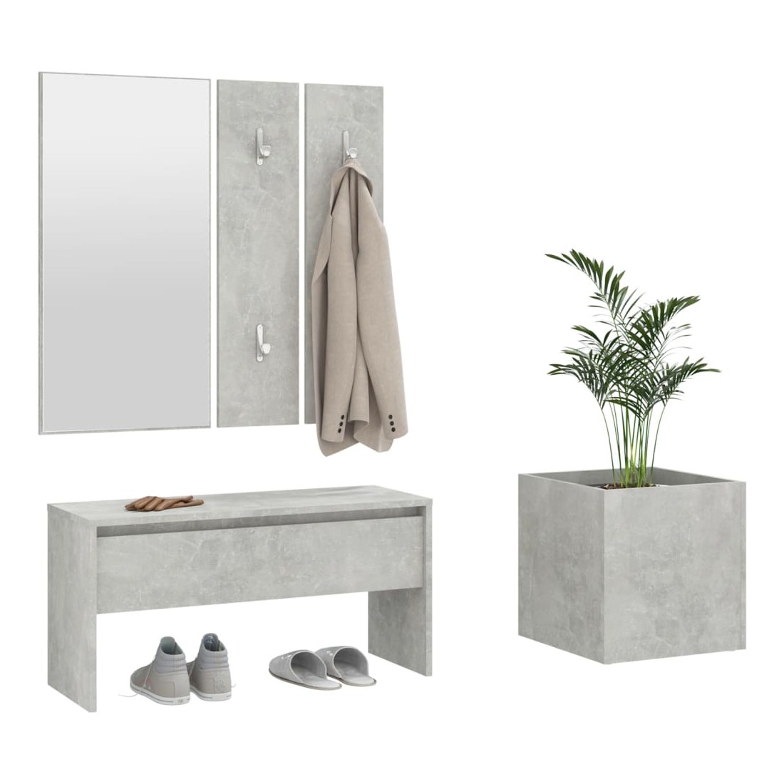 Créez un environnement chaleureux et accueillant juste à côté de votre porte avec cet ensemble de meubles de couloir ! Matériau robuste : le bois d'ingénierie est d'une qualité exceptionnelle avec une surface lisse et présente également résistance, stabilité et résistance à l'humidité.Grand espace de rangement : le banc d'entrée avec un tiroir offre un grand espace de rangement pour ranger des chaussures ou d'autres articles essentiels.Banc multifonctionnel : le banc peut être utilisé comme rangement ou pour placer vos objets décoratifs préférés dans votre espace de vie, il sert également de siège lorsque vous enfilez ou enlevez vos chaussures.Design pratique : le miroir pratique et les porte-manteaux sont pratiques pour suspendre vos vêtements et regarder dans le miroir.Belle jardinière : la jardinière est idéale pour faire pousser des plantes et des fleurs, ce qui en fait un excellent supplément à votre intérieur. Remarque :Chaque produit est livré avec un manuel de montage dans la boîte pour un montage facile.Les vis et les chevilles pour l'intérieur du mur ne sont pas incluses. Recherchez et utilisez des vis et des chevilles adaptées à vos murs. Si vous n'êtes pas sûr, demandez conseil à un professionnel. Lisez et suivez attentivement chaque étape des instructions.