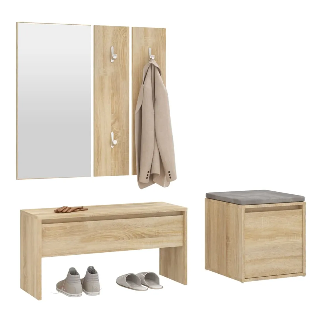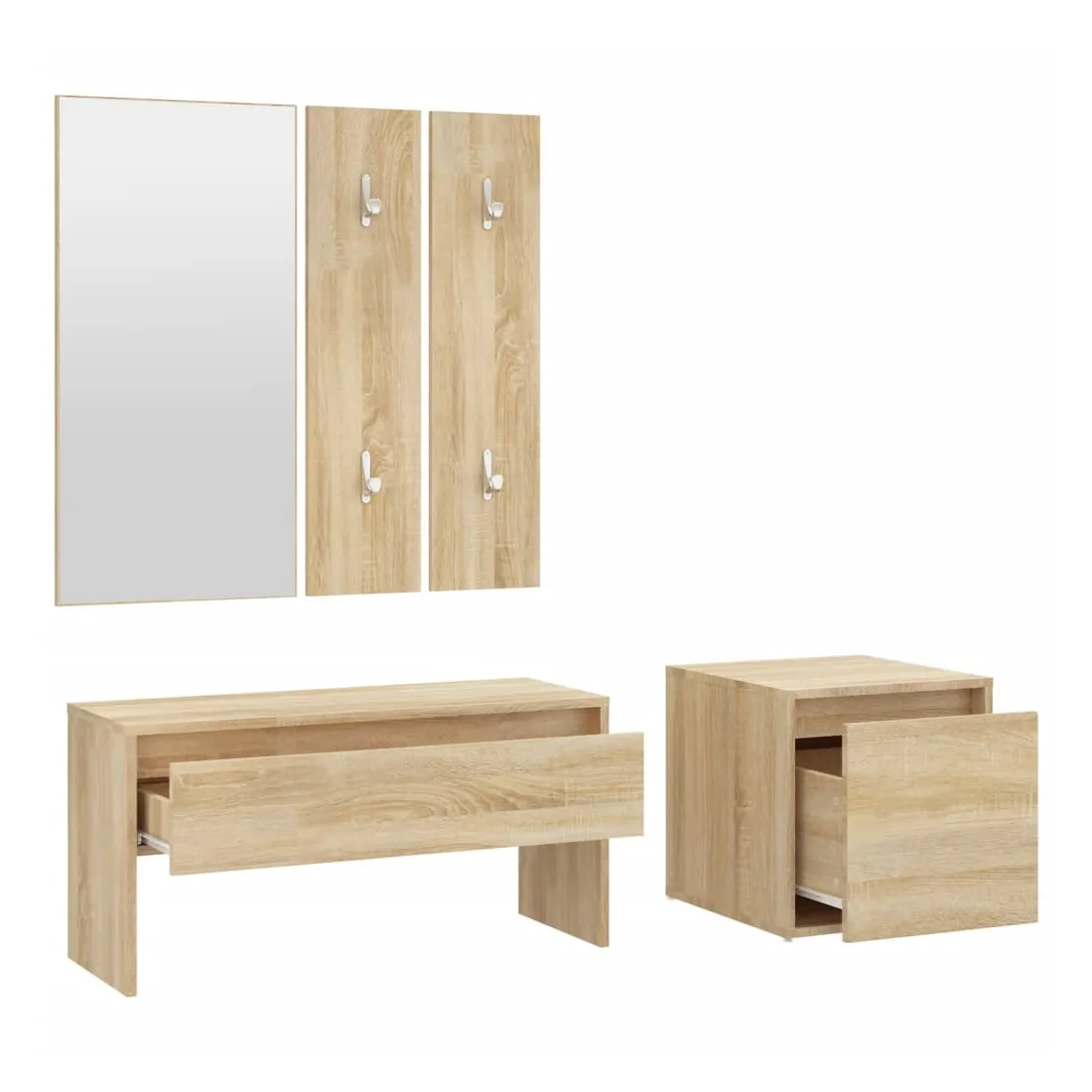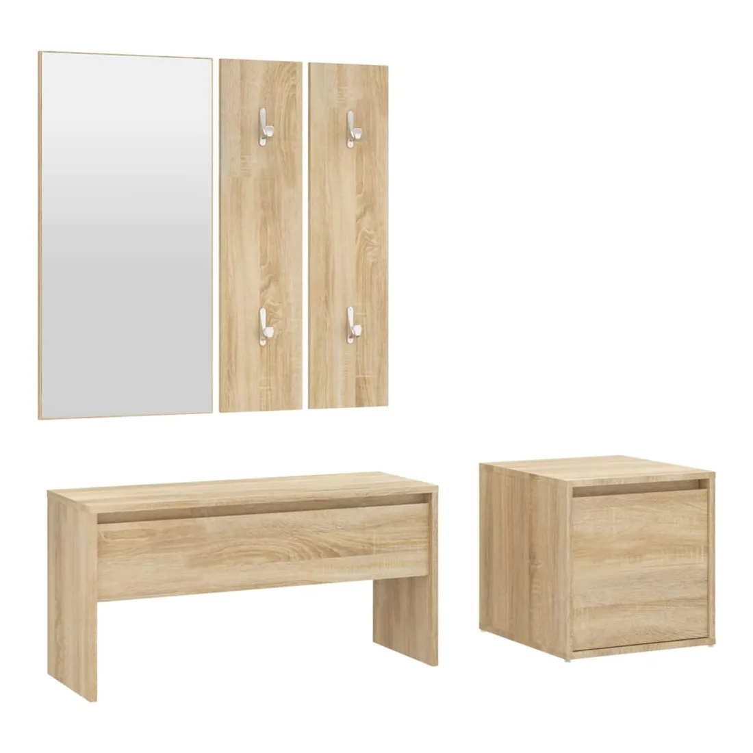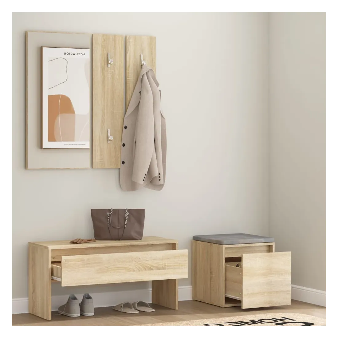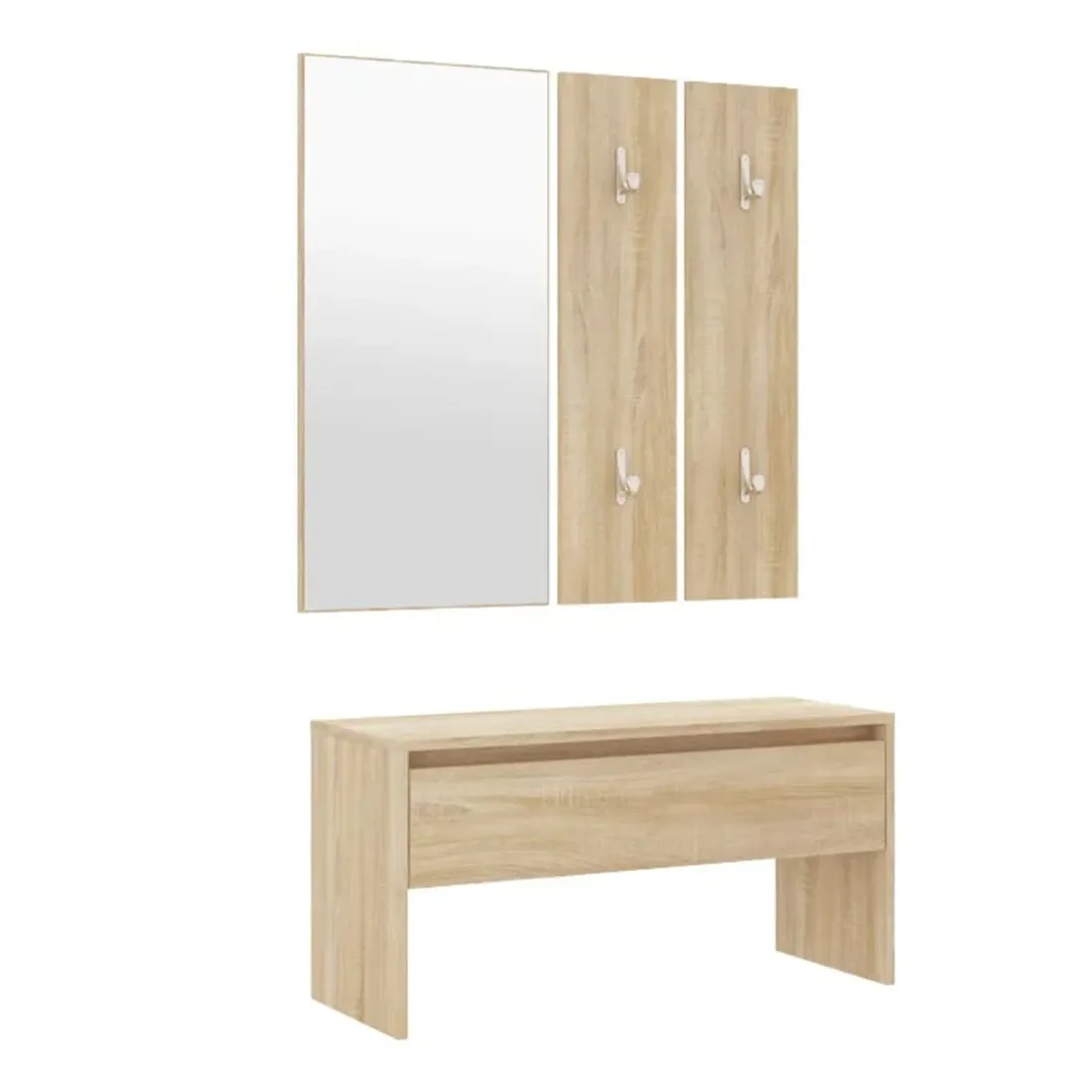Créez un environnement chaleureux et accueillant juste à côté de votre porte avec cet ensemble de meubles de couloir ! Matériau robuste : le bois d'ingénierie est d'une qualité exceptionnelle avec une surface lisse et présente également résistance, stabilité et résistance à l'humidité.Grand espace de rangement : le banc d'entrée et le tiroir boîte disposent d'un tiroir, offrant un grand espace de rangement pour ranger les chaussures et autres articles essentiels.Design multifonctionnel : le banc et la boîte de couloir peuvent être utilisés à la fois comme rangement et comme un endroit pour ranger vos objets décoratifs préférés dans votre espace de vie. Ils peuvent également servir de sièges lorsque vous enfilez ou retirez vos chaussures.Design pratique : le miroir pratique et les porte-manteaux sont pratiques pour suspendre vos vêtements et regarder dans le miroir. Remarque :Chaque produit est livré avec un manuel de montage dans la boîte pour un montage facile.Les vis et les chevilles pour l'intérieur du mur ne sont pas incluses. Recherchez et utilisez des vis et des chevilles adaptées à vos murs. Si vous n'êtes pas sûr, demandez conseil à un professionnel. Lisez et suivez attentivement chaque étape des instructions.