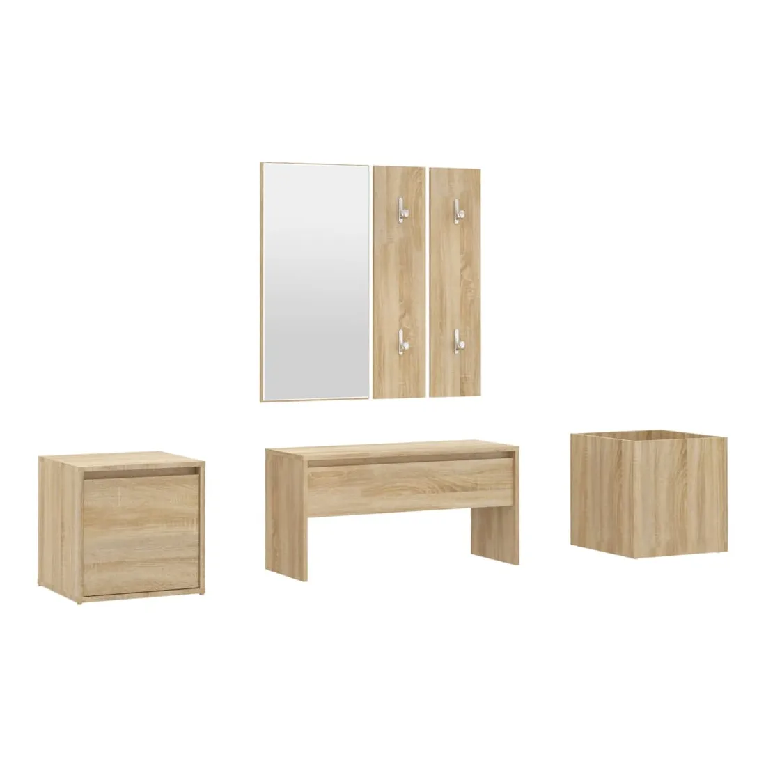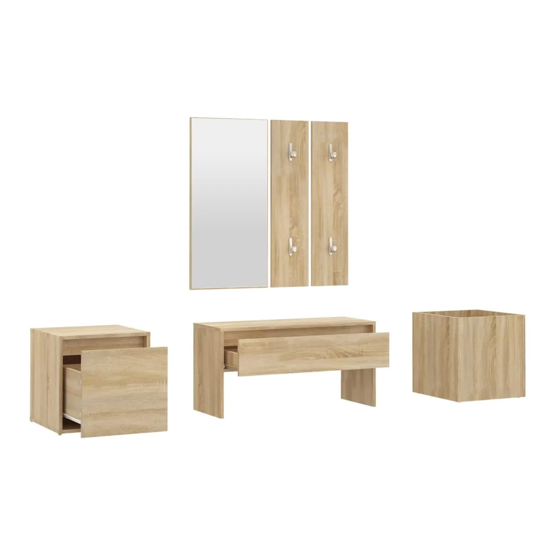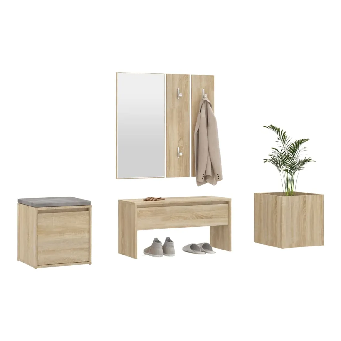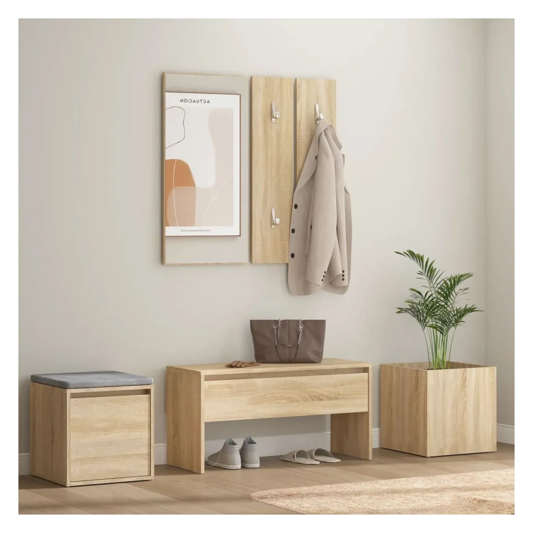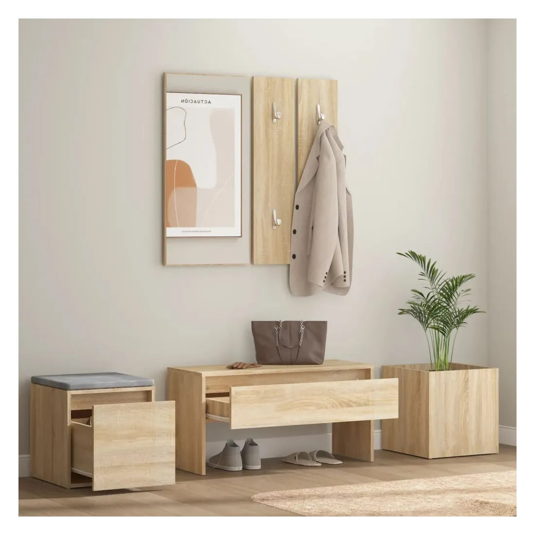 Créez un environnement chaleureux et accueillant juste à côté de votre porte avec cet ensemble de meubles de couloir ! Matériau robuste : le bois d'ingénierie est d'une qualité exceptionnelle avec une surface lisse et présente également résistance, stabilité et résistance à l'humidité.Grand espace de rangement : le banc d'entrée et la boîte de rangement avec un tiroir offrent un grand espace de rangement pour ranger des chaussures et d'autres articles essentiels.Utilisation multifonctionnelle : le banc et le tiroir à boîte peuvent être utilisés à la fois comme rangement et comme un endroit pour ranger vos objets décoratifs préférés dans votre espace de vie. Ils peuvent également servir de sièges lorsque vous enfilez ou retirez vos chaussures.Design pratique : le miroir pratique et les porte-manteaux sont pratiques pour suspendre vos vêtements et regarder dans le miroir.Belle jardinière : la jardinière est idéale pour faire pousser des plantes et des fleurs, ce qui en fait un excellent supplément à votre intérieur. Remarque :Chaque produit est livré avec un manuel de montage dans la boîte pour un montage facile.Les vis et les chevilles pour l'intérieur du mur ne sont pas incluses. Recherchez et utilisez des vis et des chevilles adaptées à vos murs. Si vous n'êtes pas sûr, demandez conseil à un professionnel. Lisez et suivez attentivement chaque étape des instructions.