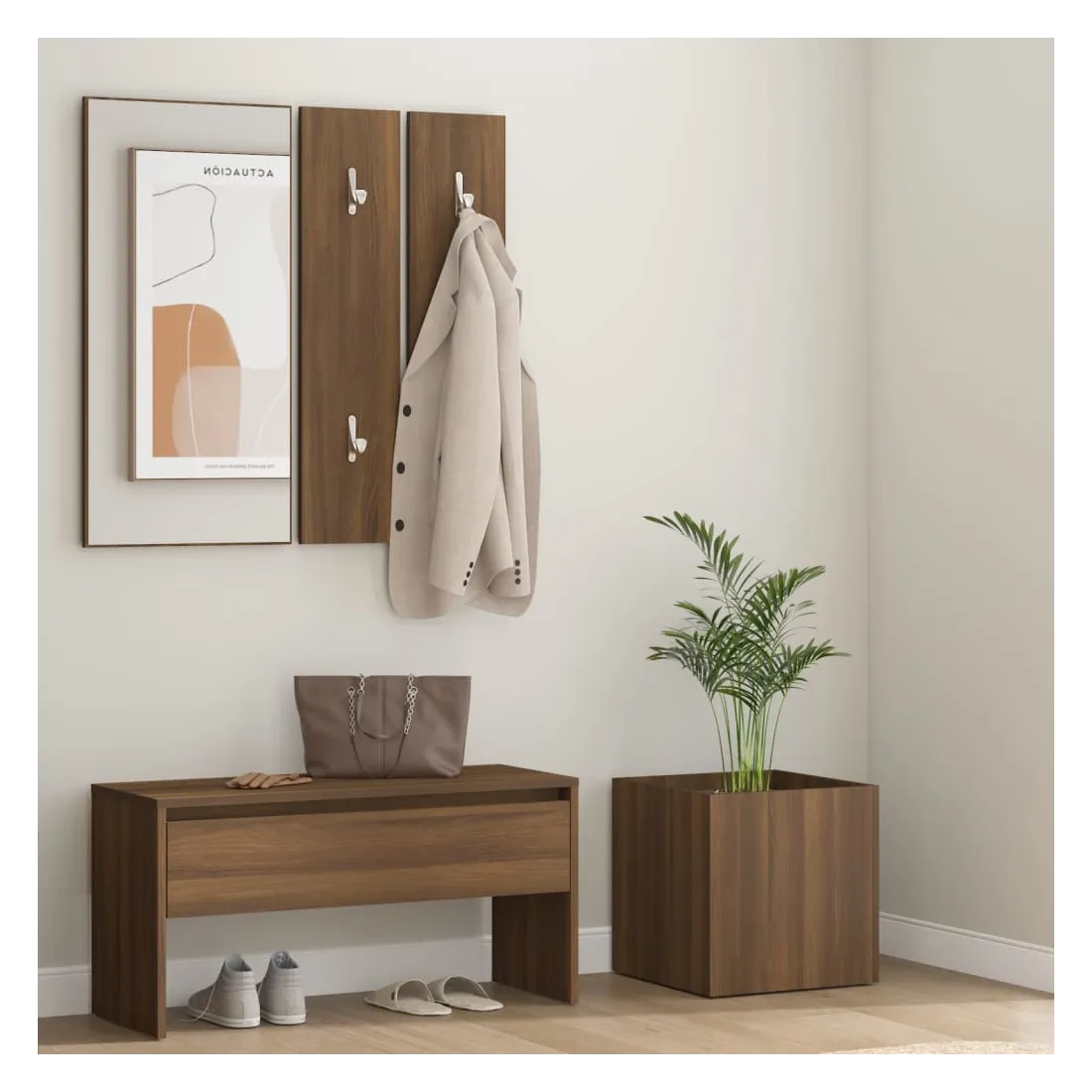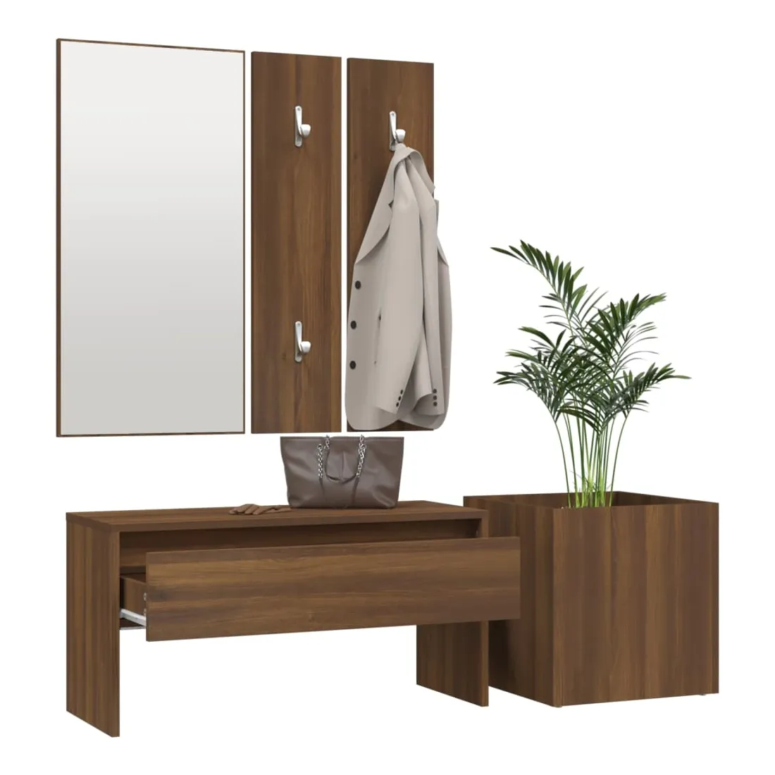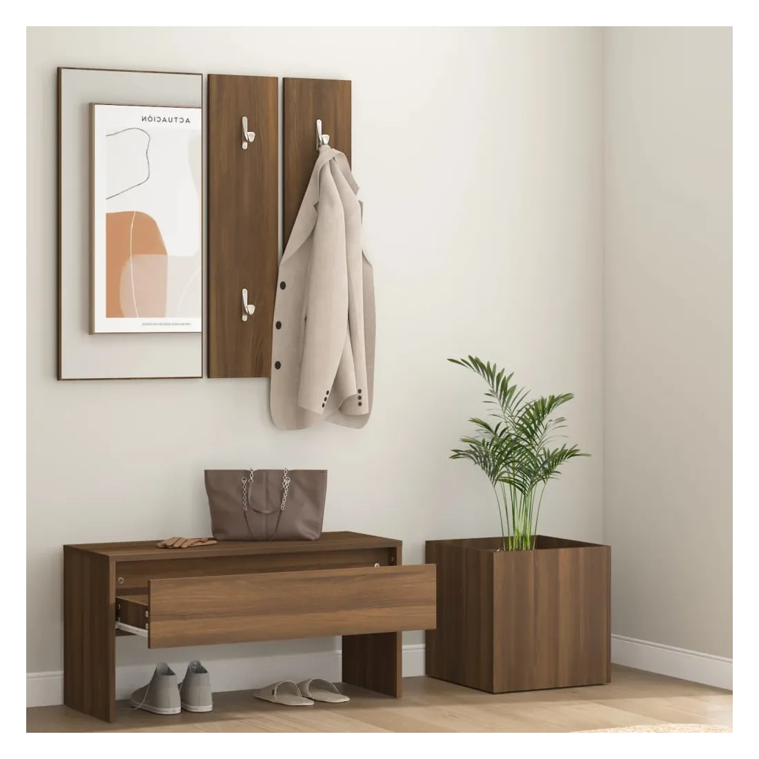 Créez un environnement chaleureux et accueillant juste à côté de votre porte avec cet ensemble de meubles de couloir ! Matériau robuste : le bois d'ingénierie est d'une qualité exceptionnelle avec une surface lisse et présente également résistance, stabilité et résistance à l'humidité.Espace grand de rangement : le banc, doté d’un tiroir, offre un grand espace de rangement pour garder vos chaussures, magazines, livres, DVD bien organisés et les protéger de la poussière.Utilisation multifonctionnelle : le banc de rangement peut être utilisé à la fois comme rangement et comme un endroit pour ranger vos objets décoratifs préférés dans votre espace de vie. Il peut également servir de siège lorsque vous enfilez ou retirez vos chaussures.Design pratique : le miroir pratique et les porte-manteaux sont pratiques pour suspendre vos vêtements et regarder dans le miroir.Fonction décorative : la jardinière peut contenir vos plantes ou fleurs préférées, ce qui est idéal pour votre intérieur comme décoration. Remarque :Chaque produit est livré avec un manuel de montage dans la boîte pour un montage facile.Les vis et les chevilles pour l'intérieur du mur ne sont pas incluses. Recherchez et utilisez des vis et des chevilles adaptées à vos murs. Si vous n'êtes pas sûr, demandez conseil à un professionnel. Lisez et suivez attentivement chaque étape des instructions.