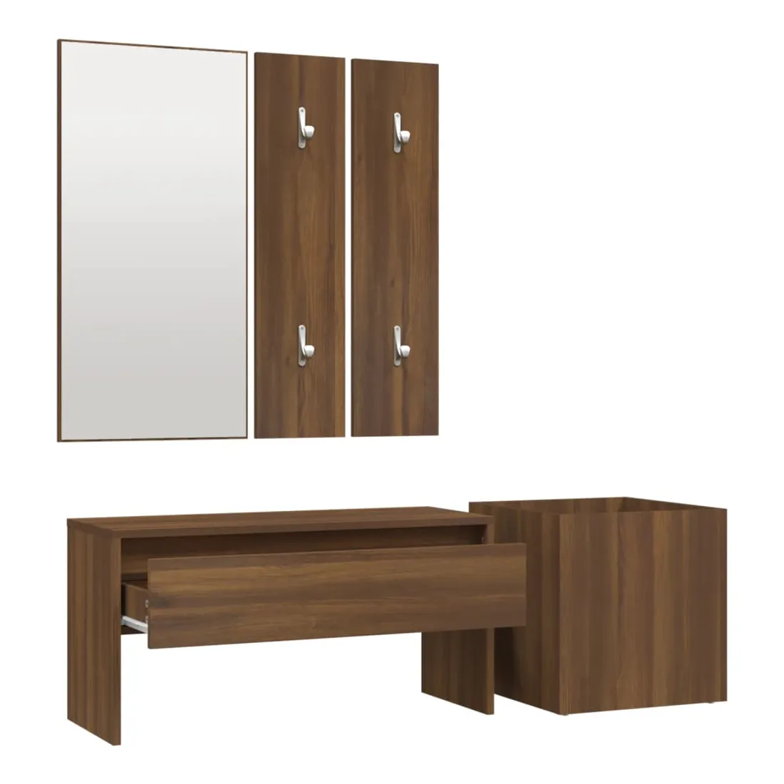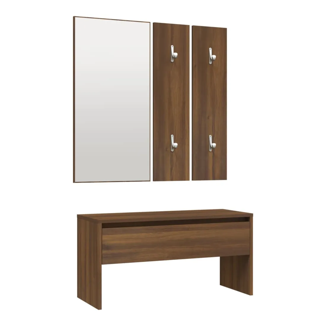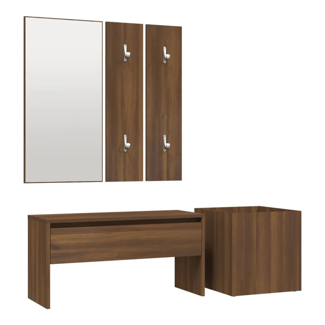 Créez un environnement chaleureux et accueillant juste à côté de votre porte avec cet ensemble de meubles de couloir ! Matériau robuste : le bois d'ingénierie est d'une qualité exceptionnelle avec une surface lisse et présente également résistance, stabilité et résistance à l'humidité.Espace grand de rangement : le banc, doté d’un tiroir, offre un grand espace de rangement pour garder vos chaussures, magazines, livres, DVD bien organisés et les protéger de la poussière.Utilisation multifonctionnelle : le banc de rangement peut être utilisé à la fois comme rangement et comme un endroit pour ranger vos objets décoratifs préférés dans votre espace de vie. Il peut également servir de siège lorsque vous enfilez ou retirez vos chaussures.Design pratique : le miroir pratique et les porte-manteaux sont pratiques pour suspendre vos vêtements et regarder dans le miroir.Fonction décorative : la jardinière peut contenir vos plantes ou fleurs préférées, ce qui est idéal pour votre intérieur comme décoration. Remarque :Chaque produit est livré avec un manuel de montage dans la boîte pour un montage facile.Les vis et les chevilles pour l'intérieur du mur ne sont pas incluses. Recherchez et utilisez des vis et des chevilles adaptées à vos murs. Si vous n'êtes pas sûr, demandez conseil à un professionnel. Lisez et suivez attentivement chaque étape des instructions.