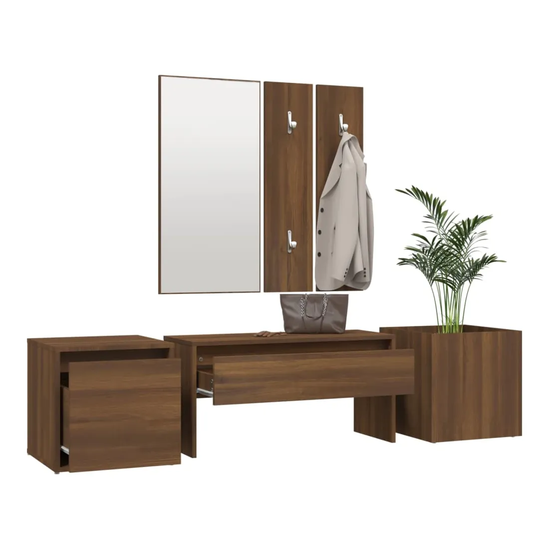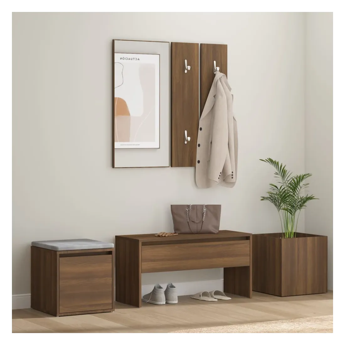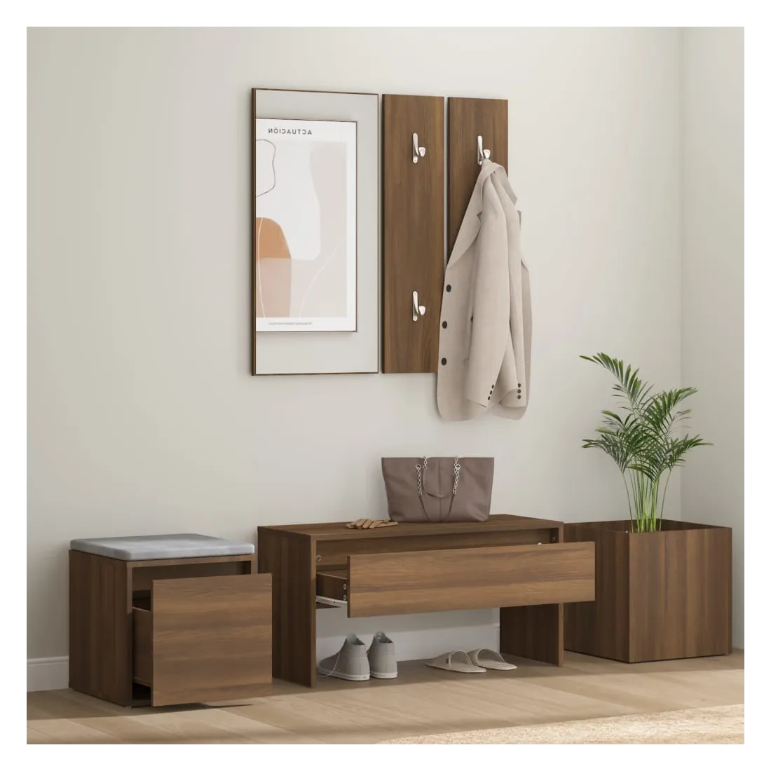 Créez un environnement chaleureux et accueillant juste à côté de votre porte avec cet ensemble de meubles de couloir ! Matériau robuste : le bois d'ingénierie est d'une qualité exceptionnelle avec une surface lisse et présente également résistance, stabilité et résistance à l'humidité.Grand espace de rangement : le banc d'entrée et la boîte de rangement sont dotés d'un tiroir, offrant un espace de rangement suffisant pour ranger vos chaussures, magazines, livres et DVD de manière ordonnée.Utilisation multifonctionnelle : le banc et le tiroir à boîte peuvent être utilisés à la fois comme rangement et comme un endroit pour ranger vos objets décoratifs préférés dans votre espace de vie. Ils peuvent également servir de sièges lorsque vous enfilez ou retirez vos chaussures.Design pratique : le miroir pratique et les porte-manteaux sont pratiques pour suspendre vos vêtements et regarder dans le miroir.Fonction décorative : la jardinière peut contenir vos plantes ou fleurs préférées, ce qui est idéal pour votre intérieur comme décoration. Remarque :Chaque produit est livré avec un manuel de montage dans la boîte pour un montage facile.Les vis et les chevilles pour l'intérieur du mur ne sont pas incluses. Recherchez et utilisez des vis et des chevilles adaptées à vos murs. Si vous n'êtes pas sûr, demandez conseil à un professionnel. Lisez et suivez attentivement chaque étape des instructions.