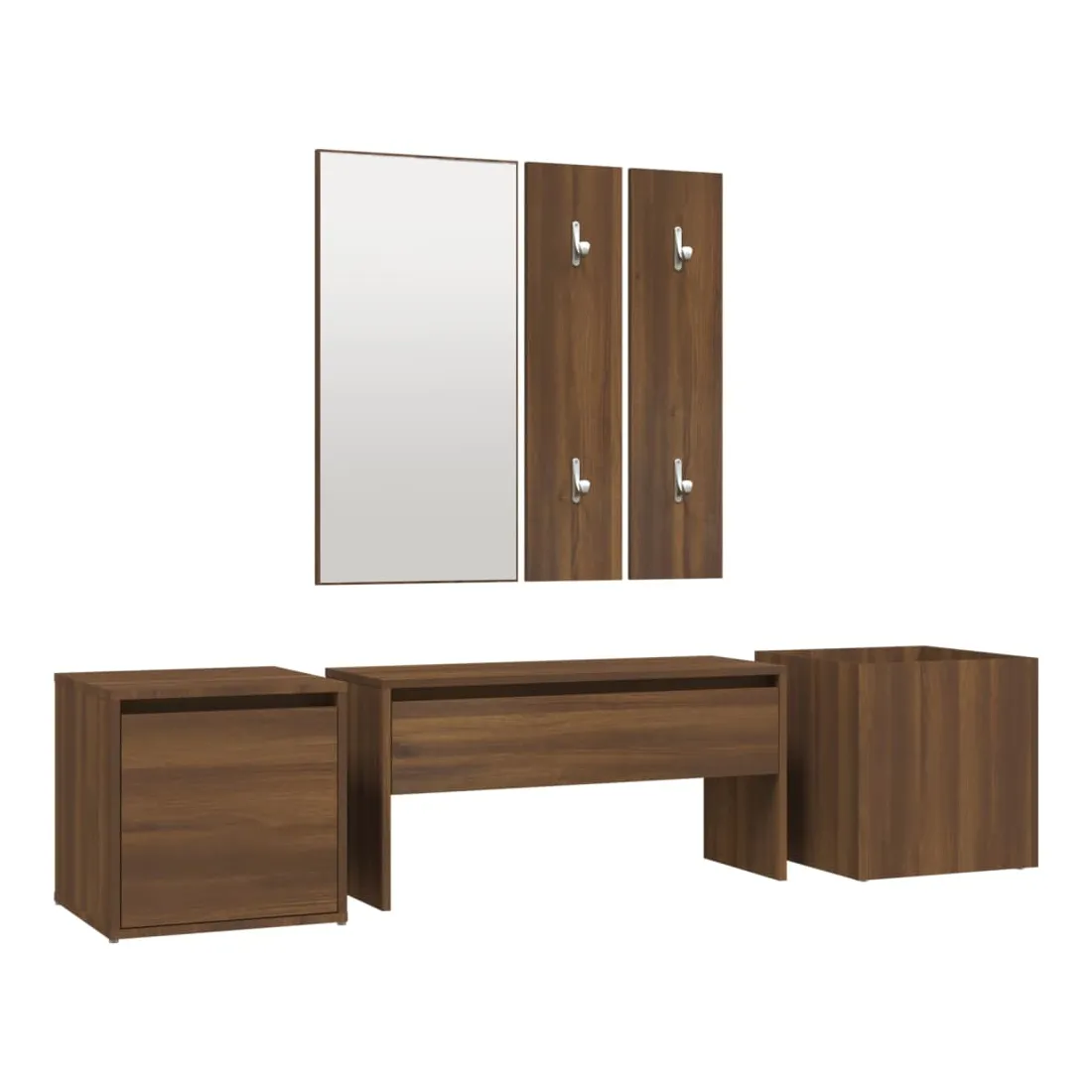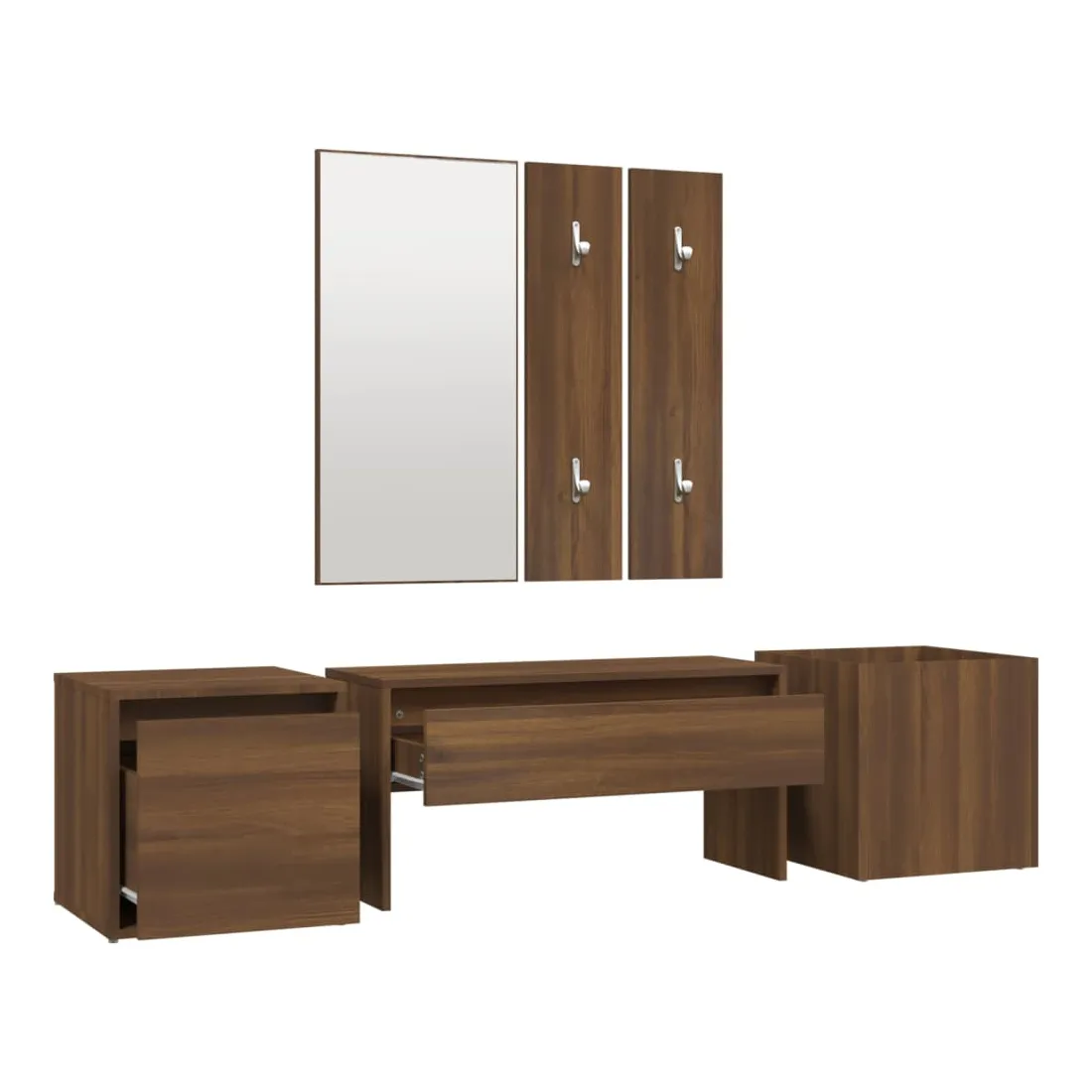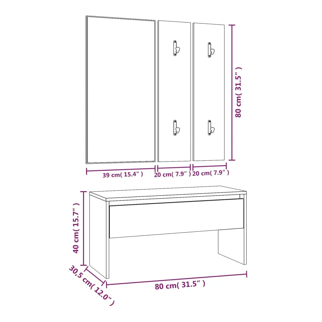 Créez un environnement chaleureux et accueillant juste à côté de votre porte avec cet ensemble de meubles de couloir ! Matériau robuste : le bois d'ingénierie est d'une qualité exceptionnelle avec une surface lisse et présente également résistance, stabilité et résistance à l'humidité.Grand espace de rangement : le banc d'entrée et la boîte de rangement sont dotés d'un tiroir, offrant un espace de rangement suffisant pour ranger vos chaussures, magazines, livres et DVD de manière ordonnée.Utilisation multifonctionnelle : le banc et le tiroir à boîte peuvent être utilisés à la fois comme rangement et comme un endroit pour ranger vos objets décoratifs préférés dans votre espace de vie. Ils peuvent également servir de sièges lorsque vous enfilez ou retirez vos chaussures.Design pratique : le miroir pratique et les porte-manteaux sont pratiques pour suspendre vos vêtements et regarder dans le miroir.Fonction décorative : la jardinière peut contenir vos plantes ou fleurs préférées, ce qui est idéal pour votre intérieur comme décoration. Remarque :Chaque produit est livré avec un manuel de montage dans la boîte pour un montage facile.Les vis et les chevilles pour l'intérieur du mur ne sont pas incluses. Recherchez et utilisez des vis et des chevilles adaptées à vos murs. Si vous n'êtes pas sûr, demandez conseil à un professionnel. Lisez et suivez attentivement chaque étape des instructions.