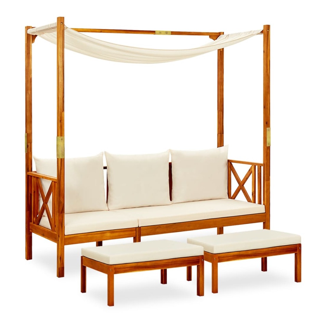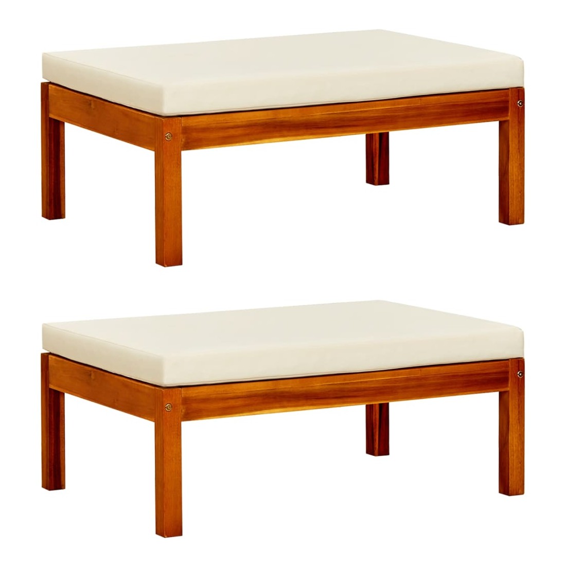 Ce banc en bois avec repose-pieds et coussins allie style et fonctionnalité et ajoute une touche de charme rustique à votre espace de vie extérieur. Fabriqué à partir de bois d'acacia massif avec une finition à l'huile, le lit de jour est résistant aux intempéries, très durable et facile à nettoyer avec un chiffon humide. L'ensemble contient 2 repose-pieds, ce qui est un excellent choix pour vous détendre et profiter du beau temps, faire une sieste ou discuter avec votre famille ou vos amis. De plus, le coussin inclus est plus qu'un supplément pratique ; il a également une fonction décorative. Remarque : afin de prolonger la durée de vie des meubles d'extérieur, nous vous recommandons de les protéger avec une housse imperméable.