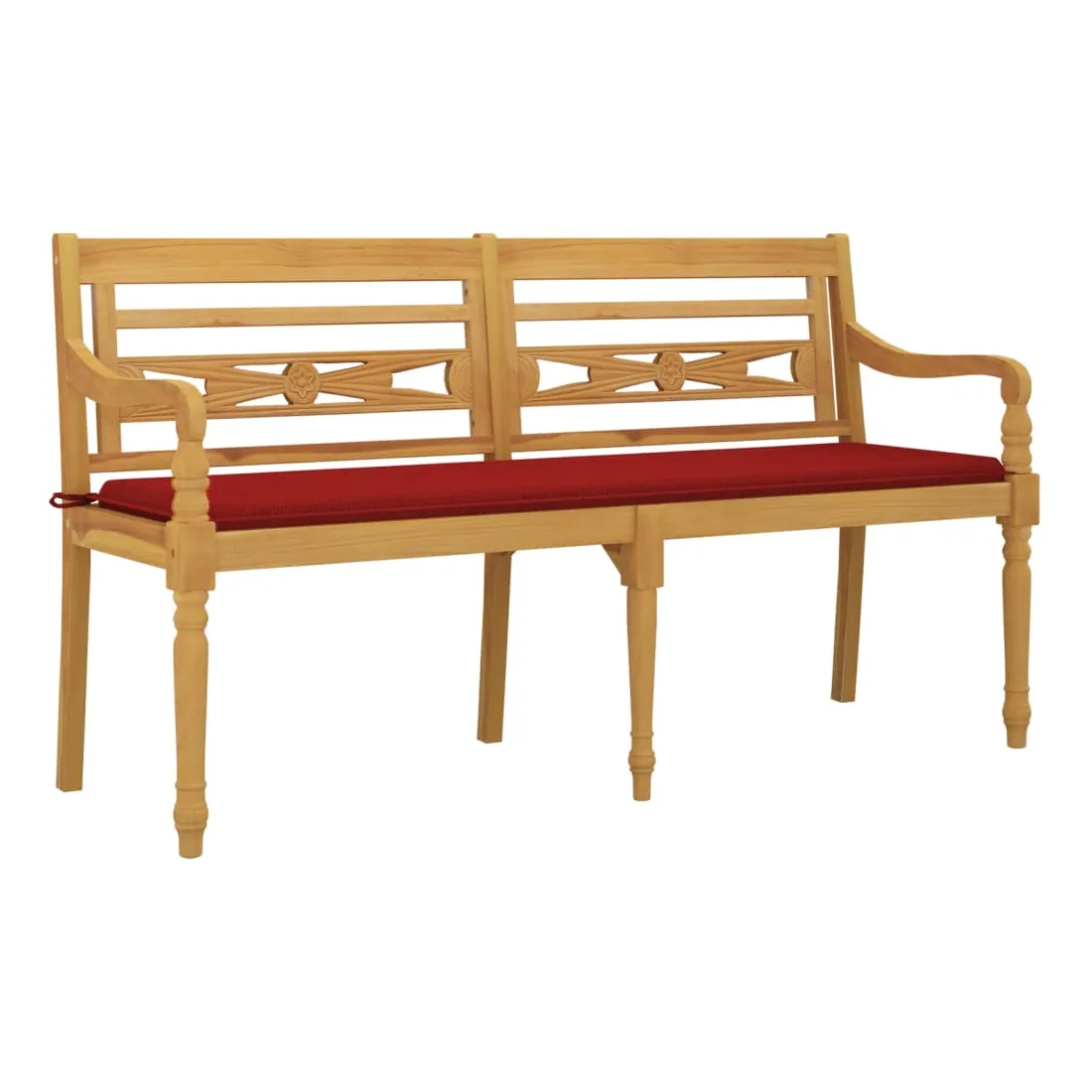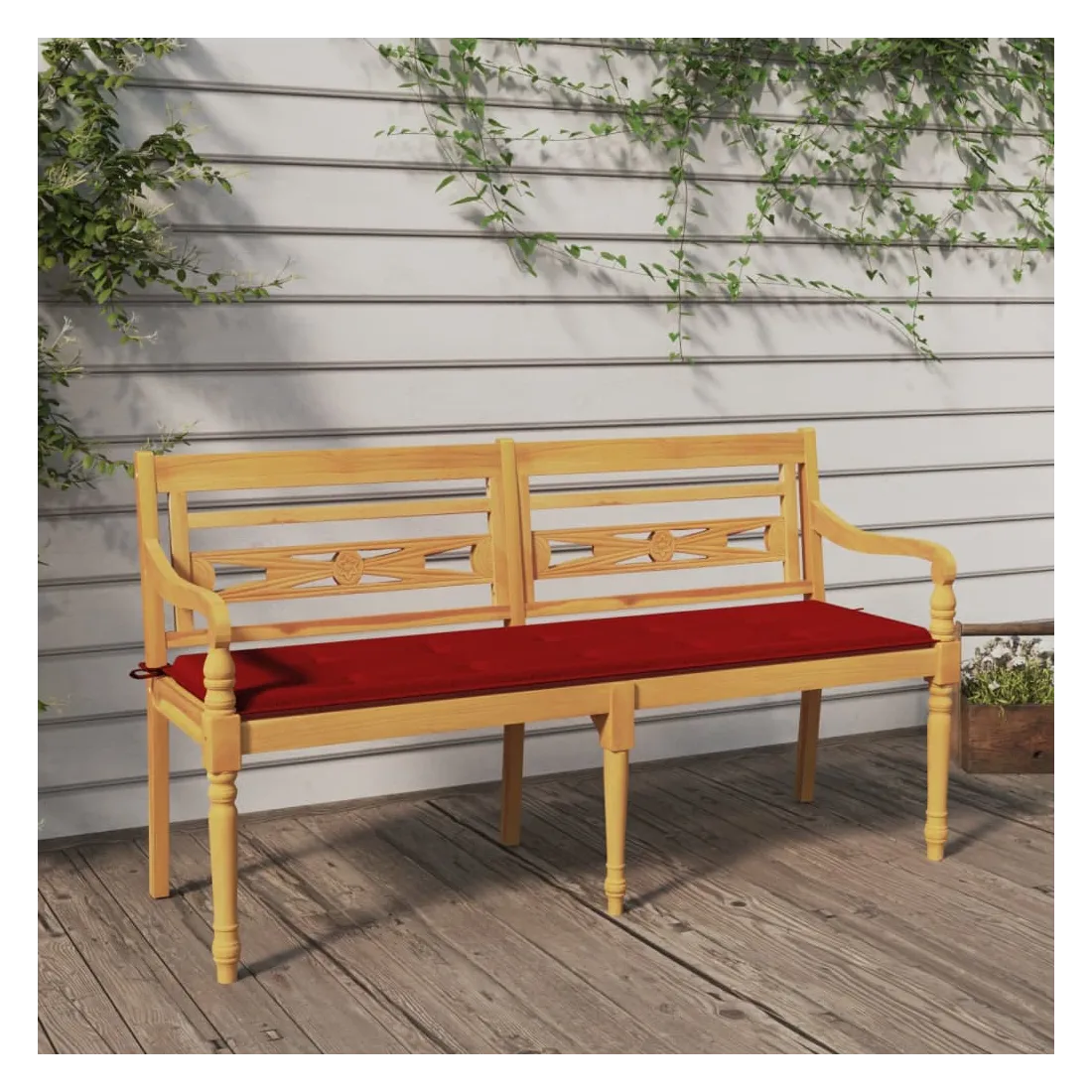 Ajoutez une touche d'élégance à votre espace de vie extérieur avec ce banc Batavia en bois avec un coussin ! Bois de teck naturel : le bois de teck massif est un matériau naturel magnifique. Il a été chevronné, séché au four, puis sablé finement pour lui donner une apparence très lisse. Le bois de teck est connu pour sa résistance exceptionnelle et sa résistance aux intempéries.Tissu pratique : le tissu présente un aspect simple et épuré, et il est respirant et durable.Expérience d'assise confortable : le banc comprend des accoudoirs et un dossier, avec le coussin inclus, offrant une expérience d'assise confortable.Design élégant : le siège magnifiquement sculpté ajoutera une touche de charme rustique à votre jardin et convient parfaitement pour vous détendre à l'extérieur avec vos amis et votre famille. Remarque :Chaque produit est livré avec un manuel de montage dans la boîte pour un montage facile.Afin de prolonger la durée de vie de votre mobilier d'extérieur, nous vous recommandons de le protéger avec une housse imperméable.