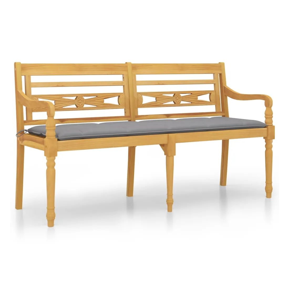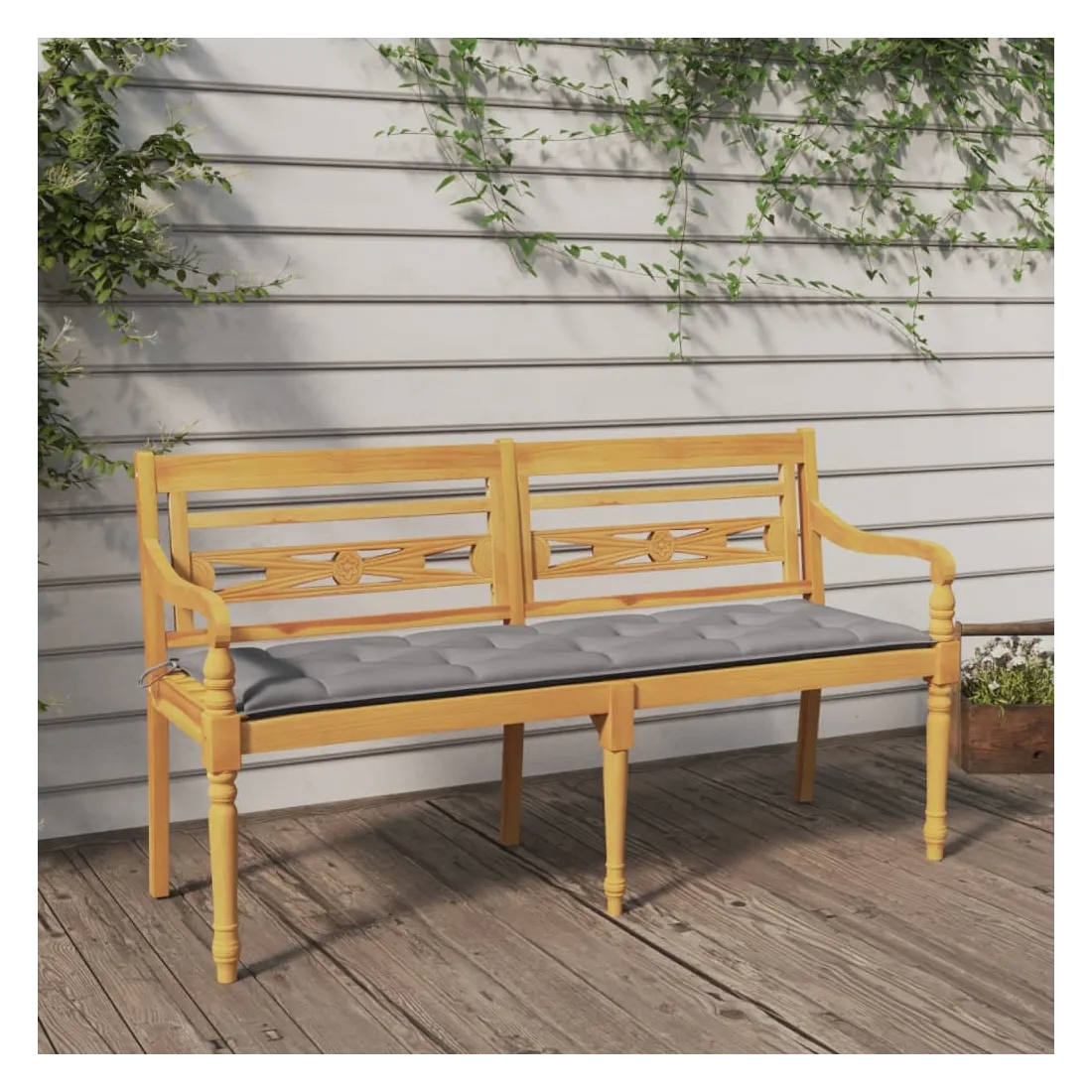 Ajoutez une touche d'élégance à votre espace de vie extérieur avec ce banc Batavia en bois avec un coussin ! Bois de teck naturel : le bois de teck massif est un matériau naturel magnifique. Il a été chevronné, séché au four, puis sablé finement pour lui donner une apparence très lisse. Le bois de teck est connu pour sa résistance exceptionnelle et sa résistance aux intempéries.Tissu pratique : le tissu présente un aspect simple et épuré, et il est respirant et durable.Expérience d'assise confortable : le banc comprend des accoudoirs et un dossier, avec le coussin inclus, offrant une expérience d'assise confortable.Design élégant : le siège magnifiquement sculpté ajoutera une touche de charme rustique à votre jardin et convient parfaitement pour vous détendre à l'extérieur avec vos amis et votre famille. Remarque :Chaque produit est livré avec un manuel de montage dans la boîte pour un montage facile.Afin de prolonger la durée de vie de votre mobilier d'extérieur, nous vous recommandons de le protéger avec une housse imperméable.