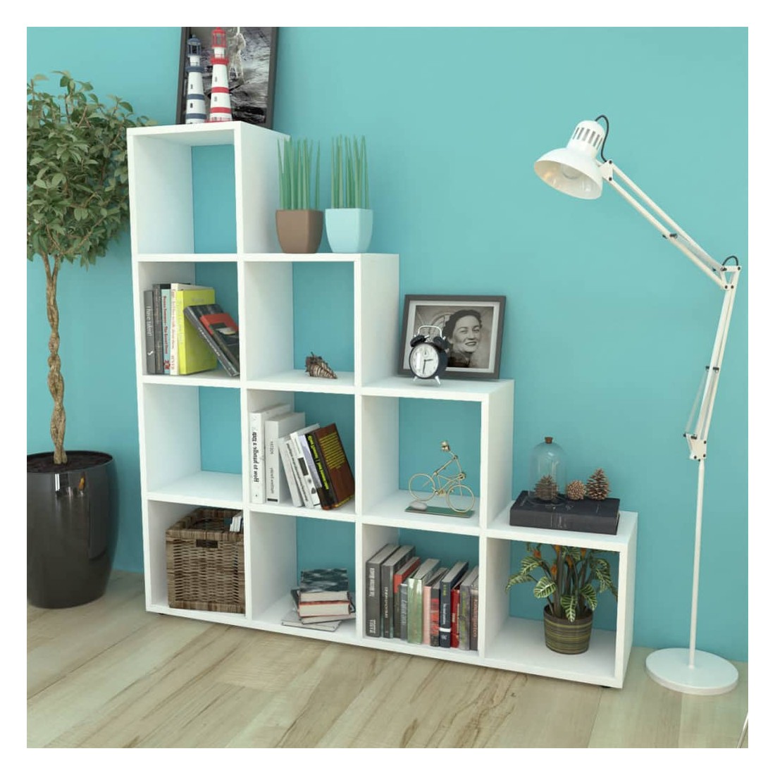 Cette bibliothèque, avec sa structure unique inspirée par un escalier fonctionnel, deviendra le point central de toute pièce. Cette bibliothèque étonnante comporte 10 compartiments ouverts qui constituent l'endroit idéal pour exposer des objets tels que des livres, des objets de collection, des photos, des récompenses, des plantes en pot, etc. Composée de matériaux de haute qualité , la bibliothèque est très solide et durable. La livraison comprend également des accessoires d'assemblage. L'assemblage est très facile.