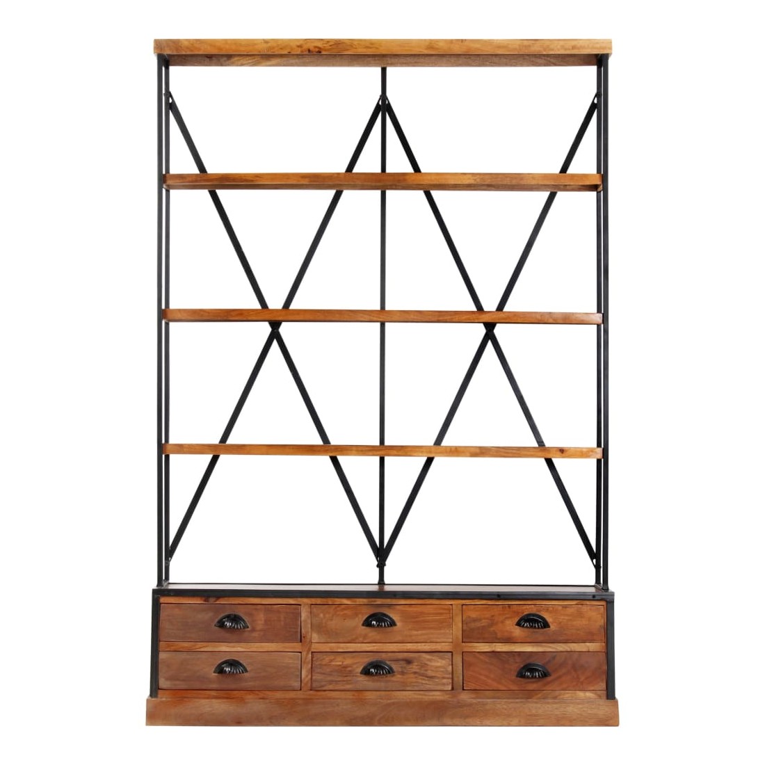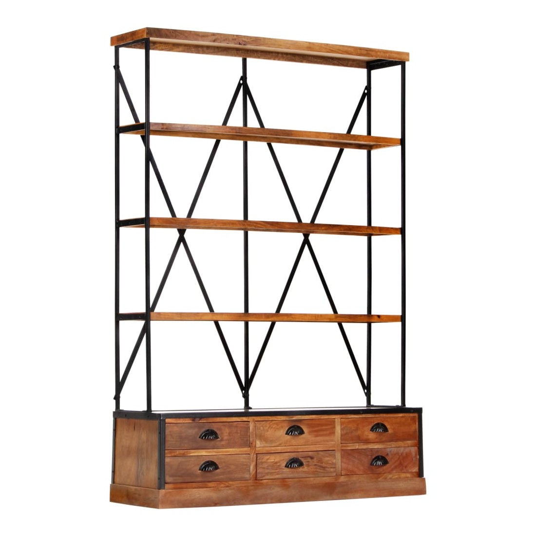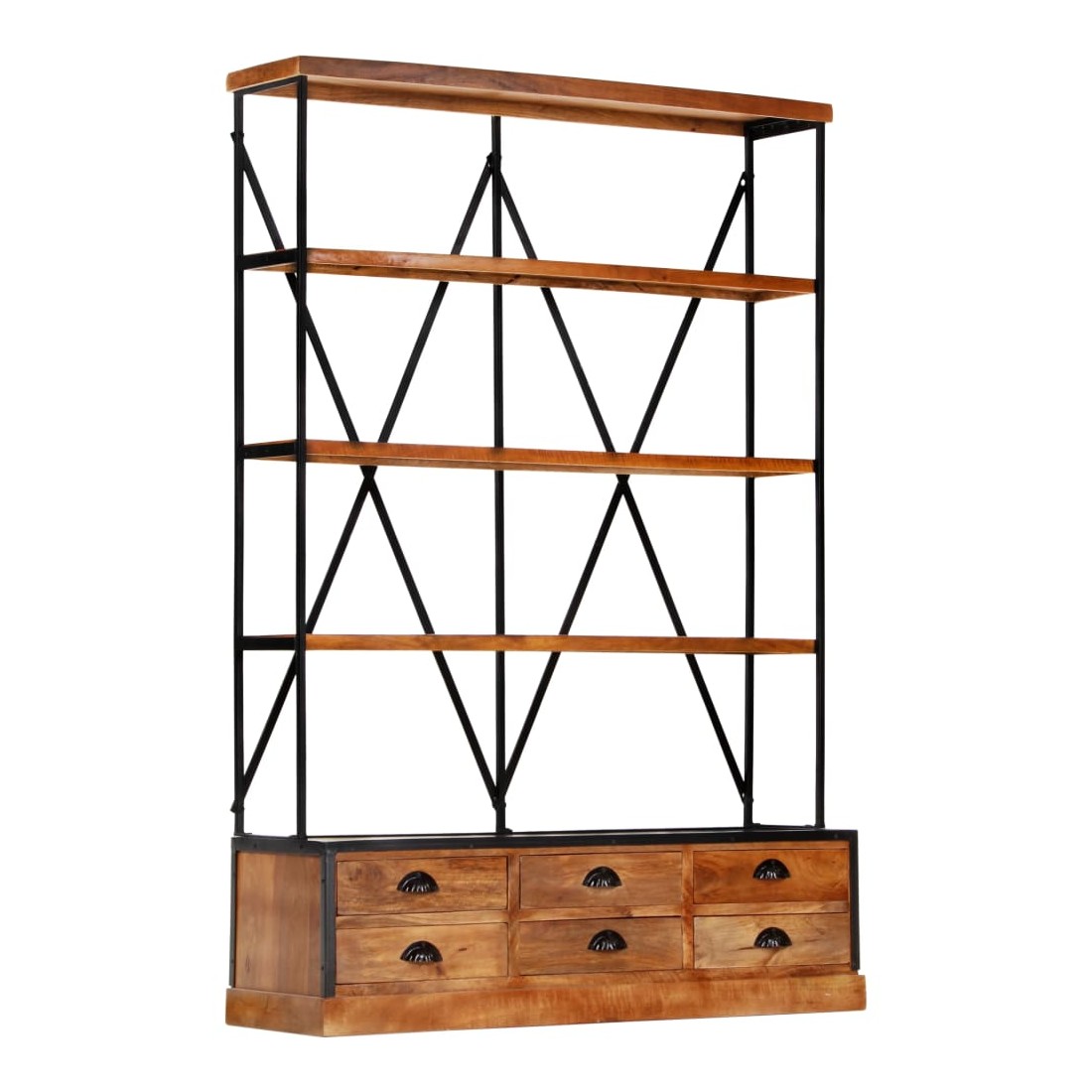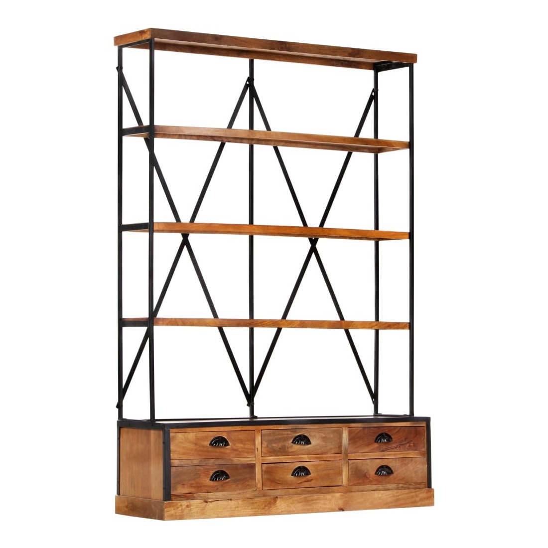 À la fois élégante et sophistiquée, cette bibliothèque à 4 étagères avec 6 tiroirs rappelle le charme vintage et le style industriel avec son cadre en bois de manguier massif et en acier enduit de poudre. Cette bibliothèque constitue une solution idéale pour stocker et afficher votre collection de livres, vos magazines, vos documents ainsi que des objets de décoration tels que des cadres photo et des objets de collection. La bibliothèque a un cadre en acier robuste enduit de poudre qui lui donne un look industriel. Fabriqués en bois de manguier massif, les étagères et les tiroirs sont stables, durables et esthétiques et dégagent un style rétro spectaculaire. Chaque étape du processus est réalisée avec le plus grand soin, que ce soit le polissage, la peinture ou le laquage. L'artisanat et les beaux grains de bois font de chaque meuble un objet unique et légèrement différent l'un de l'autre. Le buffet est facile à assembler. Remarque importante : les couleurs varient d'une pièce à l'autre, ce qui rend chacune de nos bibliothèques unique. La livraison est aléatoire, ce qui garantit l'exclusivité et l'individualité de votre produit.