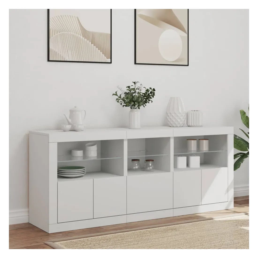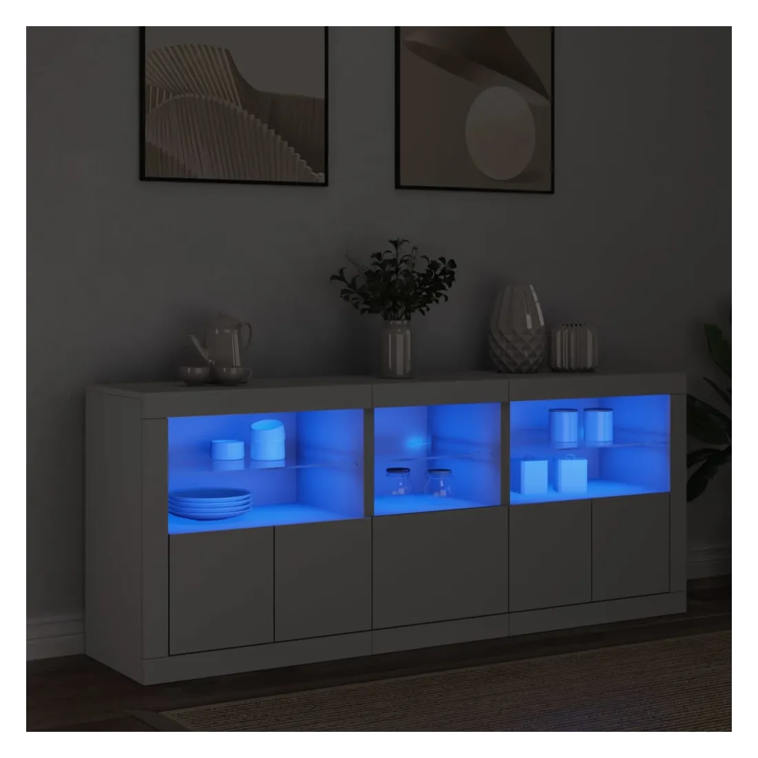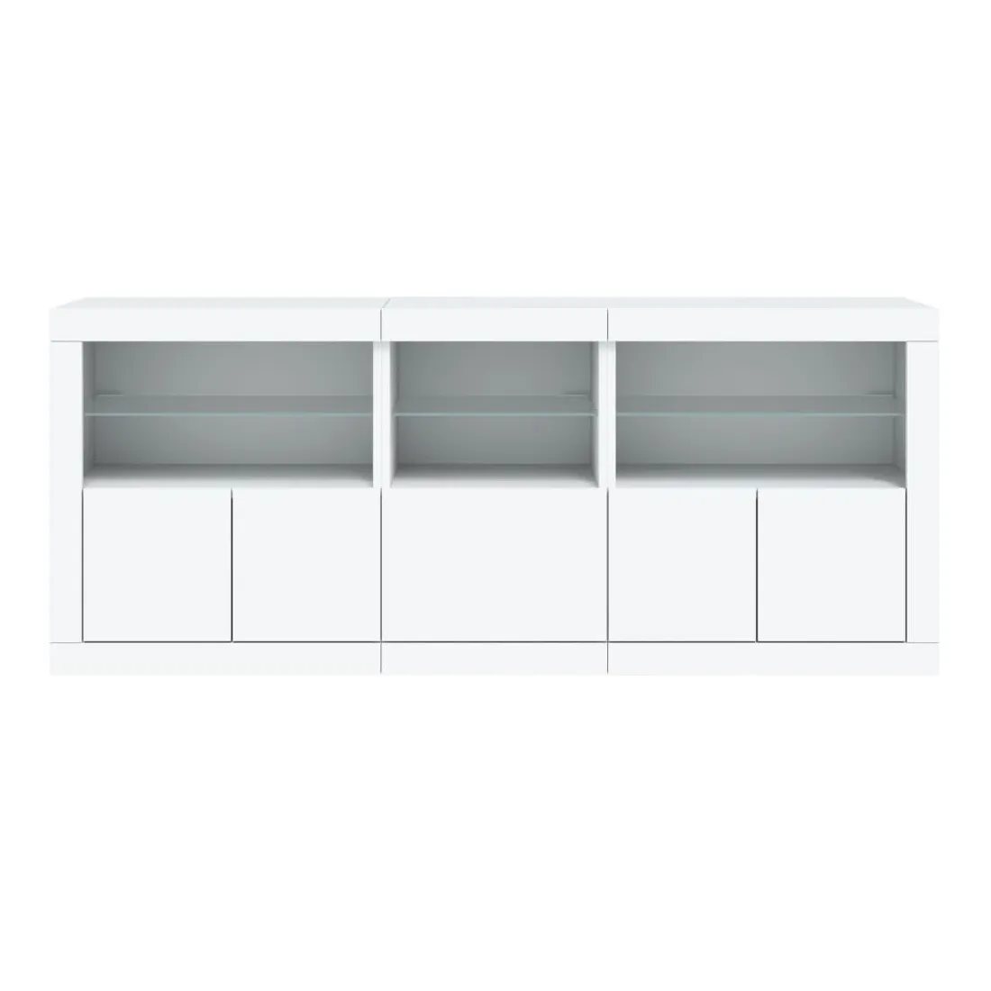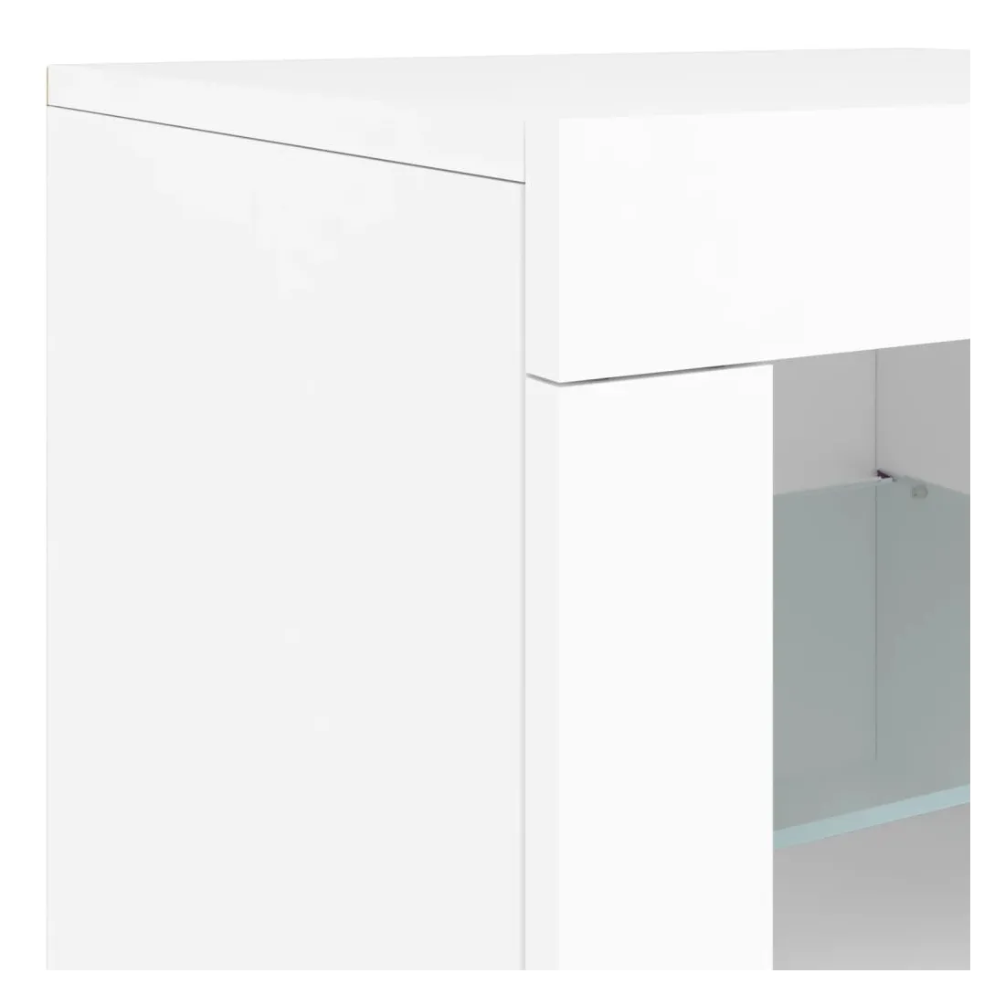 Décorez votre pièce avec ce buffet moderne avec éclairage LED, il s'harmonise facilement avec les meubles de tout style de votre maison. Matériau durable : le bois d'ingénierie est d'une qualité exceptionnelle avec une surface lisse et présente également résistance, stabilité et résistance à l'humidité.Lumières LED RVB : le buffet est équipé de lumières LED RVB vibrantes. Avec divers menus personnalisables, vous pouvez changer sans effort la couleur des lumières et même les régler automatiquement. Ces lumières LED renforcent non seulement l'aspect contemporain du buffet, mais aussi son attrait pour la mode.Grand espace de rangement : l'armoire de rangement offre beaucoup d'espace pour garder vos objets du quotidien bien rangés et facilement accessibles.Fonction d'exposition : la partie supérieure robuste de l'armoire d'entrée est idéale pour exposer des objets décoratifs, des cadres photo ou des plantes en pot.Porte pratiques : gardez vos essentiels à l'abri de la poussière en les cachant derrière les portes de l'armoire latérale. Bon à savoir :Ce produit est doté d'un connecteur USB qui nécessite une source d'alimentation certifiée de USB 5V (non incluse). Attention :Pour éviter qu'il ne soit renversé, ce produit doit être utilisé avec le dispositif de fixation au mur fourni.