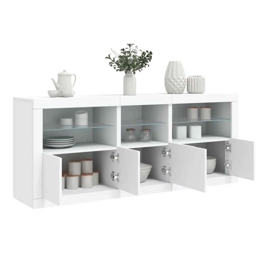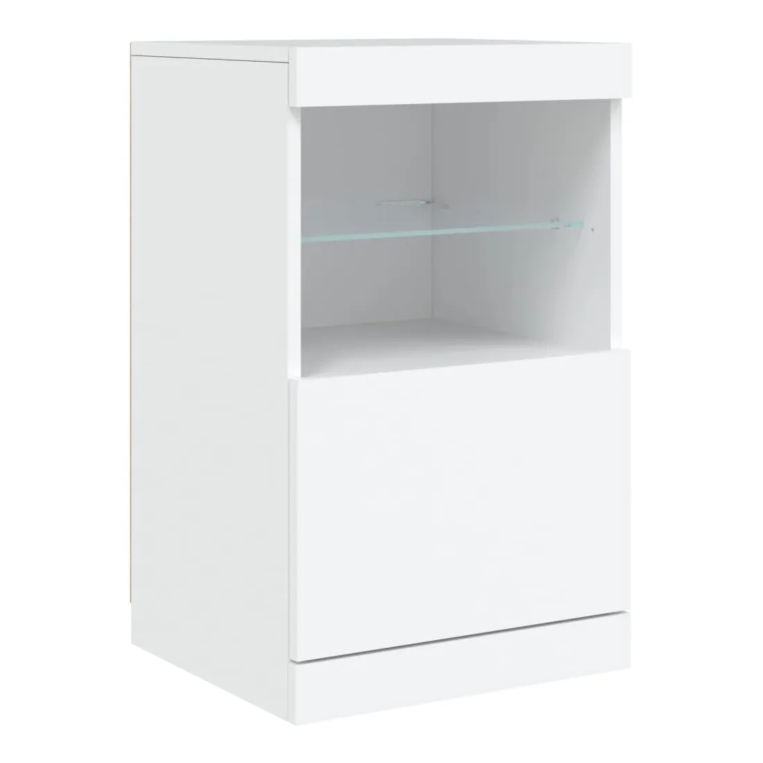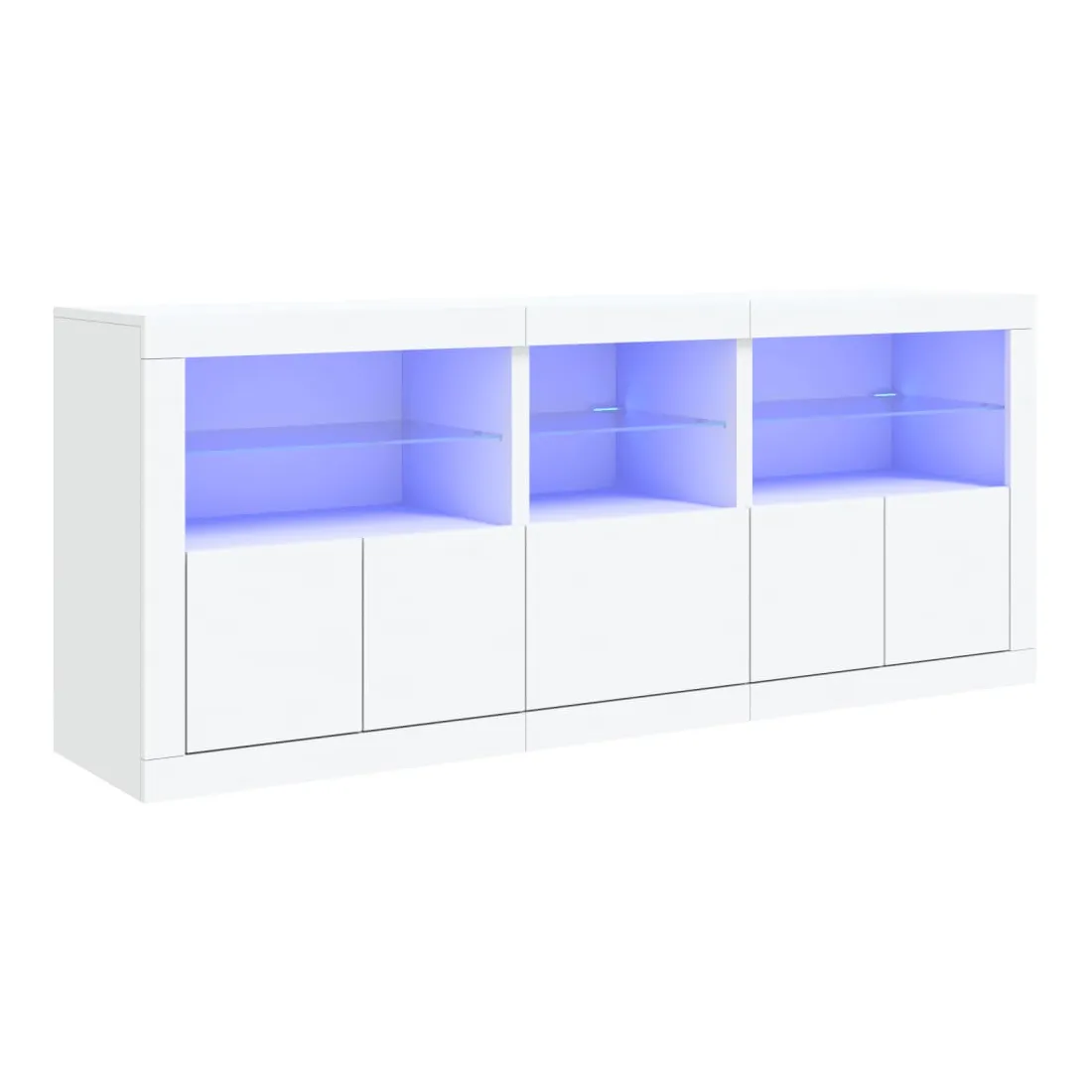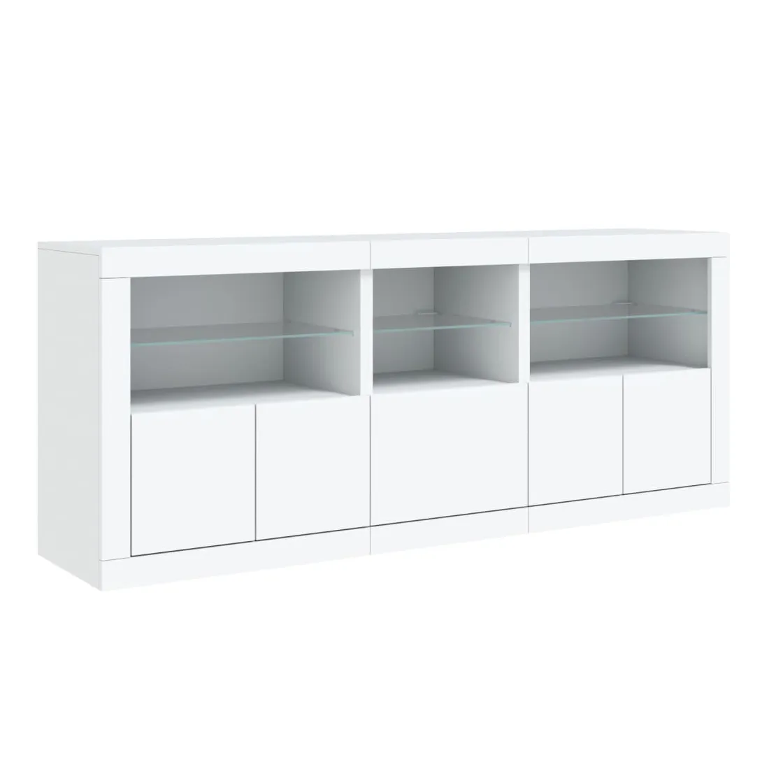 Décorez votre pièce avec ce buffet moderne avec éclairage LED, il s'harmonise facilement avec les meubles de tout style de votre maison. Matériau durable : le bois d'ingénierie est d'une qualité exceptionnelle avec une surface lisse et présente également résistance, stabilité et résistance à l'humidité.Lumières LED RVB : le buffet est équipé de lumières LED RVB vibrantes. Avec divers menus personnalisables, vous pouvez changer sans effort la couleur des lumières et même les régler automatiquement. Ces lumières LED renforcent non seulement l'aspect contemporain du buffet, mais aussi son attrait pour la mode.Grand espace de rangement : l'armoire de rangement offre beaucoup d'espace pour garder vos objets du quotidien bien rangés et facilement accessibles.Fonction d'exposition : la partie supérieure robuste de l'armoire d'entrée est idéale pour exposer des objets décoratifs, des cadres photo ou des plantes en pot.Porte pratiques : gardez vos essentiels à l'abri de la poussière en les cachant derrière les portes de l'armoire latérale. Bon à savoir :Ce produit est doté d'un connecteur USB qui nécessite une source d'alimentation certifiée de USB 5V (non incluse). Attention :Pour éviter qu'il ne soit renversé, ce produit doit être utilisé avec le dispositif de fixation au mur fourni.