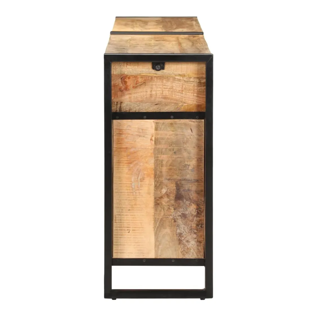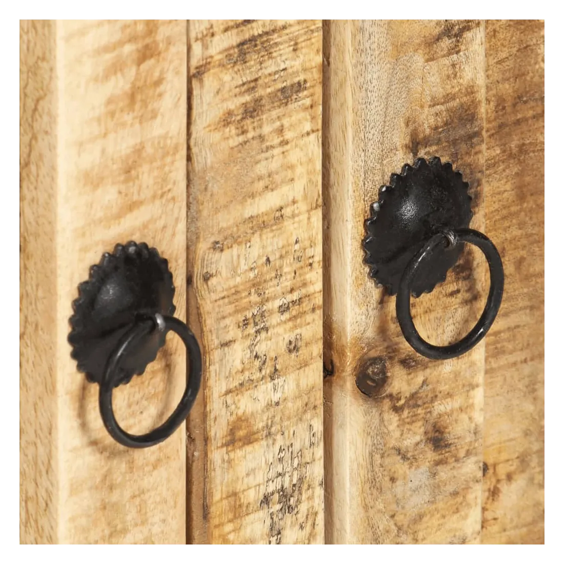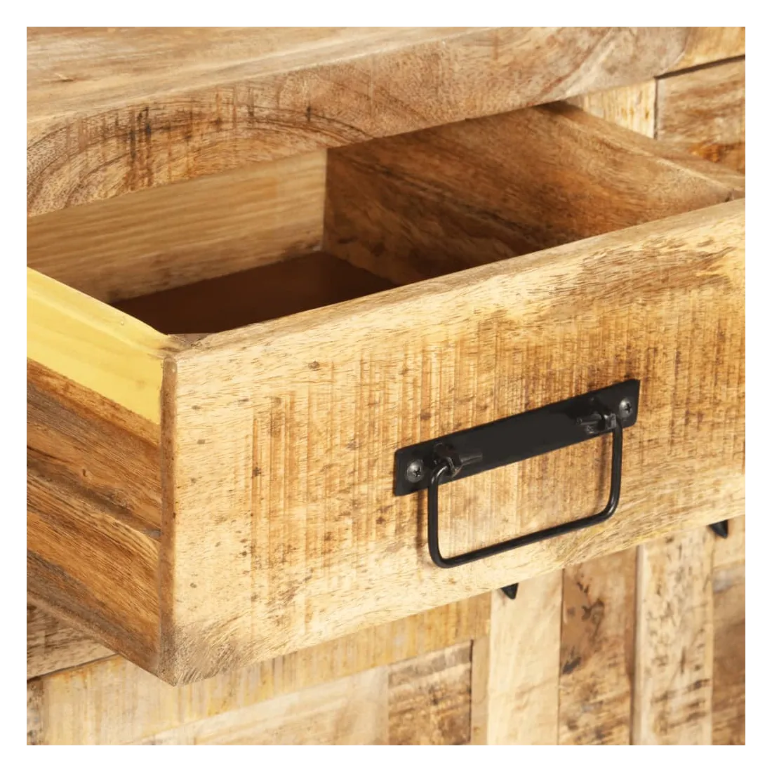 Ce buffet en bois sera certainement un supplément pratique et accrocheur dans votre maison. Bois de manguier massif : ce meuble de rangement est fait de bois de manguier massif, un bois dur tropical. Il a la force de soutenir le poids et de résister à l'usure du temps.Fait entièrement à la main : l'artisanat exquis et les beaux grains de bois rendent chaque pièce distinctive et légèrement différente l'une de l'autre.Cadre robuste et stable :le cadre en acier enduit de poudre contribue à la structure stable et robuste.Grand espace de rangement :l'armoire en bois comprend 2 compartiments avec portes et 4 tiroirs pour ranger divers objets. Remarque :Les couleurs varient d'une pièce à l'autre, rendant chaque pièce unique. La livraison est aléatoire. Attention :Afin d'éviter qu'il ne bascule, ce produit doit être utilisé avec le dispositif de fixation murale fourni