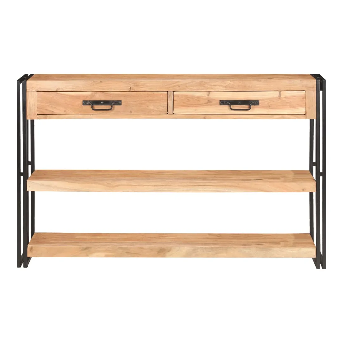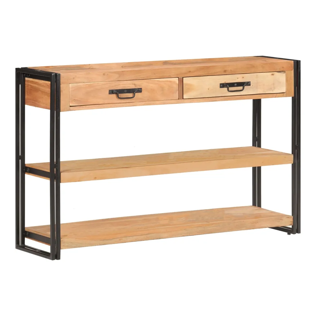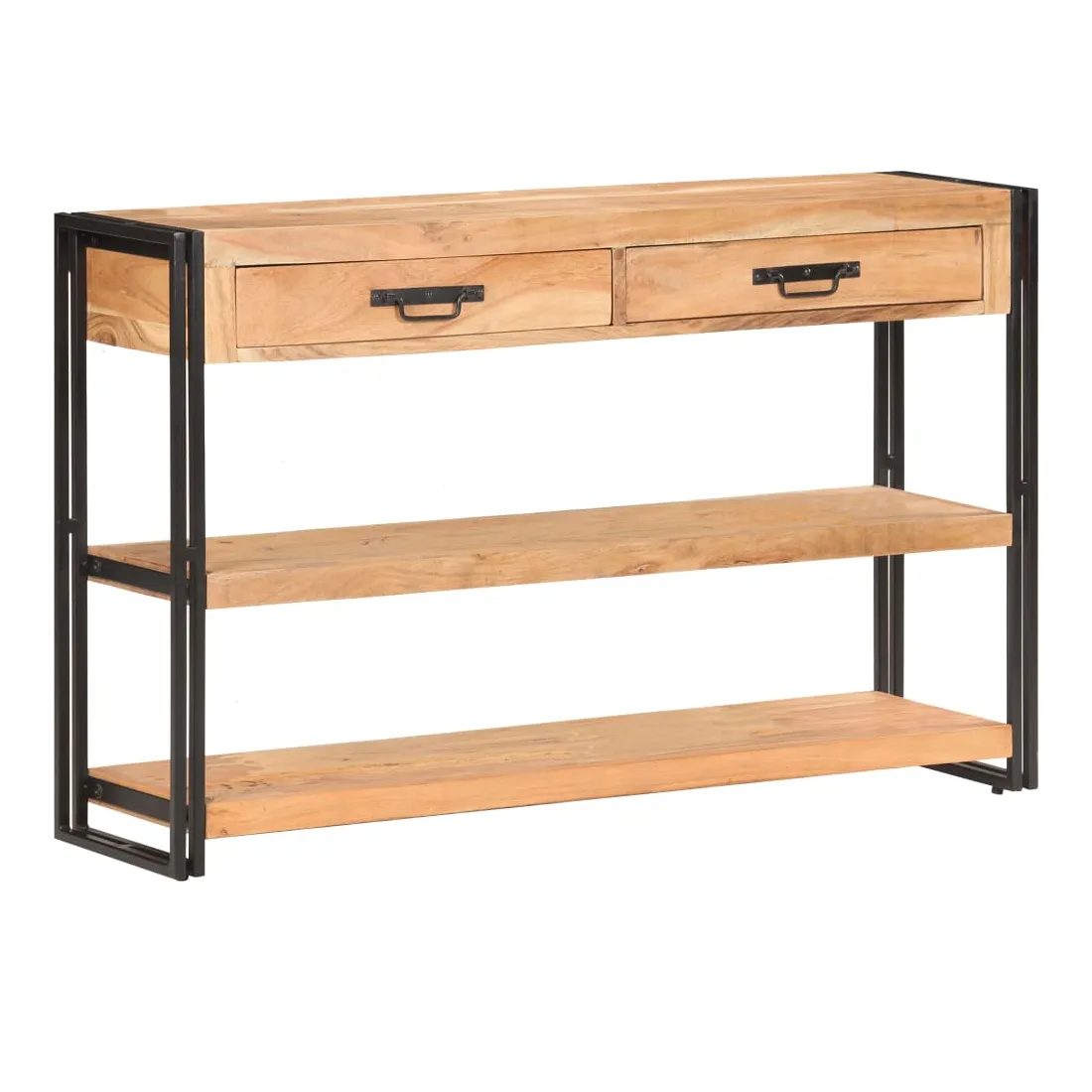 Créez une maison rangée avec cet élégant buffet en bois ! C'est un complément vraiment décoratif à votre maison. Cette armoire de rangement est faite de bois d'acacia massif, un bois dur aux grains denses. Cette armoire de rangement au design magnifique est stable, durable et attire l'attention. De plus, l'artisanat exquis et les belles veines du bois font chaque pièce légèrement différente l'une de l'autre. Le solide cadre en fer enduit de poudre ajoute à sa robustesse. Le dessus robuste est idéal pour afficher des objets décoratifs, comme des cadres photo ou des plantes en pot. De plus, la table console dispose de 2 tiroirs et de 2 étagères, de sorte que vous puissiez garder les livres, magazines et autres articles bien organisés et à portée de main. Remarque importante : les couleurs varient d'une pièce à l'autre, rendant chaque pièce unique. La livraison est aléatoire, garantissant l'exclusivité et l'individualité de votre produit.
