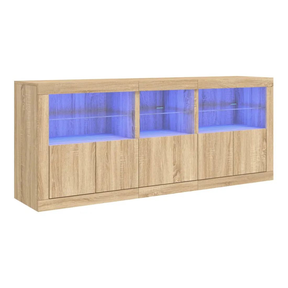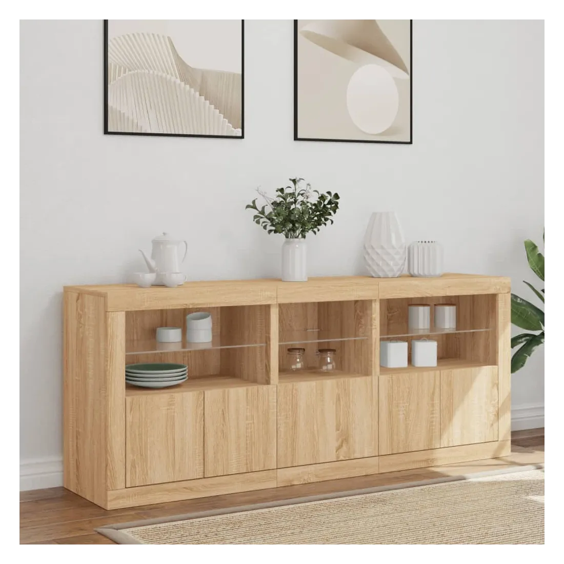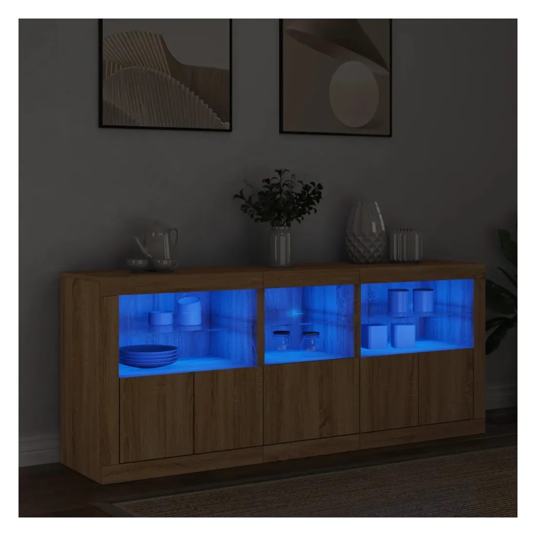 Décorez votre pièce avec ce buffet moderne avec éclairage LED, il s'harmonise facilement avec les meubles de tout style de votre maison. Matériau durable : le bois d'ingénierie est d'une qualité exceptionnelle avec une surface lisse et présente également résistance, stabilité et résistance à l'humidité.Lumières LED RVB : le buffet est équipé de lumières LED RVB vibrantes. Avec divers menus personnalisables, vous pouvez changer sans effort la couleur des lumières et même les régler automatiquement. Ces lumières LED renforcent non seulement l'aspect contemporain du buffet, mais aussi son attrait pour la mode.Grand espace de rangement : l'armoire de rangement offre beaucoup d'espace pour garder vos objets du quotidien bien rangés et facilement accessibles.Fonction d'exposition : la partie supérieure robuste de l'armoire d'entrée est idéale pour exposer des objets décoratifs, des cadres photo ou des plantes en pot.Porte pratiques : gardez vos essentiels à l'abri de la poussière en les cachant derrière les portes de l'armoire latérale. Bon à savoir :Ce produit est doté d'un connecteur USB qui nécessite une source d'alimentation certifiée de USB 5V (non incluse). Attention :Pour éviter qu'il ne soit renversé, ce produit doit être utilisé avec le dispositif de fixation au mur fourni.