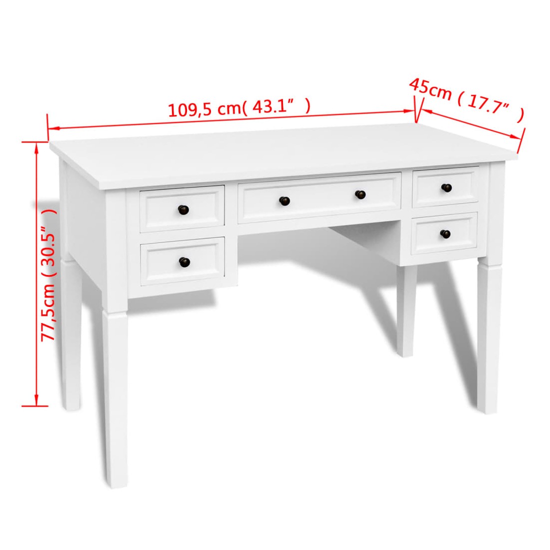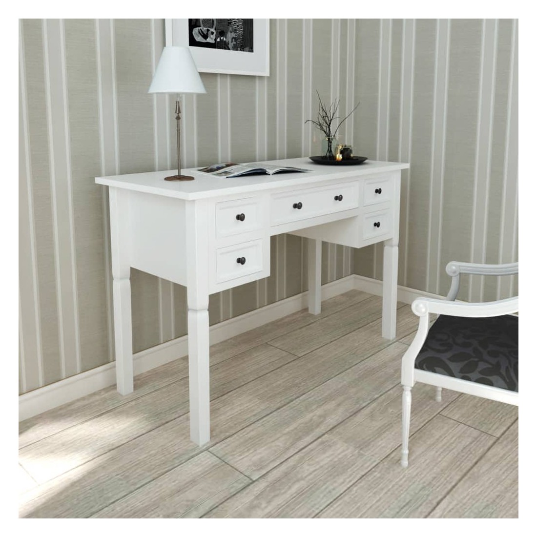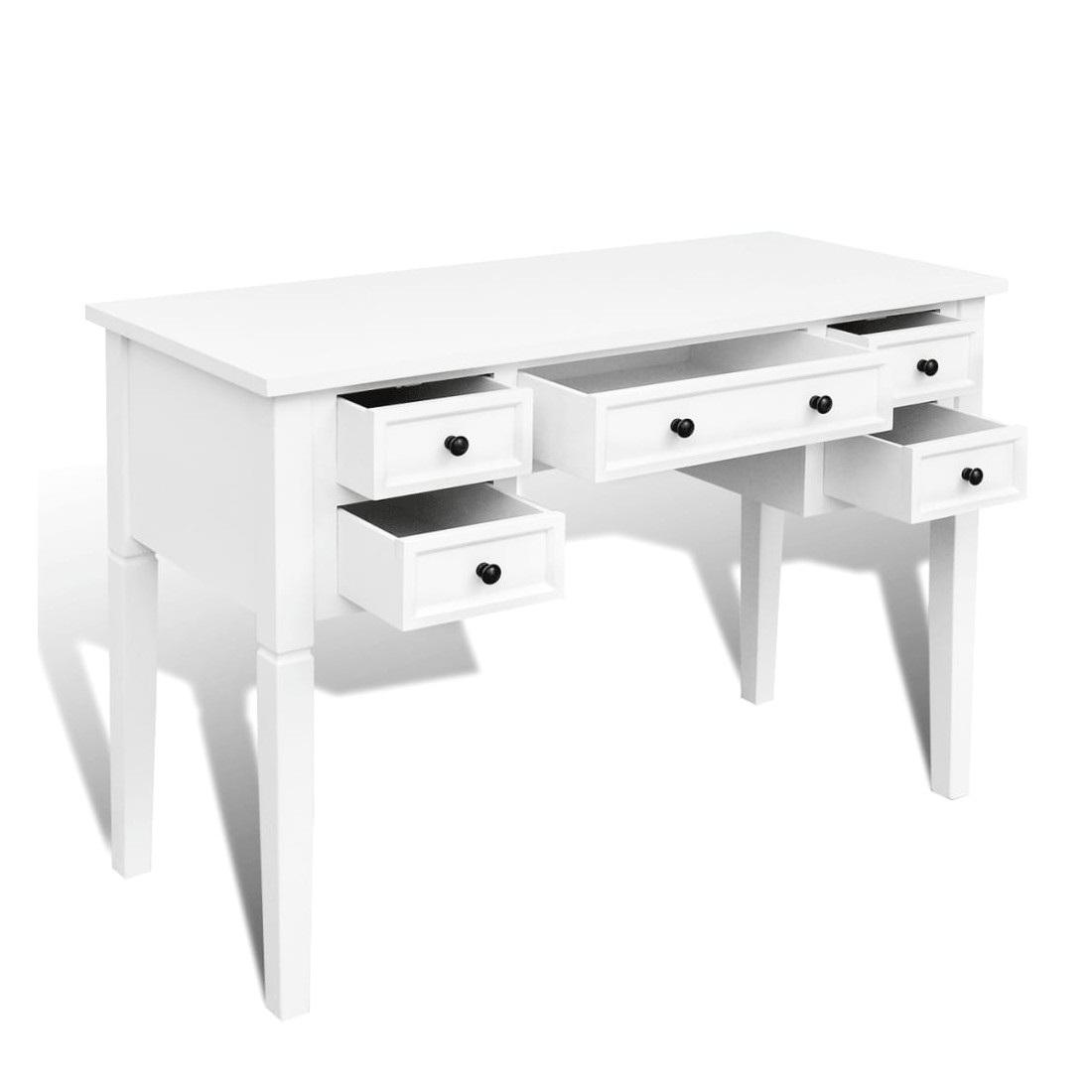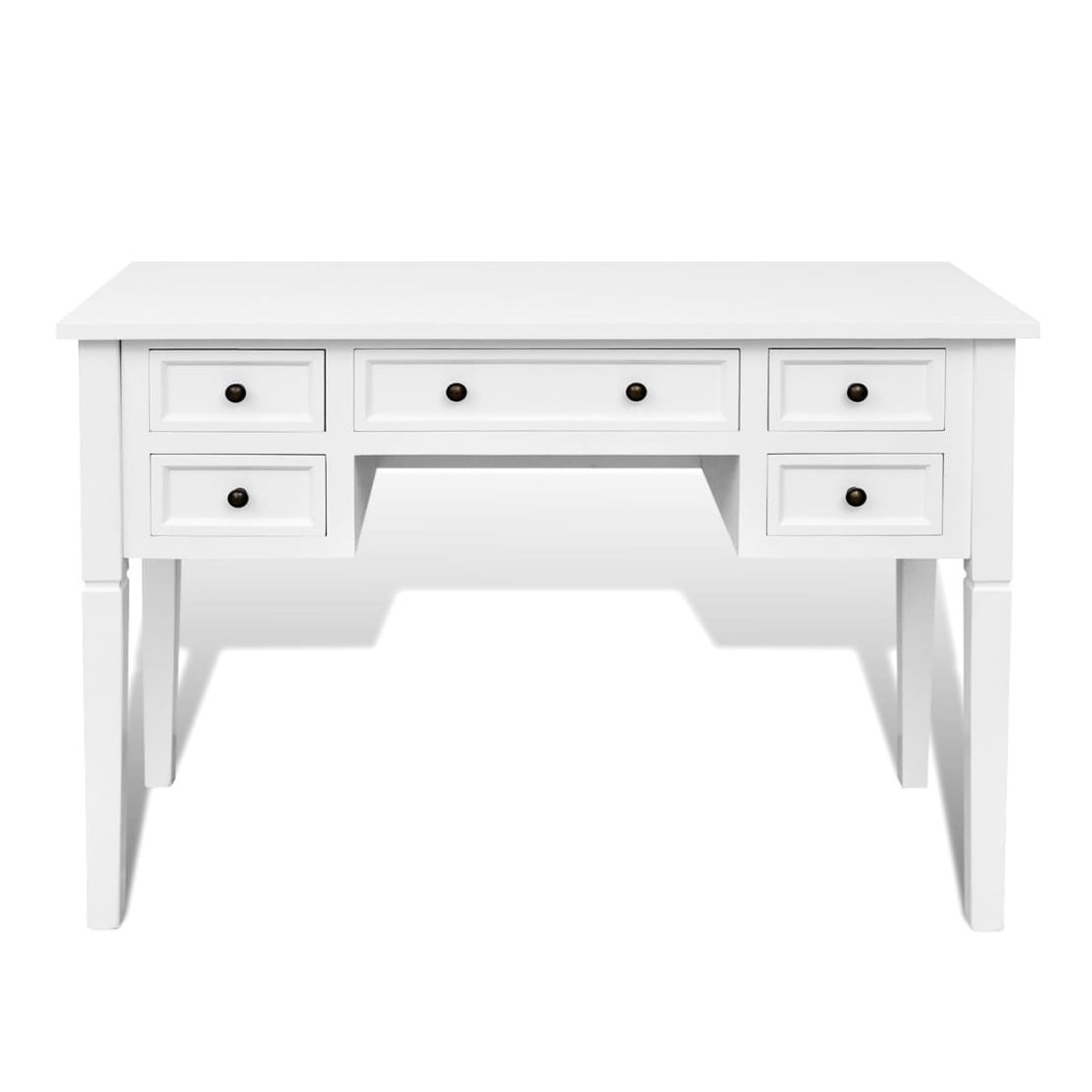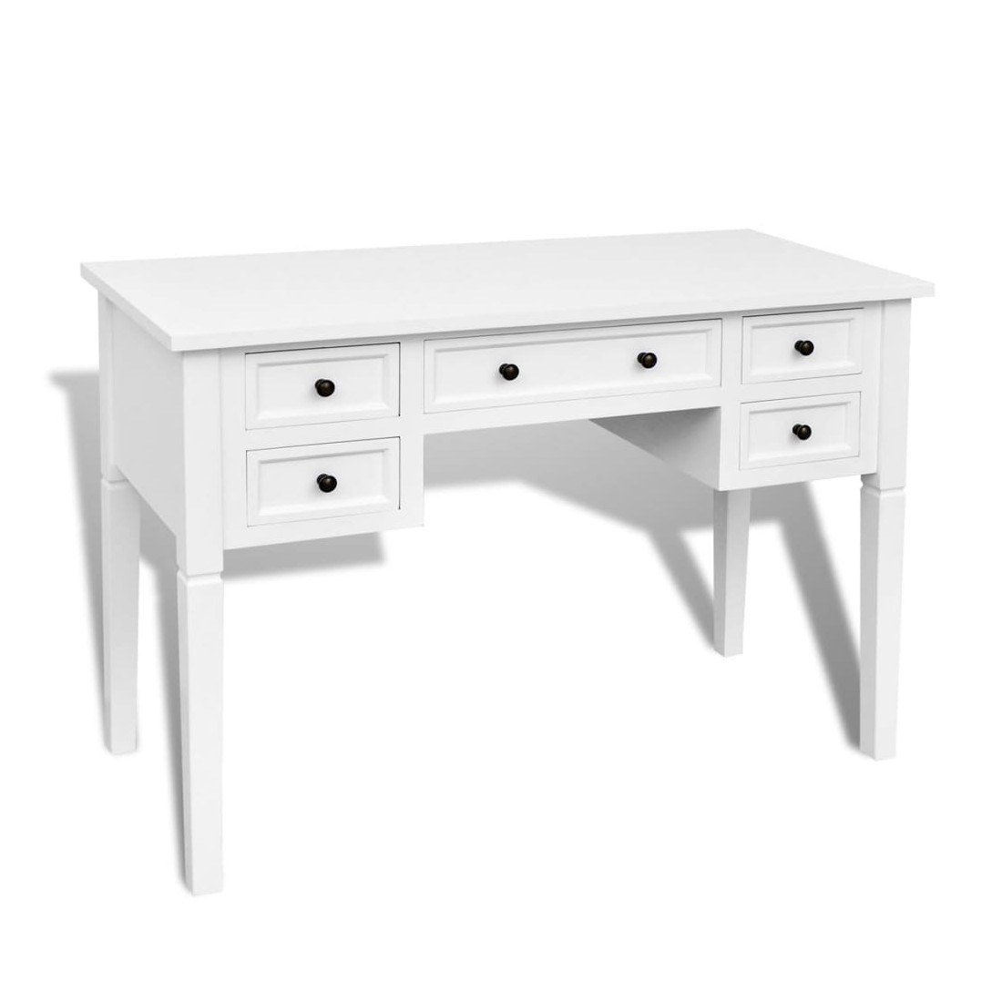 Ce bureau doté d'un design simple mais intemporel, ajoutera une touche romantique à votre bureau ou chambre. Ce bureau durable comporte cinq grands tiroirs à papeterie offrant assez d'espace pour stocker et organiser vos fichiers, papiers, documents et autres fournitures de bureau. Le bureau offre également suffisamment d'espace pour vos ornements ou autres effets personnels. Ce solide bureau peint en blanc est construit en MDF et en pin de haute qualité.
