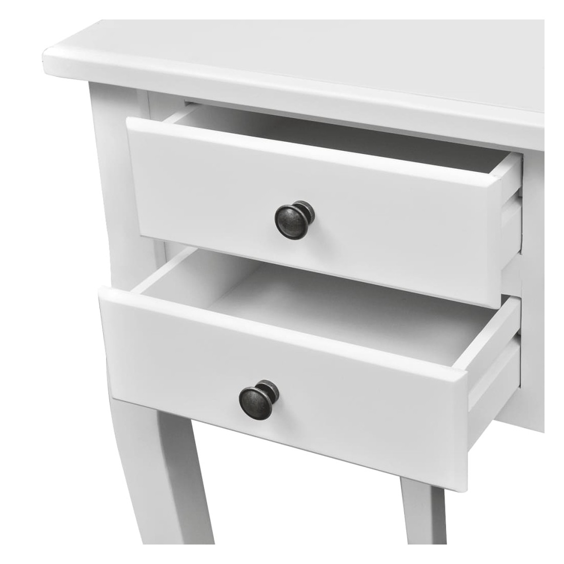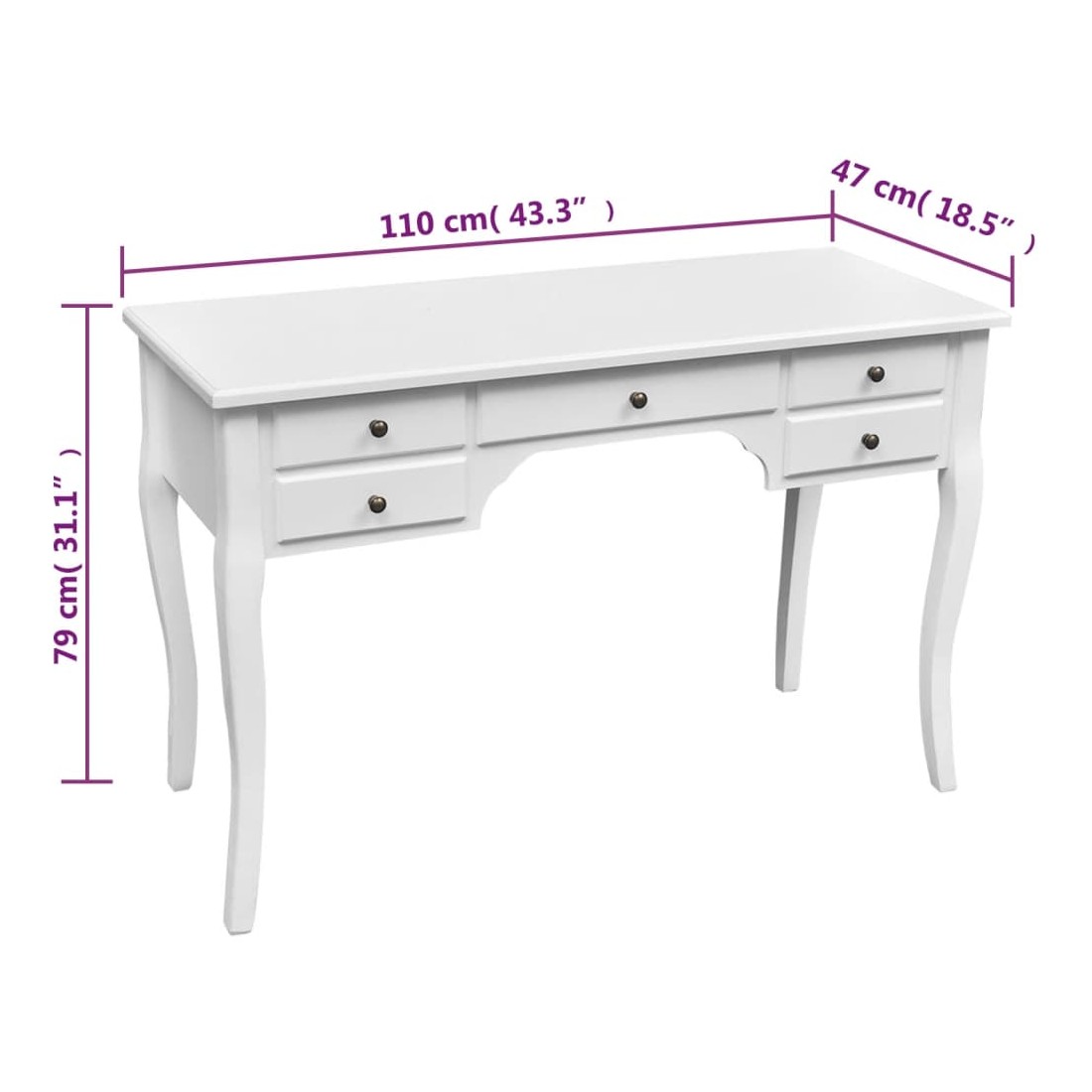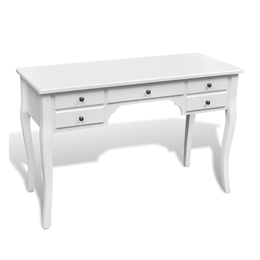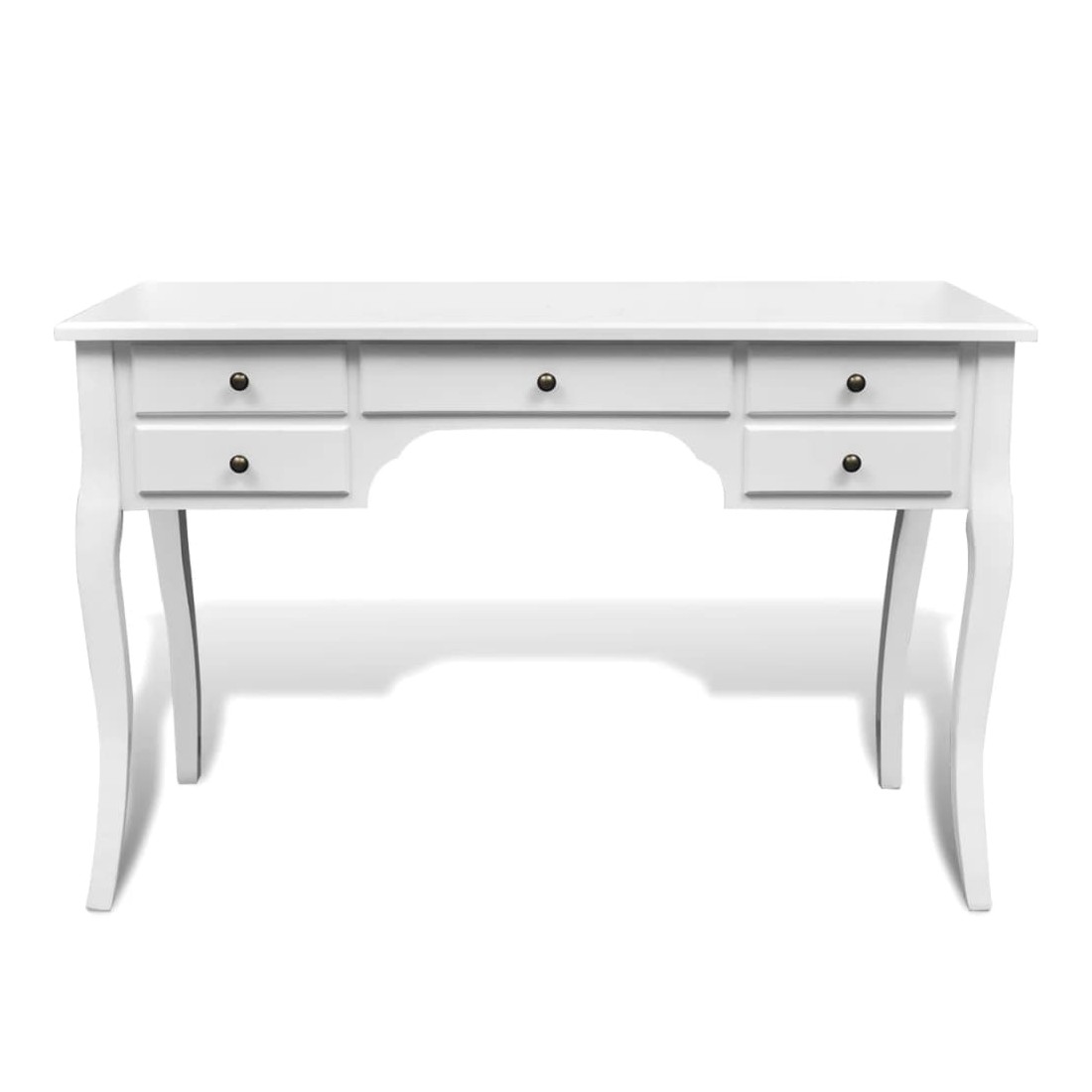Ce bureau français, au style antique, ajoutera une touche de sophistication à votre bureau de la maison ou du travail. Le bureau dispose de 5 tiroirs, qui offrent un grand espace de rangement pour les stylos, crayons, bibelots et les fournitures de bureau. Construit en MDF et bois de pin de haute qualité recouverts d'une peinture de finition blanche, ce bureau est très durable.