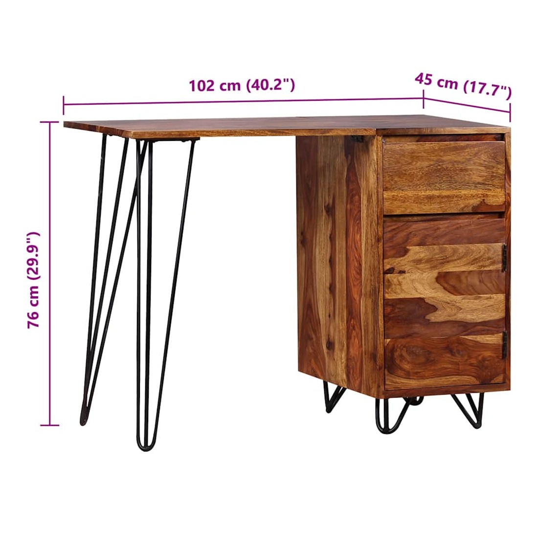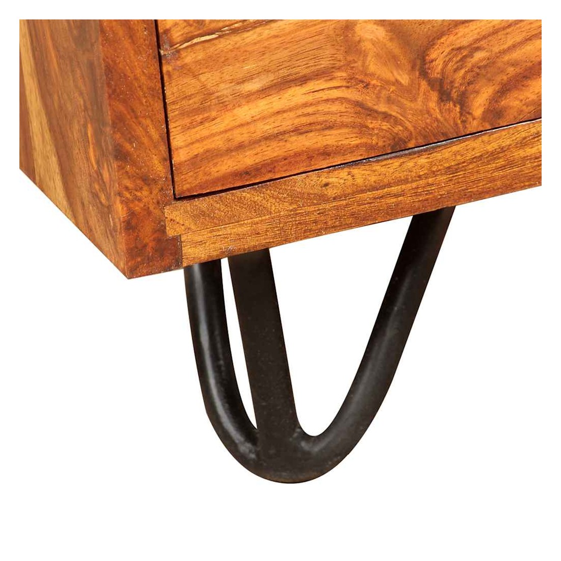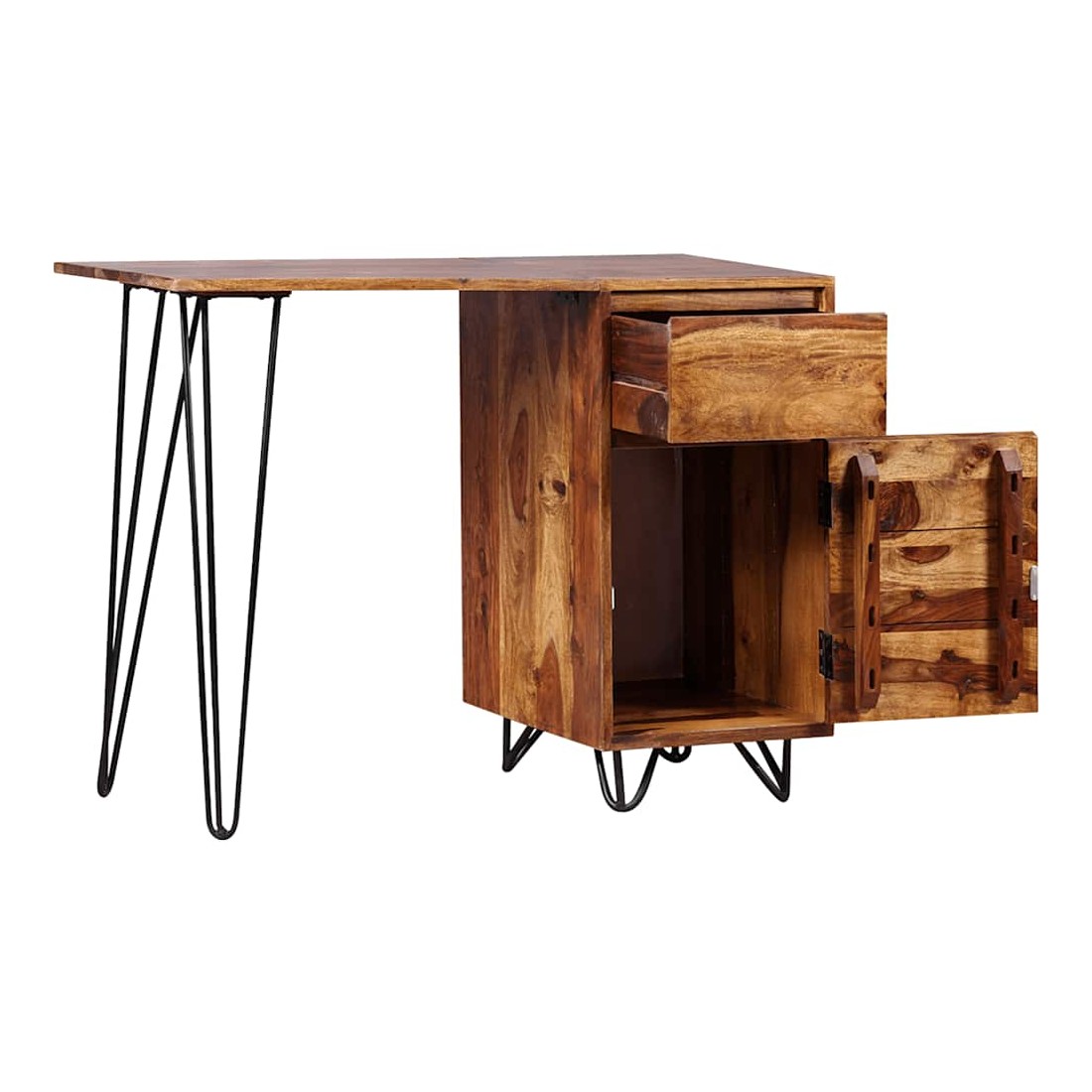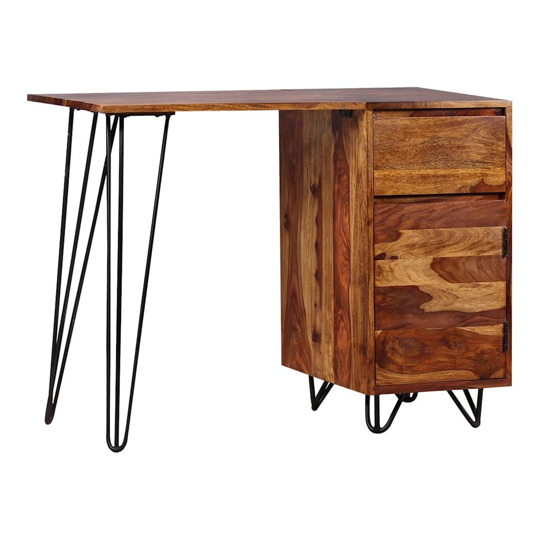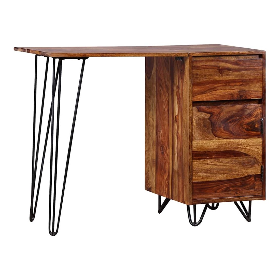 Cet élégant et pratique bureau sera un accessoire intemporel à votre décor intérieur. Il peut également servir de table console, de table d'appoint ou de table auxiliaire. Ce bureau a un design rétro frappant avec une touche industrielle. Il est fait de bois solide. Le bois, également connu sous le nom de palissandre ou de bois de rose est un bois dur tropical connu pour son grain riche. Ce bureau comprend un meuble et un tiroir, offrant suffisamment d'espace pour ranger et organiser vos dossiers, papiers, documents et autres fournitures de bureau. Le bureau offre également amplement d'espace pour vos objets décoratifs, tandis que les pieds robustes en acier contribuent à la construction robuste et ajoutent au style frais et industriel du bureau. Il est entièrement fait à la main et les beaux grains de bois rendent chaque meuble unique et légèrement différent l'un de l'autre. L'assemblage est facile. Remarque importante : les couleurs varient d'une pièce à l'autre, rendant chaque pièce unique. La livraison est aléatoire, garantissant l'exclusivité et l'individualité de votre produit.