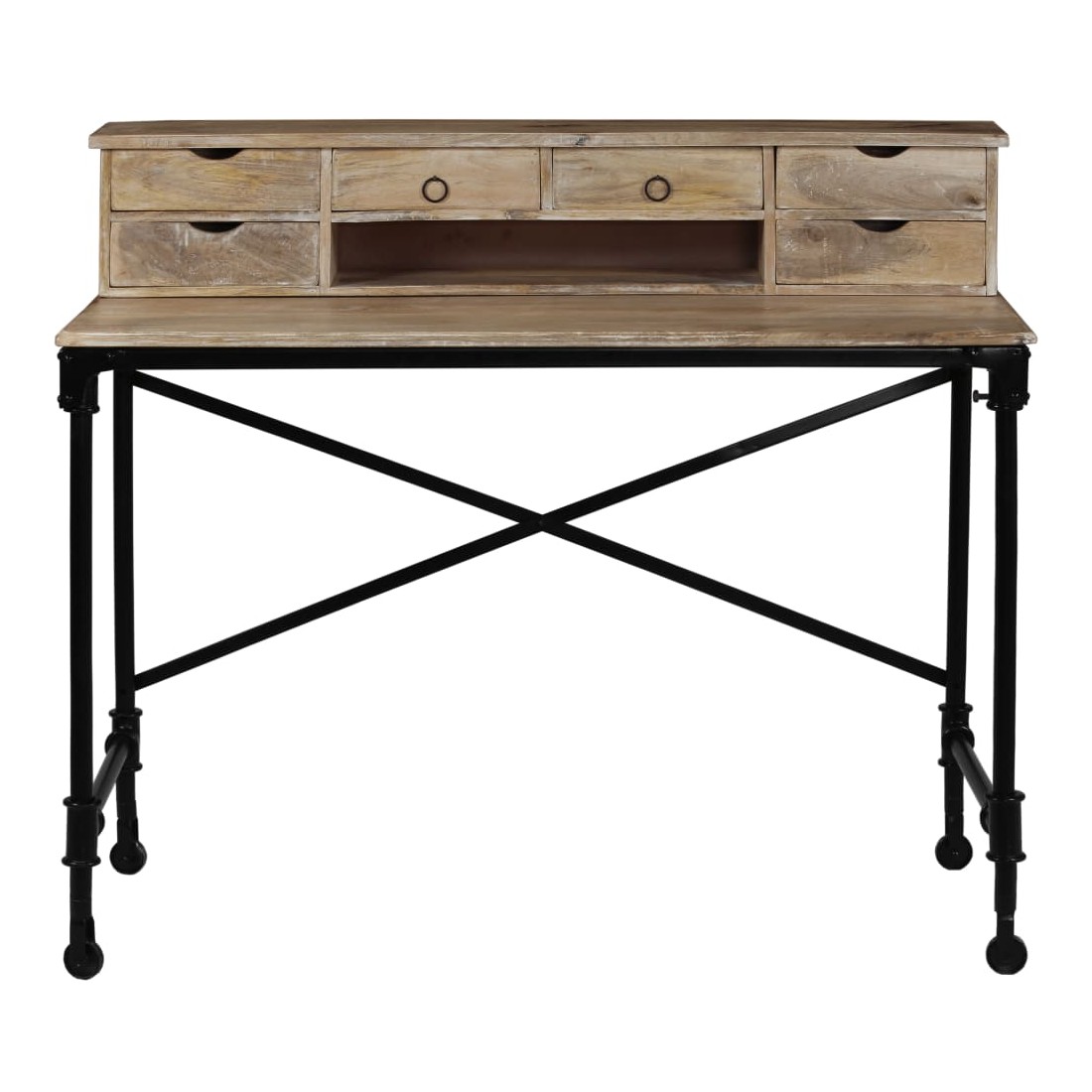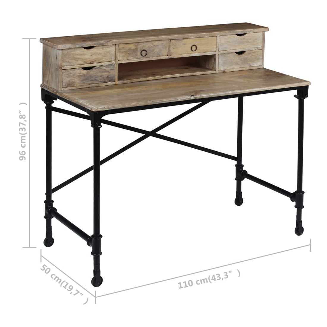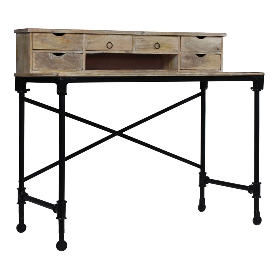 Cette table à écrire en bois de manguier massif, d'un style vintage spectaculaire, en fera un complément à la fois décoratif et pratique à votre décor. Le bureau est fait à la main en bois de manguier qui est solide, stable, durable et beau, et l'artisanat ajoute à son style rétro spectaculaire. Chaque étape du processus est réalisée avec le plus grand soin, qu'il s'agisse du polissage ou du laquage. Le travail artisanal et les belles veines de bois rendent chaque meuble unique et légèrement différent l'un de l'autre. Conçu avec 6 tiroirs et 1 petit compartiment, ce bureau vous offre un espace de rangement spacieux pour garder vos objets importants organisés et à portée de main. La partie supérieure peut être enlevée pour offrir une grande surface de table lisse. La structure robuste en acier ajoute également à sa stabilité et à son style industriel époustouflant. L'assemblage est facile. Remarque importante : Les couleurs et les grains peuvent varier d'une pièce à l'autre, ce qui rend chacun de nos bureaux unique ; la livraison est aléatoire.