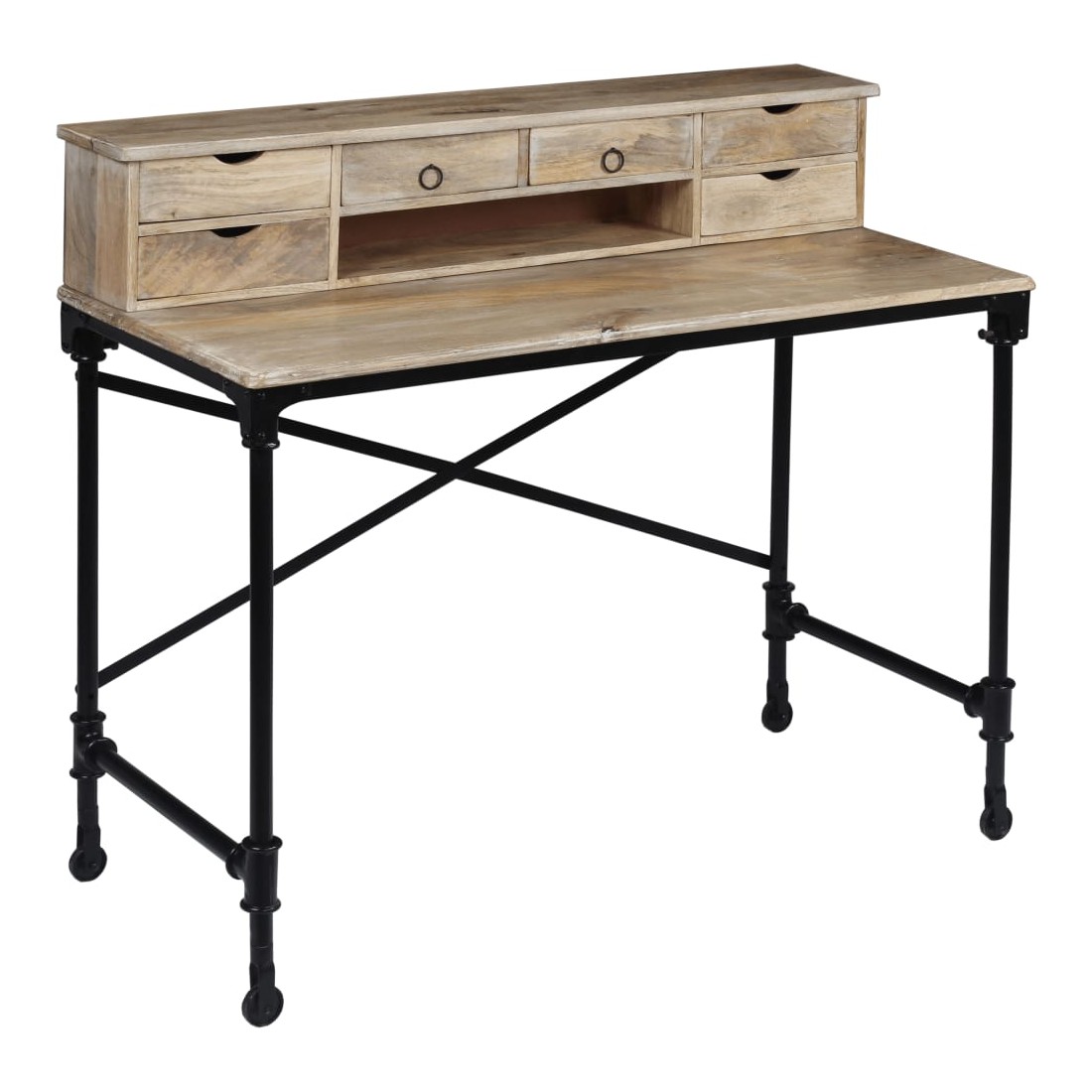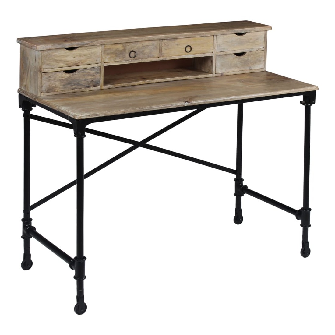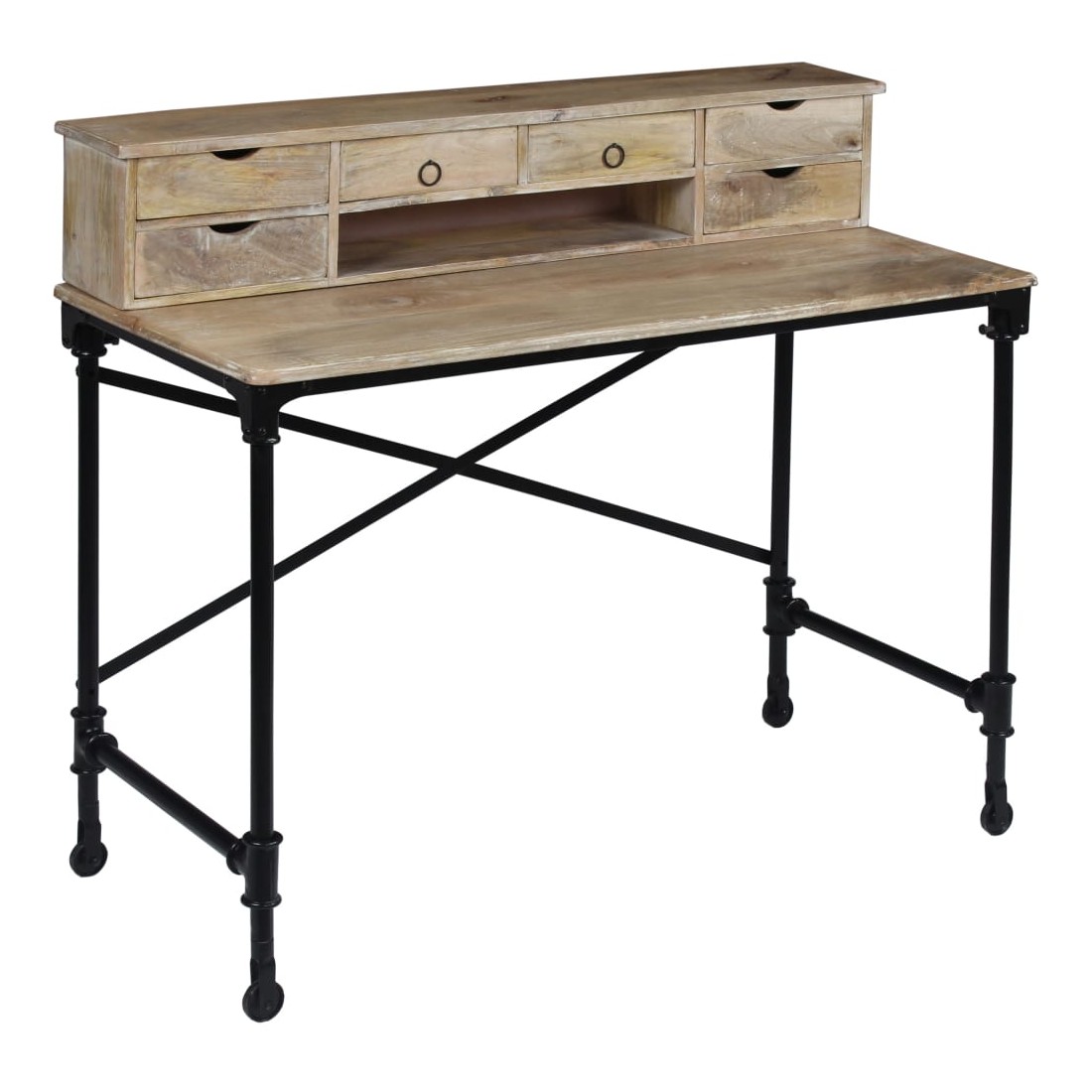 Cette table à écrire en bois de manguier massif, d'un style vintage spectaculaire, en fera un complément à la fois décoratif et pratique à votre décor. Le bureau est fait à la main en bois de manguier qui est solide, stable, durable et beau, et l'artisanat ajoute à son style rétro spectaculaire. Chaque étape du processus est réalisée avec le plus grand soin, qu'il s'agisse du polissage ou du laquage. Le travail artisanal et les belles veines de bois rendent chaque meuble unique et légèrement différent l'un de l'autre. Conçu avec 6 tiroirs et 1 petit compartiment, ce bureau vous offre un espace de rangement spacieux pour garder vos objets importants organisés et à portée de main. La partie supérieure peut être enlevée pour offrir une grande surface de table lisse. La structure robuste en acier ajoute également à sa stabilité et à son style industriel époustouflant. L'assemblage est facile. Remarque importante : Les couleurs et les grains peuvent varier d'une pièce à l'autre, ce qui rend chacun de nos bureaux unique ; la livraison est aléatoire.