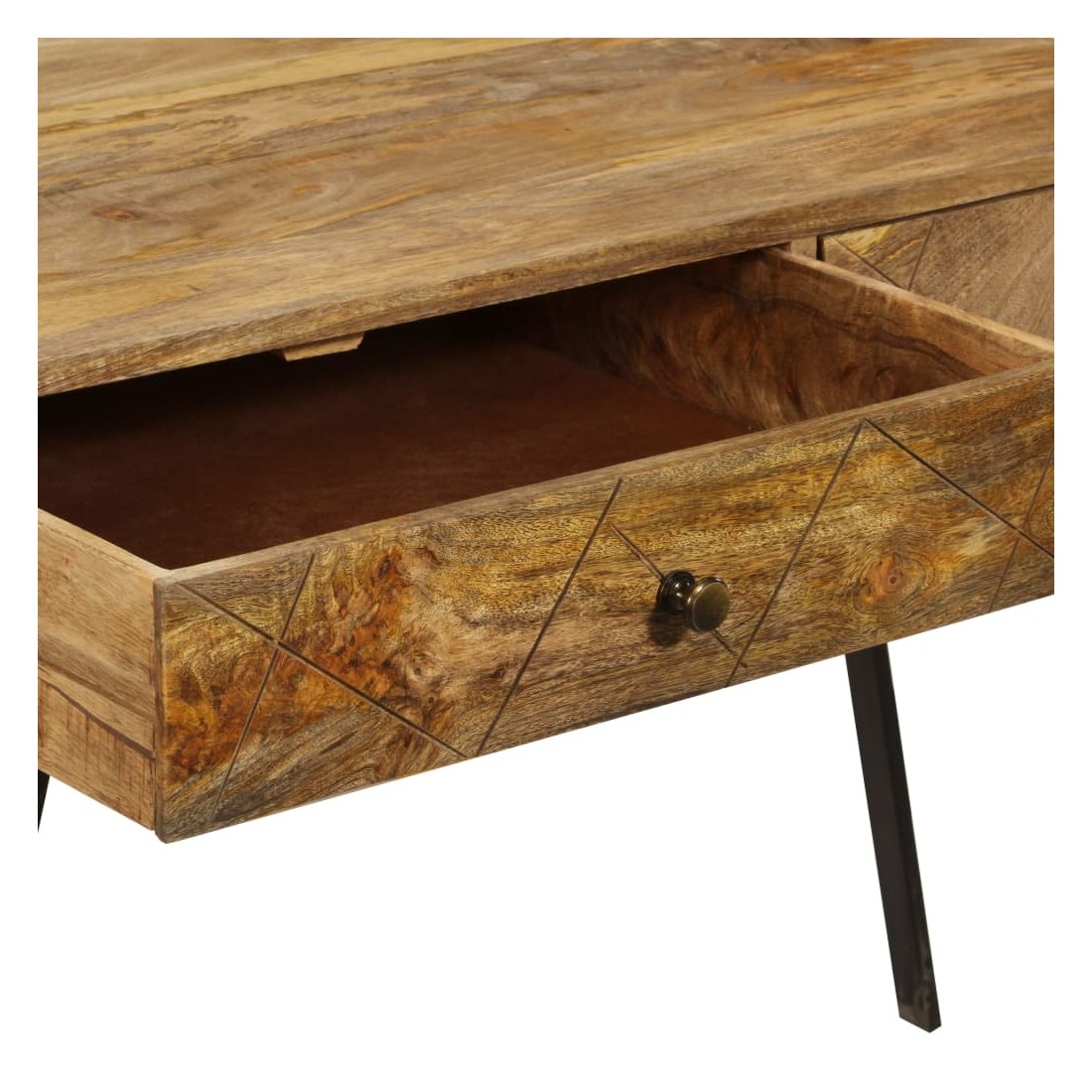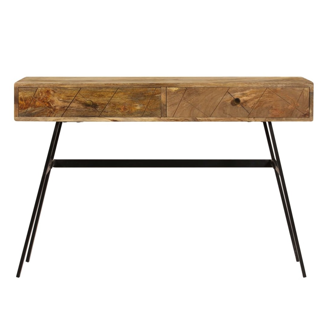 Ce bureau apportera une touche unique à votre intérieur grâce à son design industriel. Vous pouvez l'utiliser comme bureau d'ordinateur pour votre travail quotidien ou en tant que console. Le bureau est fait de bois de manguier solide avec une finition à l'huile. Les pieds en acier robuste contribuent à la solidité du bureau ainsi qu'à son charme industriel. Le bureau a 2 tiroirs avec un grand espace pour garder vos objets importants organisés et à portée de main. Remarque importante : Les couleurs varient d'une pièce à l'autre, rendant chacun de nos bureaux unique. La livraison est aléatoire.