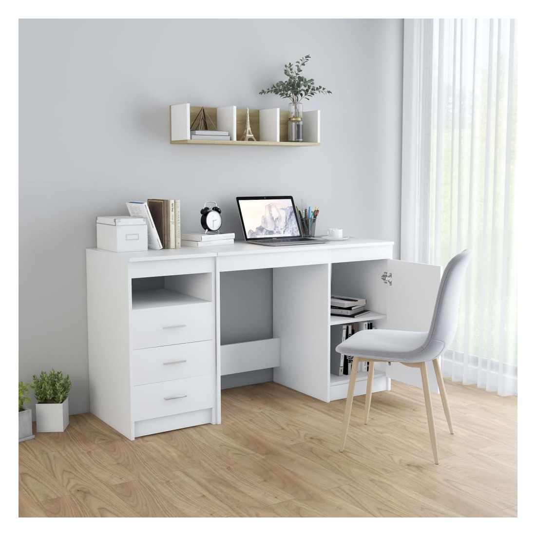 Notre bureau élégant et moderne vous offre un endroit pratique pour accomplir vos tâches quotidiennes tout en ajoutant une touche résolument moderne à votre bureau et à votre espace de travail. Le bureau, en bois d’ingénierie de qualité, garantit robustesse et durabilité. Et il offre également un grand espace de rangement avec 3 tiroirs et 1 porte. Ils sont idéaux pour stocker des livres, des magazines, des dossiers et autres articles essentiels. Le bureau est facile à nettoyer avec un chiffon humide. Le bureau est facile à assembler.