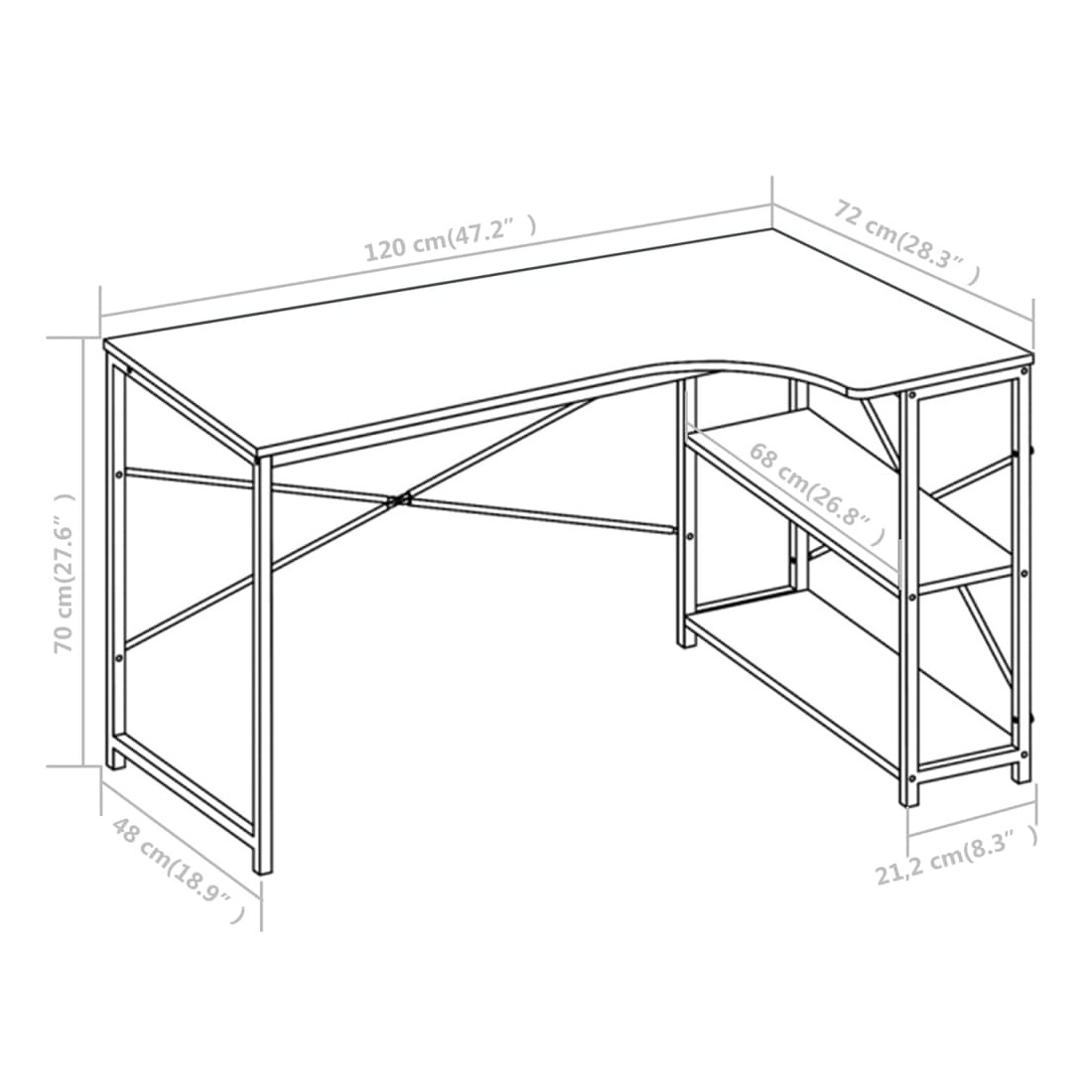 Comme tous les meilleurs designs, notre bureau d'ordinateur simple mais élégant est propre, compact et sûr. Il offre un grand espace de travail, ce qui en fait un meuble très pratique et polyvalent à utiliser à la maison ou au bureau. Le bureau en forme de L est conçu avec deux étagères pour organiser vos livres, dossiers, documents ou pour afficher des objets de décoration. Fabriqué en métal enduit de poudre et en bois d'ingénierie, le bureau est extrêmement stable, solide et durable. De plus, le cadre en métal confère au bureau un style industriel, apportant une touche de charme unique à votre intérieur. Améliorez votre intérieur avec notre bureau moderne !