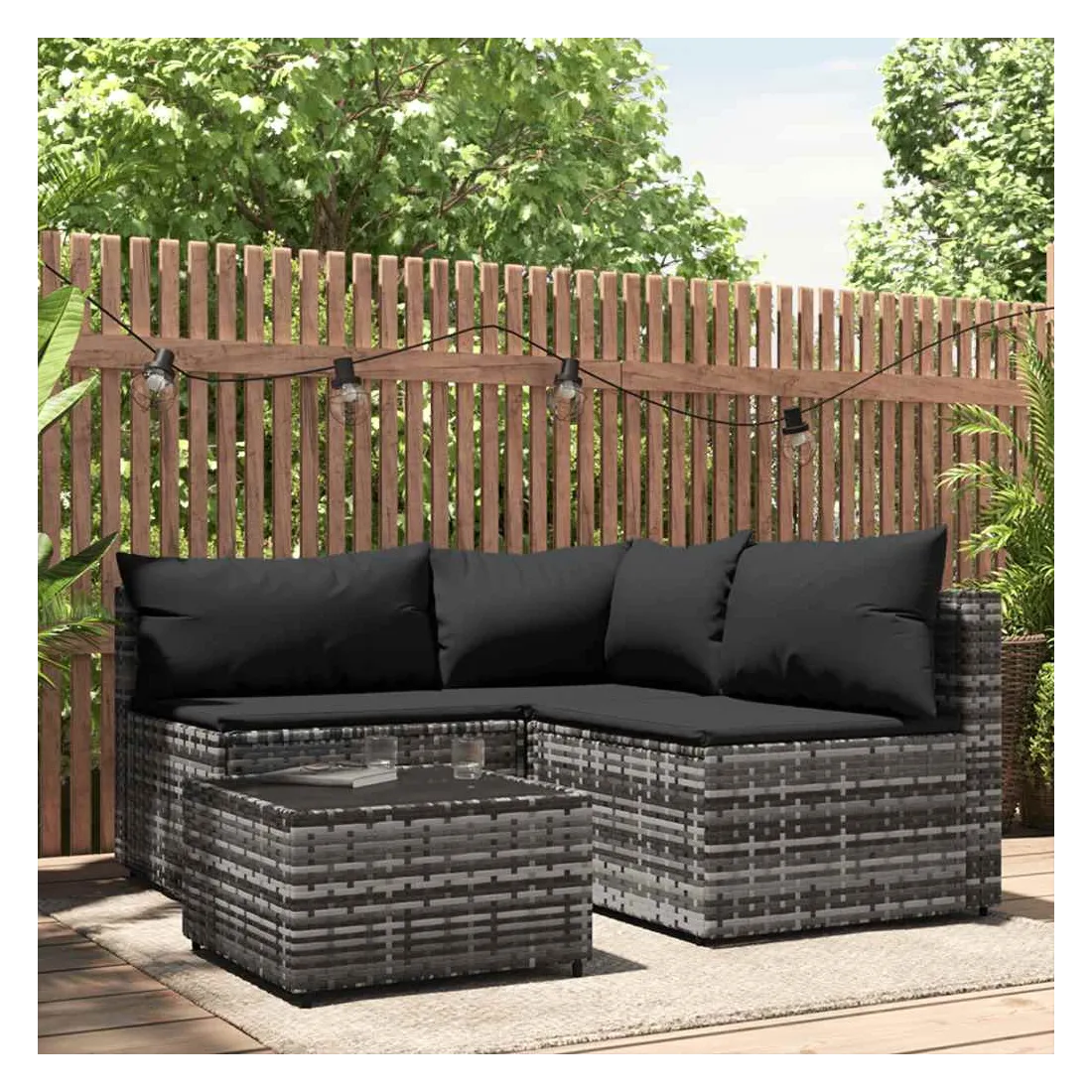 Cet ensemble de salon de jardin tendance, au design élégant et contemporain, est un excellent choix pour manger ou vous détendre dans votre jardin. Matériau résistant aux intempéries : la résine tressée, également connue sous le nom de rotin poly, résiste aux intempéries et est facile à nettoyer. Elle reste belle à l'extérieur pendant une longue période. Elle offre une excellente qualité, commodité et un aspect esthétique.Cadre robuste : les cadres en acier enduit de poudre rendent l'ensemble de salon d'extérieur robuste et stable pour une utilisation quotidienne à l'extérieur.Dessus de table pratique : le dessus lisse de la table de jardin est en verre trempé, facile à nettoyer avec un chiffon humide. De plus, le dessus robuste est parfait pour placer des repas, des boissons et d'autres objets décoratifs.Conception modulaire : l'ensemble de salon de jardin est flexible et facile à déplacer, vous pouvez donc le combiner avec d'autres segments modulaires dans la boutique en ligne pour créer vos propres configurations d'ensemble de salon de jardin !Expérience d'assise confortable : le dossier ajoute un confort d'assise supplémentaire au canapé de jardin. De plus, les coussins bien rembourrés offrent du confort pendant votre temps d'assise. Bon à savoir :Pour faciliter au maximum le montage, chaque produit est livré avec des instructions. Remarque :Le produit est conçu pour une utilisation à l'extérieur uniquement. Ne le rangez pas à l'intérieur.Pour que vos meubles d'extérieur restent beaux, nous vous recommandons de les protéger avec une housse imperméable.