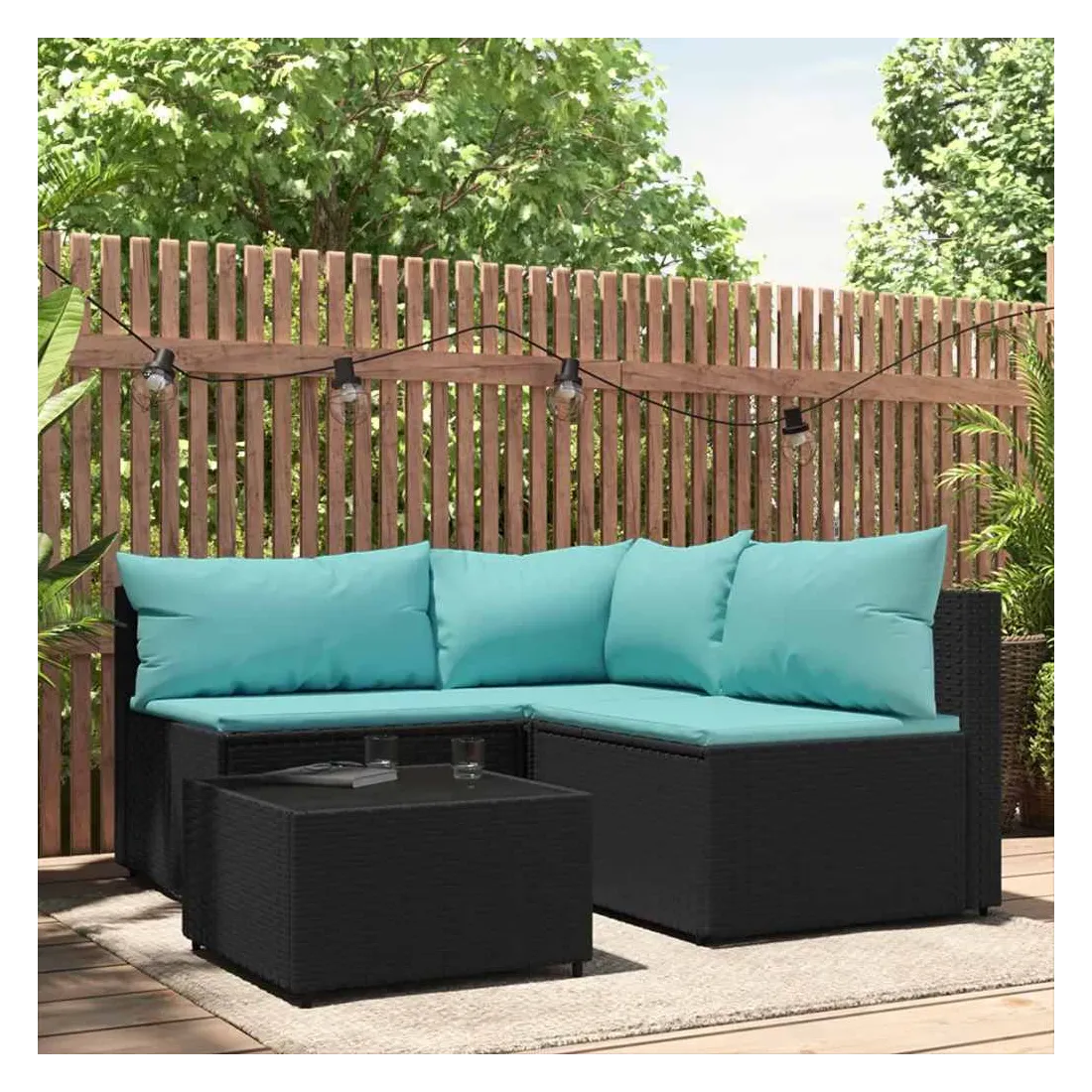 Cet ensemble de salon de jardin tendance, au design élégant et contemporain, est un excellent choix pour manger ou vous détendre dans votre jardin. Matériau résistant aux intempéries : la résine tressée, également connue sous le nom de rotin poly, résiste aux intempéries et est facile à nettoyer. Elle reste belle à l'extérieur pendant une longue période. Elle offre une excellente qualité, commodité et un aspect esthétique.Cadre robuste : les cadres en acier enduit de poudre rendent l'ensemble de salon d'extérieur robuste et stable pour une utilisation quotidienne à l'extérieur.Dessus de table pratique : le dessus lisse de la table de jardin est en verre trempé, facile à nettoyer avec un chiffon humide. De plus, le dessus robuste est parfait pour placer des repas, des boissons et d'autres objets décoratifs.Conception modulaire : l'ensemble de salon de jardin est flexible et facile à déplacer, vous pouvez donc le combiner avec d'autres segments modulaires dans la boutique en ligne pour créer vos propres configurations d'ensemble de salon de jardin !Expérience d'assise confortable : le dossier ajoute un confort d'assise supplémentaire au canapé de jardin. De plus, les coussins bien rembourrés offrent du confort pendant votre temps d'assise. Bon à savoir :Pour faciliter au maximum le montage, chaque produit est livré avec des instructions. Remarque :Le produit est conçu pour une utilisation à l'extérieur uniquement. Ne le rangez pas à l'intérieur.Pour que vos meubles d'extérieur restent beaux, nous vous recommandons de les protéger avec une housse imperméable.