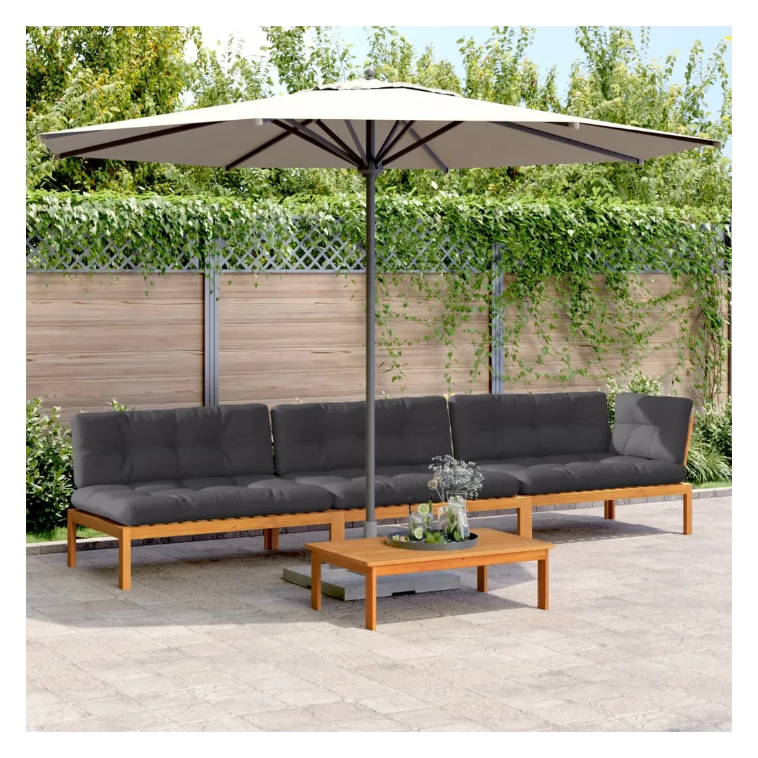 Cet ensemble de canapés en palettes en bois au design à lattes sera un excellent ajout à votre jardin, patio ou terrasse pour profiter d’un moment agréable en famille ou entre amis. Matériau durable : le bois d'acacia massif est un matériau naturel magnifique. Le bois d'acacia un bois dur tropical, qui est dense, robuste et durable.Dessus stable et facile à nettoyer : cette table de jardin a un dessus en bois d'acacia robuste, durable et facile à nettoyer avec un chiffon humide.Expérience d'assise confortable : le dossier ajoute un confort d'assise supplémentaire pour le canapé d'extérieur. Ce mobilier d'extérieur, doté d'un coussin épais, offre une expérience d'assise confortable.Conception modulaire : cet ensemble de meubles d'extérieur a une conception modulaire, ce qui le rend complètement flexible et facile à déplacer, afin que vous puissiez créer un agencement de meubles d'extérieur personnalisé. Bon à savoir :Pour que vos meubles d'extérieur restent beaux, nous vous recommandons de les protéger avec une housse imperméable.