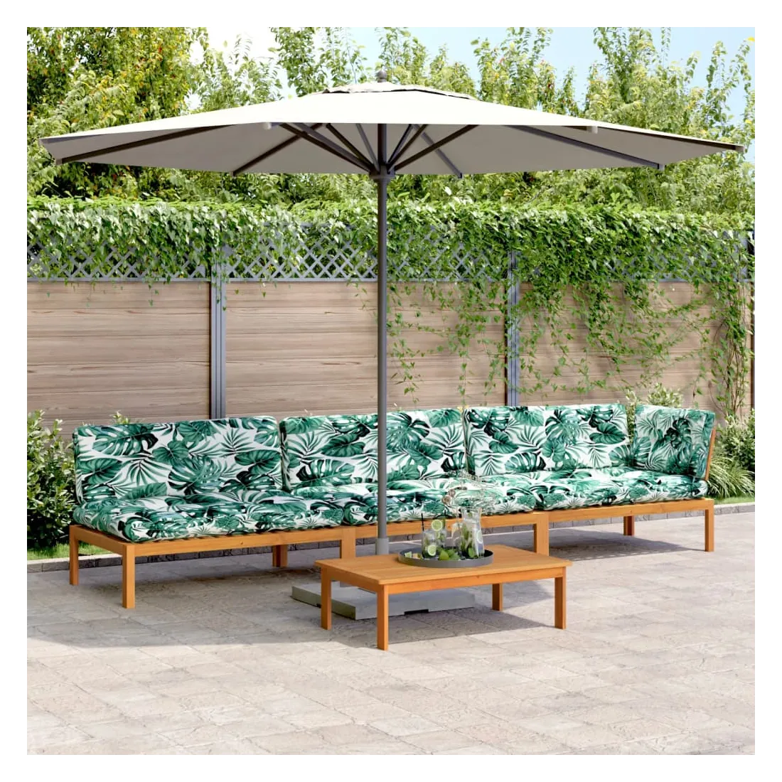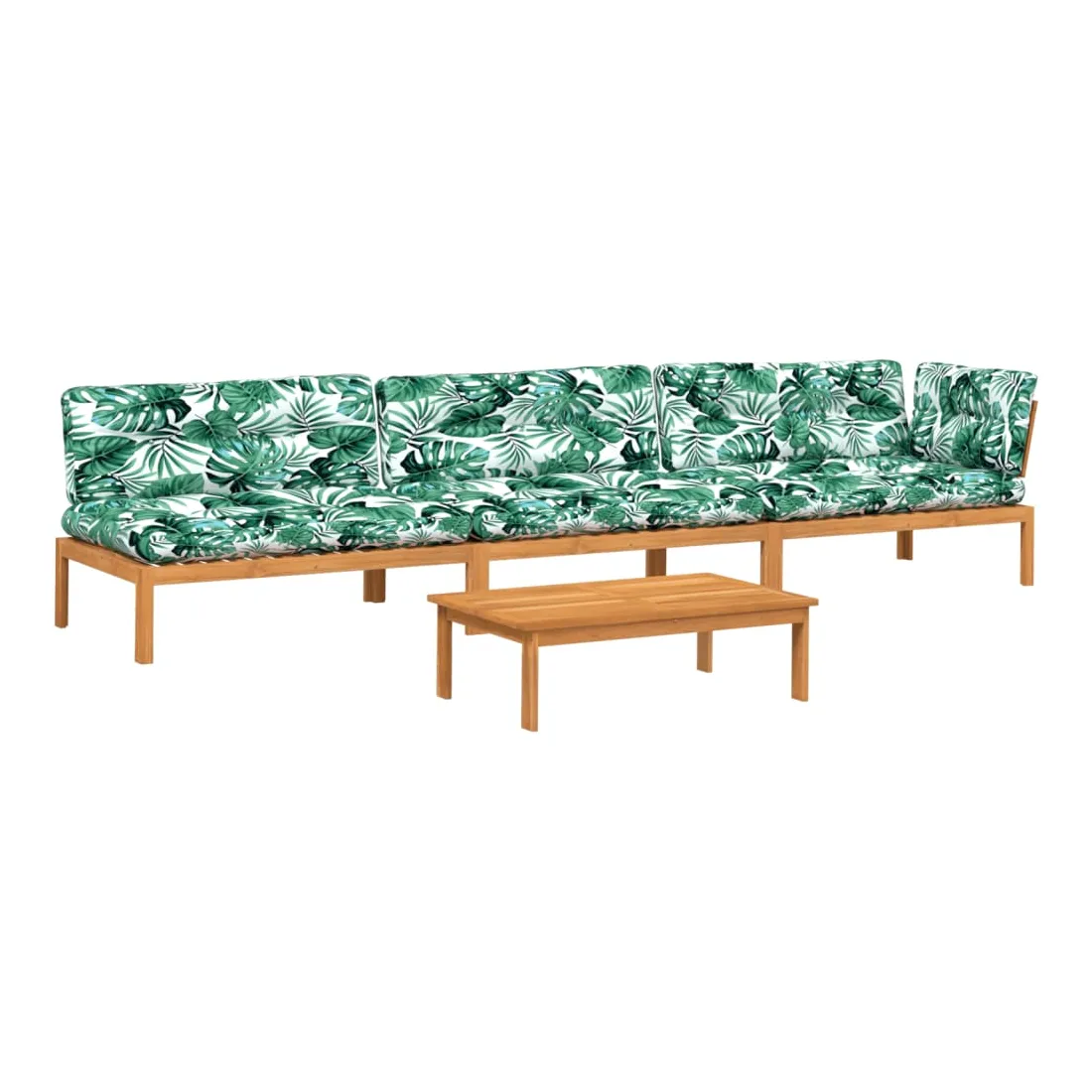 Cet ensemble de canapés en palettes en bois au design à lattes sera un excellent ajout à votre jardin, patio ou terrasse pour profiter d’un moment agréable en famille ou entre amis. Matériau durable : le bois d'acacia massif est un matériau naturel magnifique. Le bois d'acacia un bois dur tropical, qui est dense, robuste et durable.Dessus stable et facile à nettoyer : cette table de jardin a un dessus en bois d'acacia robuste, durable et facile à nettoyer avec un chiffon humide.Expérience d'assise confortable : le dossier ajoute un confort d'assise supplémentaire pour le canapé d'extérieur. Ce mobilier d'extérieur, doté d'un coussin épais, offre une expérience d'assise confortable.Conception modulaire : cet ensemble de meubles d'extérieur a une conception modulaire, ce qui le rend complètement flexible et facile à déplacer, afin que vous puissiez créer un agencement de meubles d'extérieur personnalisé. Bon à savoir :Pour que vos meubles d'extérieur restent beaux, nous vous recommandons de les protéger avec une housse imperméable.