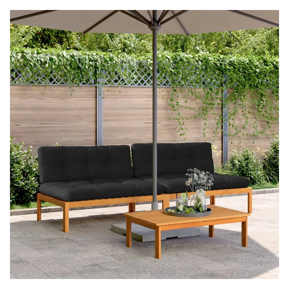 Savourez un café ou discutez avec votre famille et vos amis dans le jardin, l'arrière-cour ou sur le balcon avec ces canapés centraux en palette de jardin ! Matériau durable : le bois d'acacia massif est un matériau naturel magnifique. Le bois d'acacia un bois dur tropical, qui est dense, robuste et durable.Bonne ventilation et prévention de l'accumulation d'eau : la conception à lattes favorise une circulation optimale de l'air et empêche efficacement l'accumulation d'eau, assurant ainsi une assise sèche et confortable.Expérience d'assise confortable : le dossier ajoute un confort d'assise supplémentaire pour le canapé d'extérieur. Ce mobilier d'extérieur, doté d'un coussin épais, offre une expérience d'assise confortable.Conception modulaire : cet ensemble de meubles d'extérieur a une conception modulaire, ce qui le rend complètement flexible et facile à déplacer, afin que vous puissiez créer un agencement de meubles d'extérieur personnalisé. Bon à savoir :Pour que vos meubles d'extérieur restent beaux, nous vous recommandons de les protéger avec une housse imperméable.
