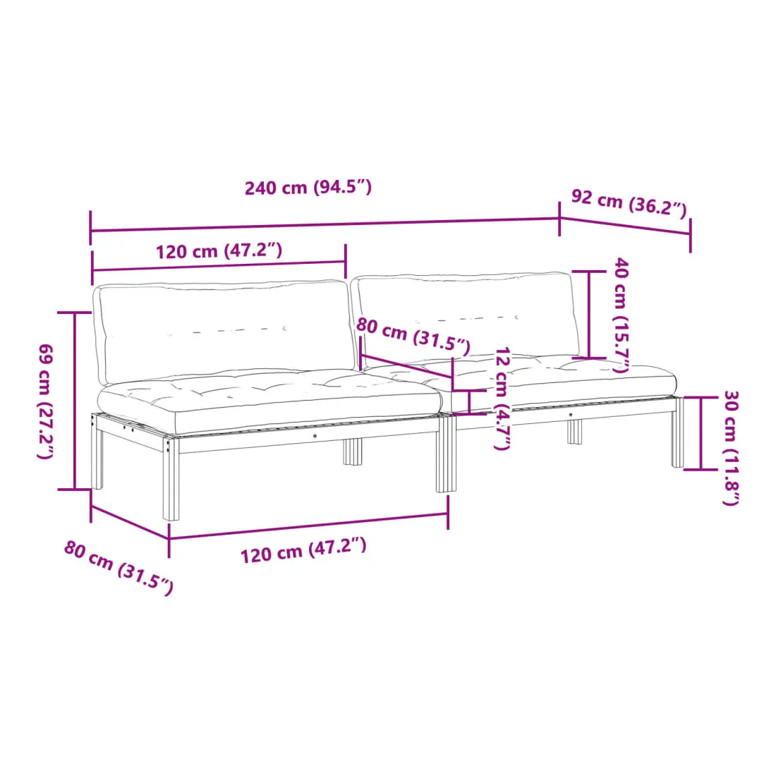 - Dimensions du coussin d'assise : 120 x 80 x 12 cm (L x l x é)