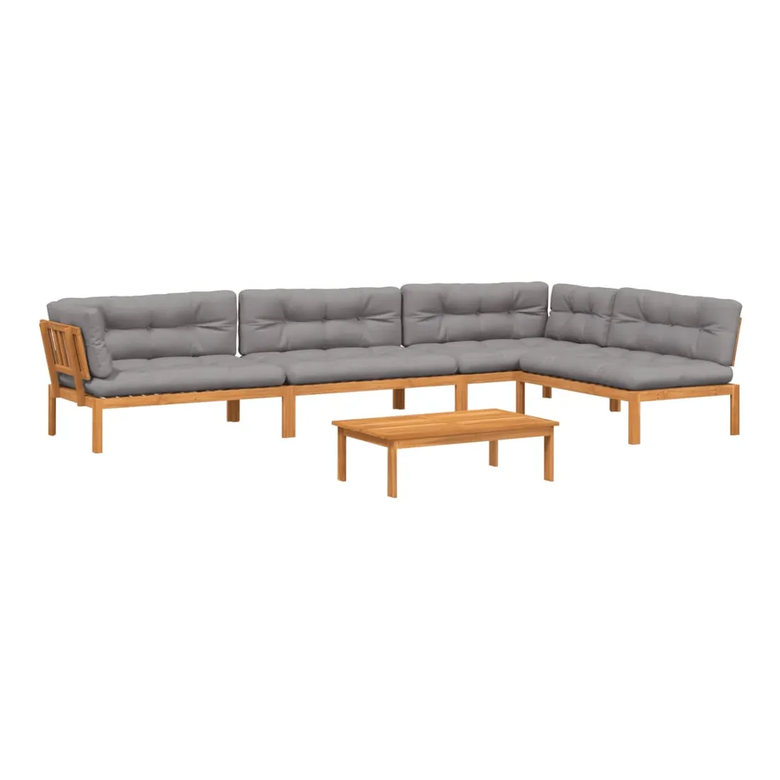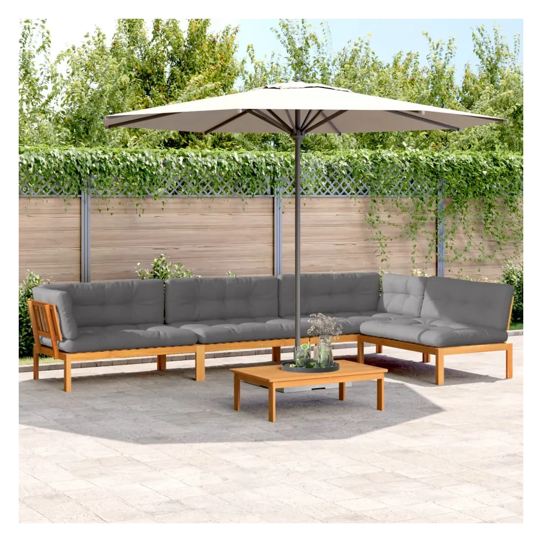 Cet ensemble de canapés en palettes en bois au design à lattes sera un excellent ajout à votre jardin, patio ou terrasse pour profiter d’un moment agréable en famille ou entre amis. Matériau durable : le bois d'acacia massif est un matériau naturel magnifique. Le bois d'acacia un bois dur tropical, qui est dense, robuste et durable.Dessus stable et facile à nettoyer : cette table de jardin a un dessus en bois d'acacia robuste, durable et facile à nettoyer avec un chiffon humide.Expérience d'assise confortable : le dossier ajoute un confort d'assise supplémentaire pour le canapé d'extérieur. Ce mobilier d'extérieur, doté d'un coussin épais, offre une expérience d'assise confortable.Conception modulaire : cet ensemble de meubles d'extérieur a une conception modulaire, ce qui le rend complètement flexible et facile à déplacer, afin que vous puissiez créer un agencement de meubles d'extérieur personnalisé. Bon à savoir :Pour que vos meubles d'extérieur restent beaux, nous vous recommandons de les protéger avec une housse imperméable.