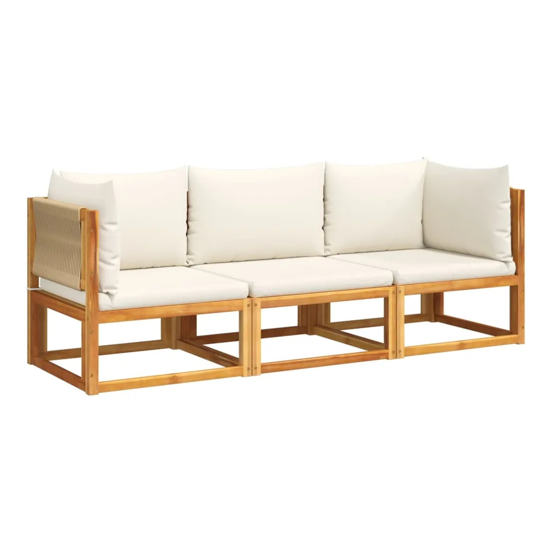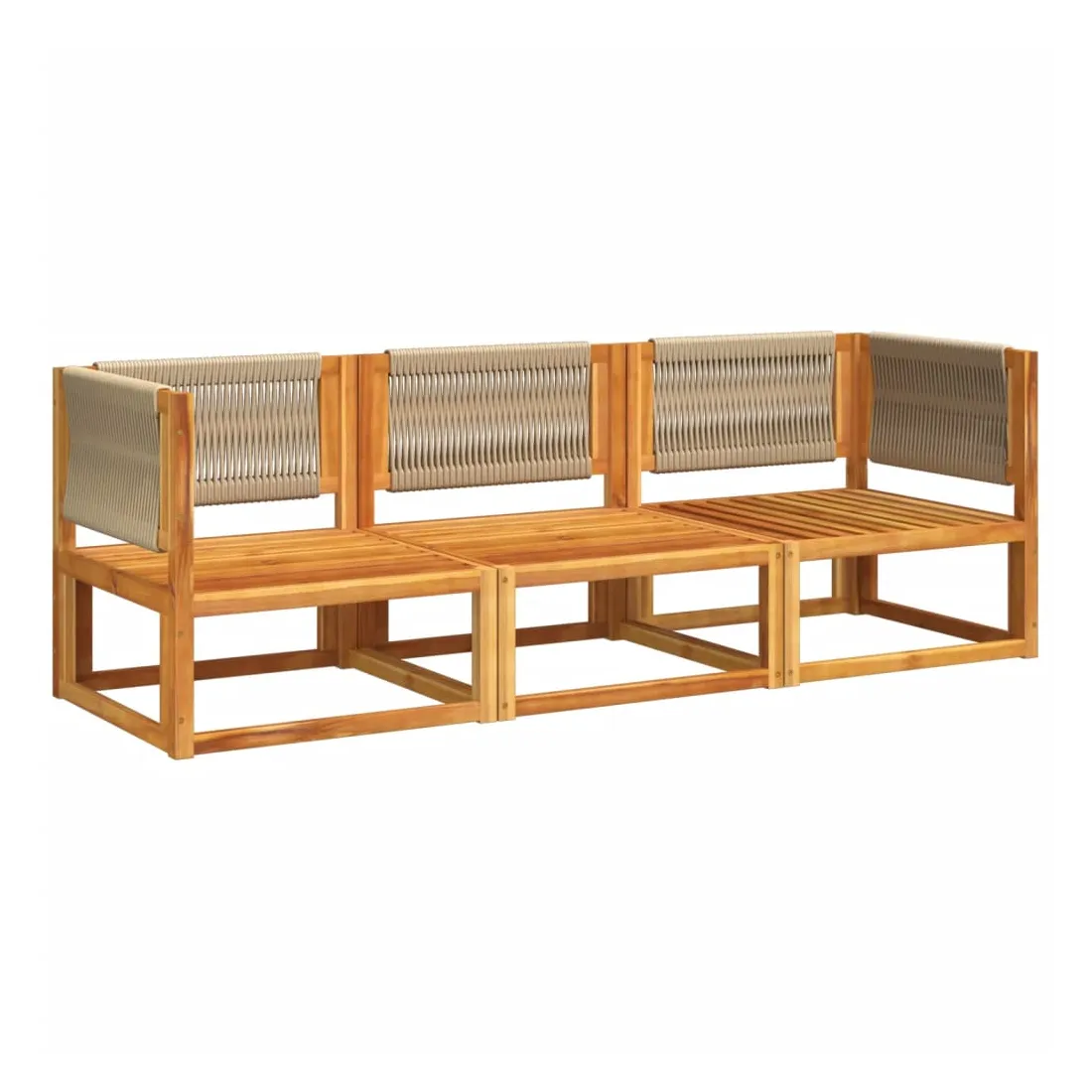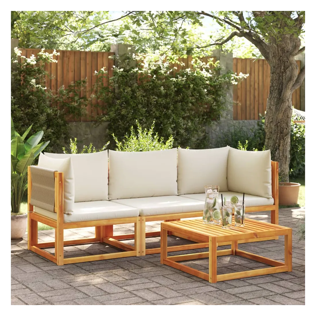 Ce salon de jardin avec dossiers en corde tressée est le complément idéal à votre jardin, terrasse ou patio. Il offre un espace confortable et accueillant pour discuter en famille et entre amis ou simplement se détendre et profiter du plein air. Dossier tressé élégant : ce canapé de jardin est doté de dossiers en corde finement travaillés, ajoutant une touche sophistiquée à tout espace extérieur.Cadre robuste et stable : le bois d'acacia massif est connu pour sa résistance et sa durabilité. Ses couleurs variées et ses motifs de grain uniques lui confèrent un aspect attrayant. Avec une bonne stabilité et une bonne résistance aux intempéries, il est idéal pour la fabrication de meubles d'intérieur et d'extérieur.Assise confortable : Ce mobilier d'extérieur, doté de coussins épais et rembourrés, offre une assise confortable.Housse amovible et lavable : Ces coussins d'assise sont dotés de housses amovibles pour un lavage et un entretien faciles.Aération optimale et prévention des accumulations d'eau : La conception à lattes favorise une circulation d'air optimale et empêche efficacement l'accumulation d'eau, garantissant un mobilier de jardin sec et confortable.Conception modulaire : Cet ensemble de mobilier d'extérieur a une conception modulaire, ce qui le rend entièrement flexible et facile à déplacer, vous permettant ainsi de créer un aménagement de mobilier d'extérieur personnalisé. Bon à savoir :Pour que votre mobilier d'extérieur reste beau, nous vous recommandons de le protéger avec une housse imperméable.