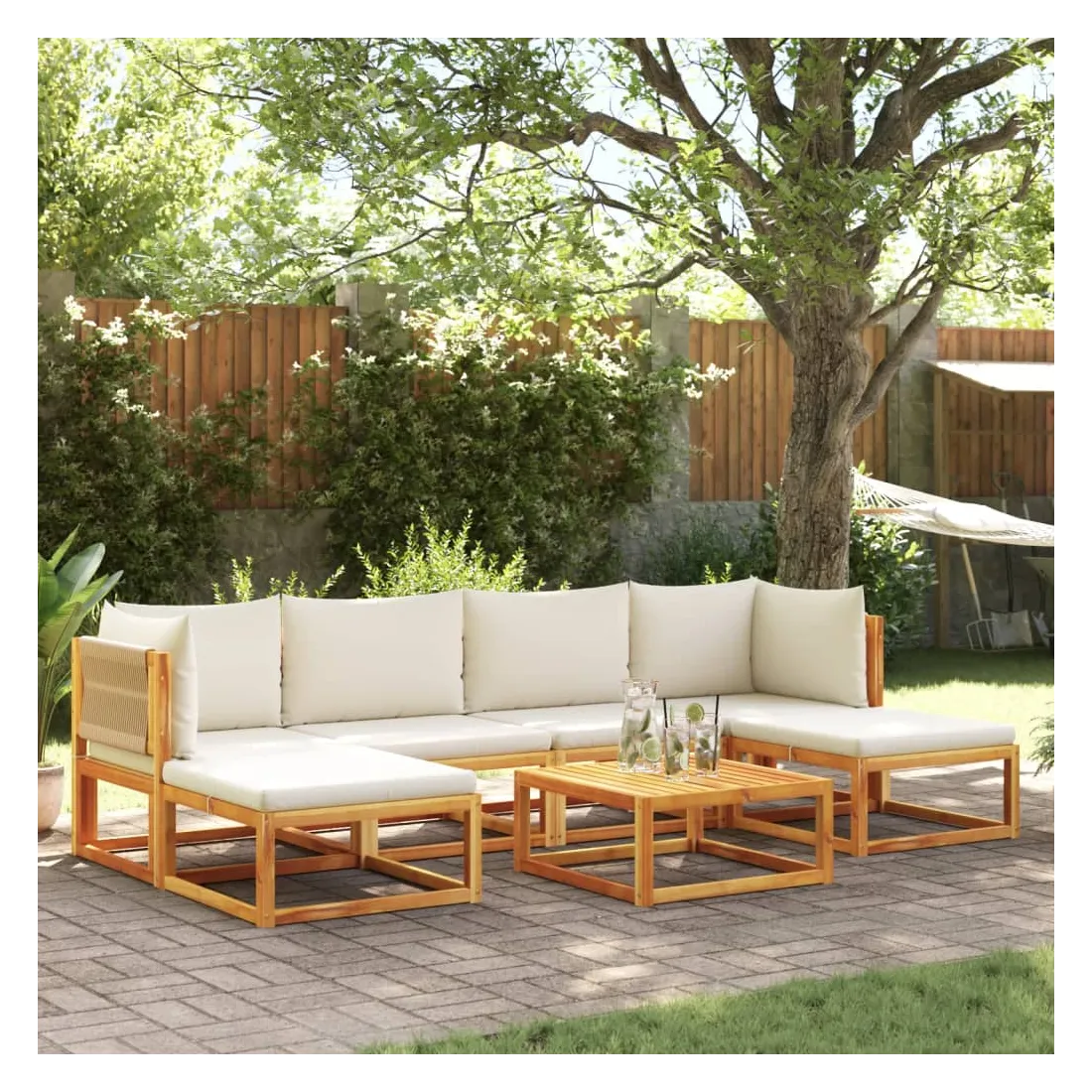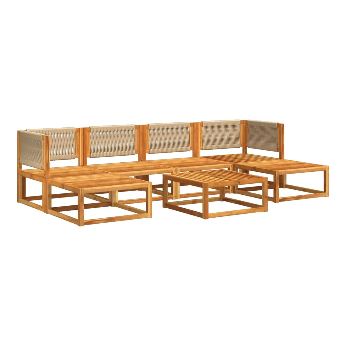 Ce salon de jardin avec dossiers en corde tressée est le complément idéal à votre jardin, terrasse ou patio. Il offre un espace confortable et accueillant pour discuter en famille et entre amis ou simplement se détendre et profiter du plein air. Dossier tressé élégant : ce canapé de jardin est doté de dossiers en corde finement travaillés, ajoutant une touche sophistiquée à tout espace extérieur.Cadre robuste et stable : le bois d'acacia massif est connu pour sa résistance et sa durabilité. Ses couleurs variées et ses motifs de grain uniques lui confèrent un aspect attrayant. Avec une bonne stabilité et une bonne résistance aux intempéries, il est idéal pour la fabrication de meubles d'intérieur et d'extérieur.Assise confortable : Ce mobilier d'extérieur, doté de coussins épais et rembourrés, offre une assise confortable.Housse amovible et lavable : Ces coussins d'assise sont dotés de housses amovibles pour un lavage et un entretien faciles.Aération optimale et prévention des accumulations d'eau : La conception à lattes favorise une circulation d'air optimale et empêche efficacement l'accumulation d'eau, garantissant un mobilier de jardin sec et confortable.Conception modulaire : Cet ensemble de mobilier d'extérieur a une conception modulaire, ce qui le rend entièrement flexible et facile à déplacer, vous permettant ainsi de créer un aménagement de mobilier d'extérieur personnalisé. Bon à savoir :Pour que votre mobilier d'extérieur reste beau, nous vous recommandons de le protéger avec une housse imperméable.