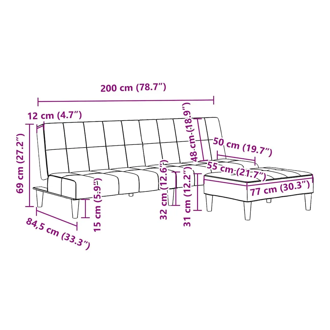 - Dimensions totales : 200 x 84,5 x 69 cm (L x l x H)