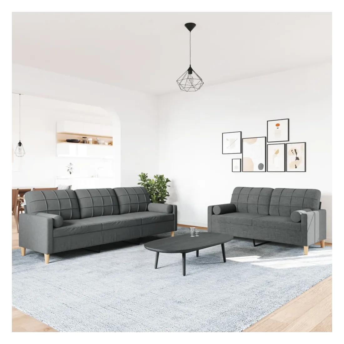 Cet ensemble de canapés est un excellent endroit pour discuter, lire, regarder la télévision ou simplement vous détendre. Il est destiné à être un point central de votre maison. Matériau doux et durable : le tissu en polyester offre une combinaison de douceur, de respirabilité et de durabilité, vous garantissant un confort et une convivialité ultimes. Cadre robuste et stable : le cadre en métal du canapé en tissu assure robustesse et stabilité. Expérience d'assise confortable : le canapé est très confortable avec les sièges, les accoudoirs et les oreillers de dossier bien rembourrés. Oreillers cylindriques pratiques : ces oreillers cylindriques non seulement embellissent votre décor, mais ils peuvent également apporter un confort supplémentaire lorsque vous êtes assis ou allongé.