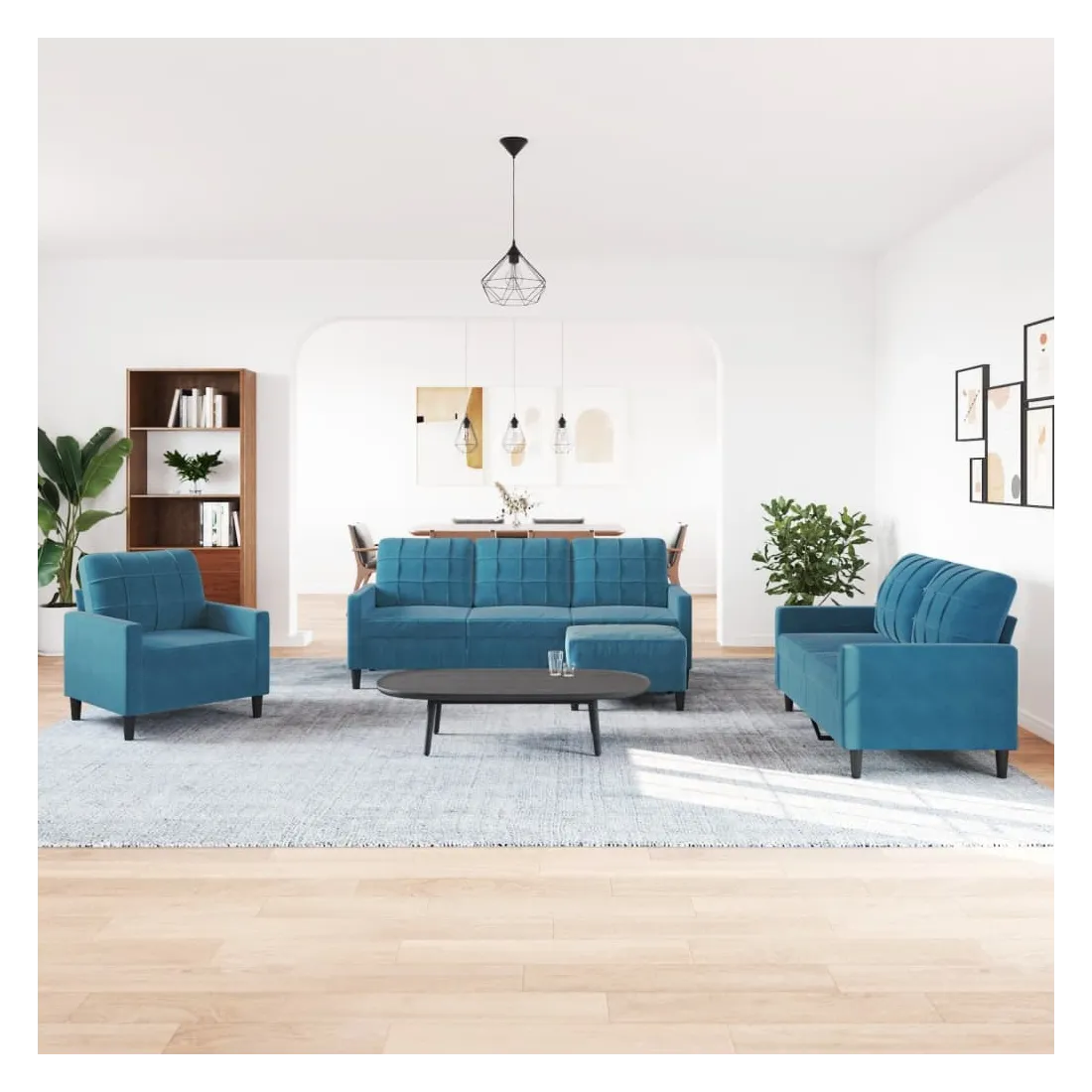 Cet ensemble de canapés est un excellent endroit pour discuter, lire, regarder la télévision ou simplement vous détendre. Il est destiné à être un point central de votre maison. Matériau doux et confortable : le tissu en velours présente une surface douce et lisse qui offre une sensation agréable contre la peau, vous apportant chaleur et confort ultime.Cadre robuste et stable : le cadre en métal du canapé de salon assure robustesse et stabilité.Expérience d'assise confortable : le canapé est très confortable avec les sièges, les accoudoirs et les oreillers de dossier bien rembourrés.Pouf polyvalent : ce repose-pied convient pour reposer vos pieds lorsque vous êtes allongé dans un canapé, ou pour vous offrir un siège supplémentaire dans votre pièce. De plus, le design simple et la taille compacte le rendent idéal pour presque tous vos espaces de vie.Design accrocheur : doté d'un design simple mais moderne, ce canapé est destiné à attirer l'attention dans votre chambre.
