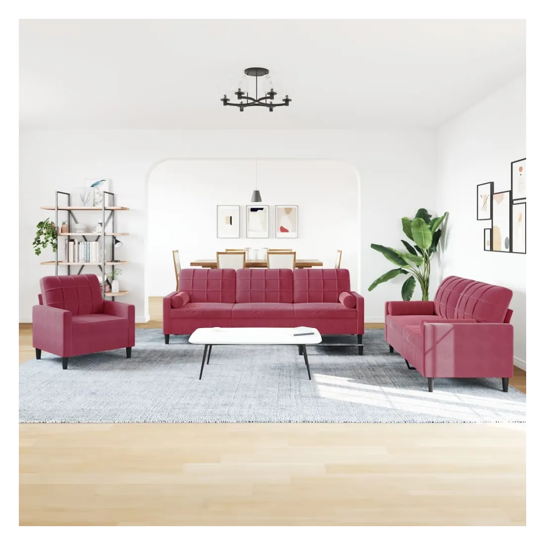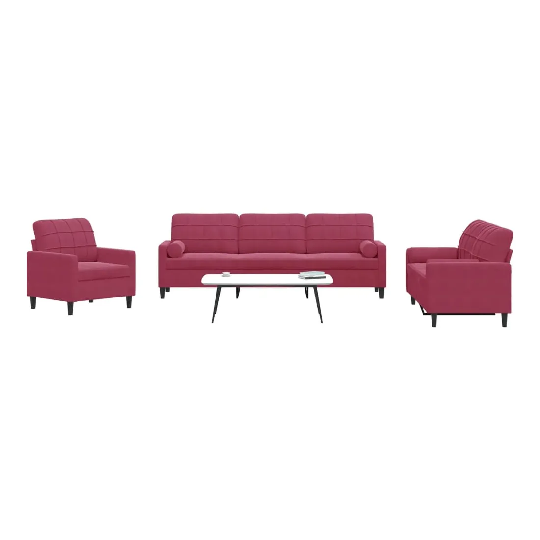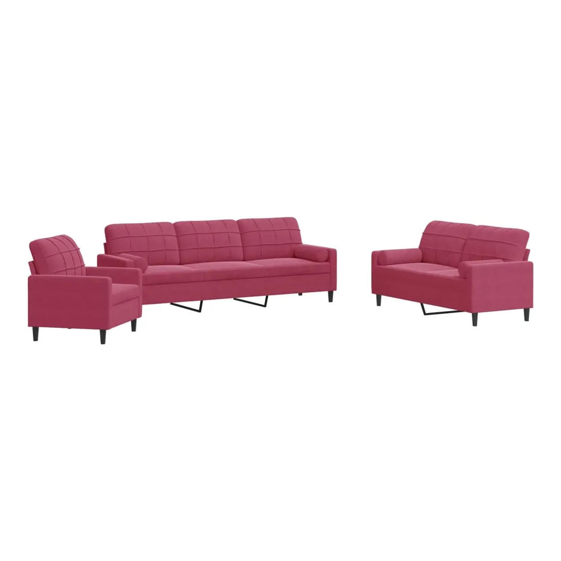 Cet ensemble de canapés est un excellent endroit pour discuter, lire, regarder la télévision ou simplement vous détendre. Il est destiné à être un point central de votre maison. Matériau doux et confortable : le tissu en velours présente une surface douce et lisse qui offre une sensation agréable contre la peau, vous apportant chaleur et confort ultime. Cadre robuste et stable : le cadre en métal du canapé de salon assure robustesse et stabilité. Expérience d'assise confortable : le canapé est très confortable avec les sièges, les accoudoirs et les oreillers de dossier bien rembourrés. Les traversins inclus ne font pas qu'embellir votre décor, ils peuvent aussi ajouter un confort supplémentaire lorsque vous êtes assis ou allongé. Design accrocheur : doté d'un design simple mais moderne, ce canapé est destiné à attirer l'attention dans votre chambre.