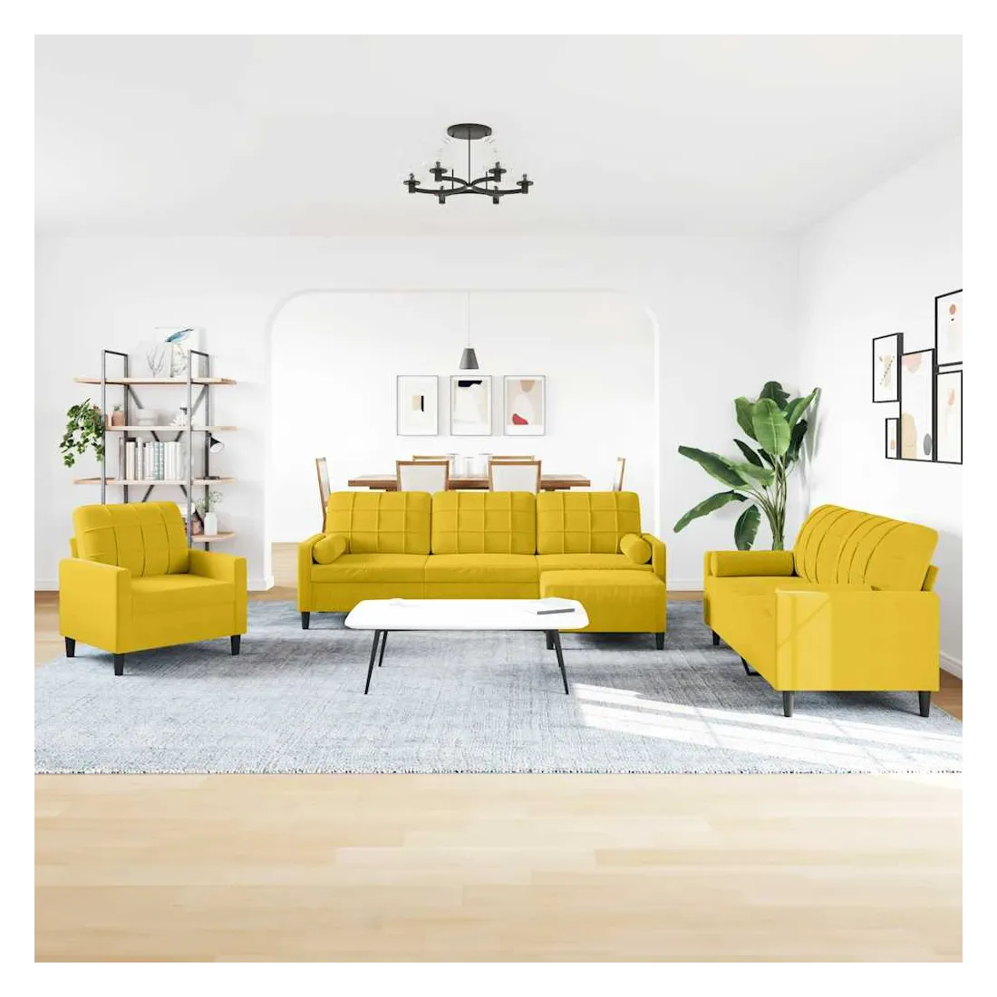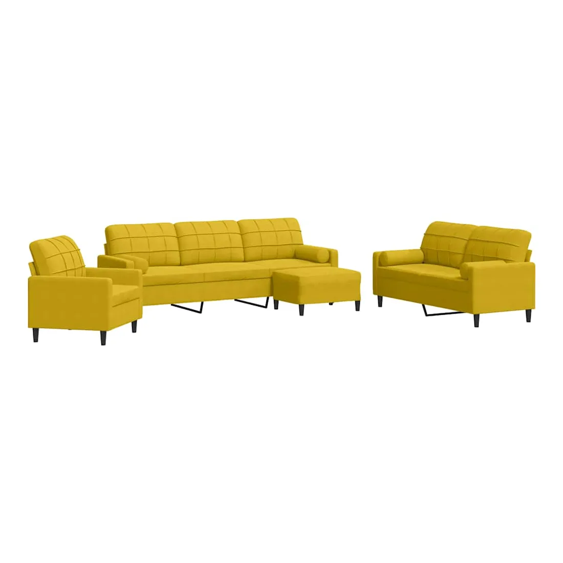 Cet ensemble de canapés est un excellent endroit pour discuter, lire, regarder la télévision ou simplement vous détendre. Il est destiné à être un point central de votre maison. Matériau doux et confortable : le tissu en velours présente une surface douce et lisse qui offre une sensation agréable contre la peau, vous apportant chaleur et confort ultime. Cadre robuste et stable : le cadre en métal du canapé de salon assure robustesse et stabilité. Expérience d'assise confortable : le canapé est très confortable avec les sièges, les accoudoirs et les oreillers de dossier bien rembourrés. Les traversins inclus ne font pas qu'embellir votre décor, ils peuvent aussi ajouter un confort supplémentaire lorsque vous êtes assis ou allongé. Pouf polyvalent : ce repose-pied convient pour reposer vos pieds lorsque vous êtes allongé dans un canapé, ou pour vous offrir un siège supplémentaire dans votre pièce. De plus, le design simple et la taille compacte le rendent idéal pour presque tous vos espaces de vie.Design accrocheur : doté d'un design simple mais moderne, ce canapé est destiné à attirer l'attention dans votre chambre.