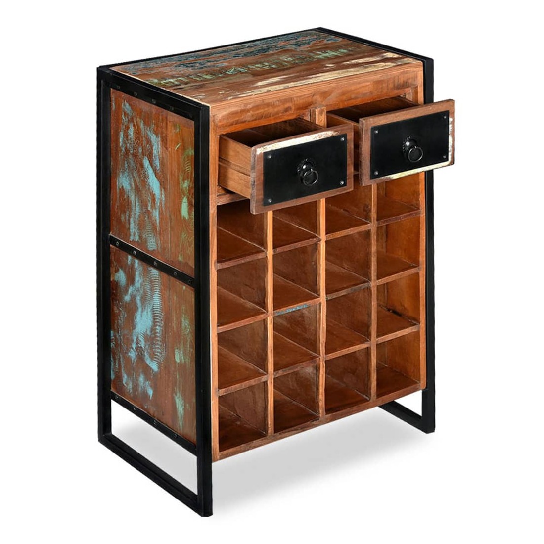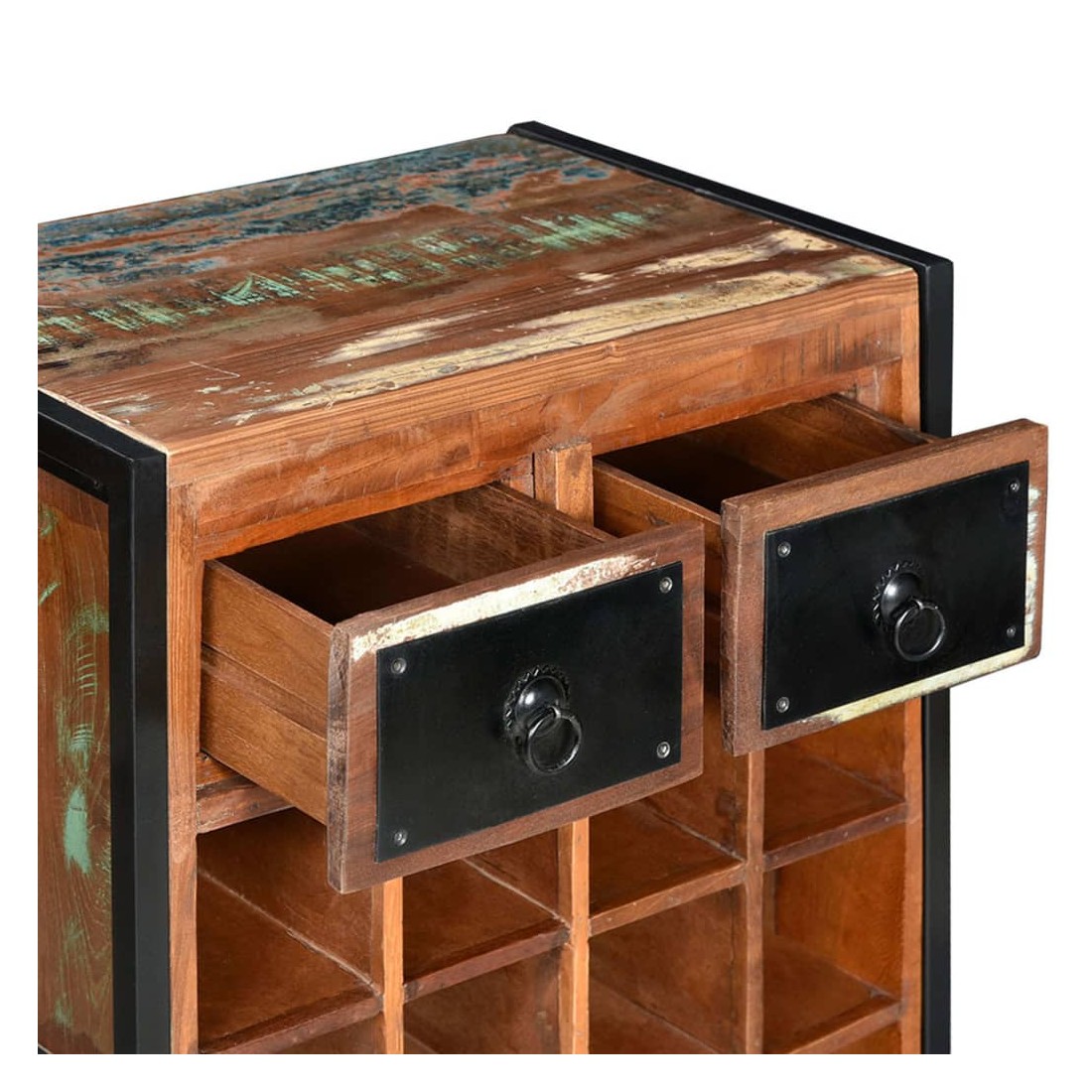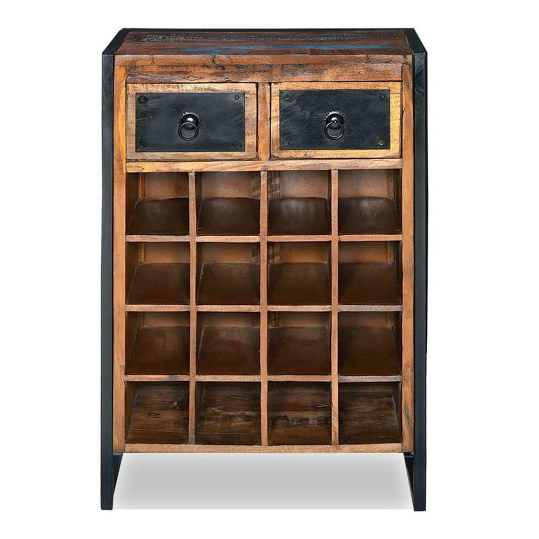 Ce casier à bouteilles en bois de style industriel est parfait pour les amateurs de vin. Cette étagère à vin élégante ajoutera une touche de charme à votre cuisine, salle à manger ou salon. Avec une capacité de 16 bouteilles et 2 tiroirs pratiques pour ranger les accessoires, le casier à bouteilles contient tout ce dont vous avez besoin pour servir un verre de vin. Ce meuble de bar est en bois de récupération qui est solide, durable et beau, et possède les caractéristiques de différents bois comme le teck, le manguier, l'acacia, etc. Chaque meuble est unique et légèrement différent l'un de l'autre. Les signes d'usure et la structure de grain visible donnent à chaque pièce un aspect unique et ajoutent à son style vintage spectaculaire. Ce casier à vin est entièrement fait à la main et chaque étape du processus est réalisée avec le plus grand soin, que ce soit le polissage, la peinture ou le laquage. L'article est déjà assemblé ; aucun assemblage n'est requis. Remarque importante : Les couleurs peuvent varier d'une pièce à l'autre, rendant chacun de nos casiers à bouteilles uniques ; la livraison est aléatoire.