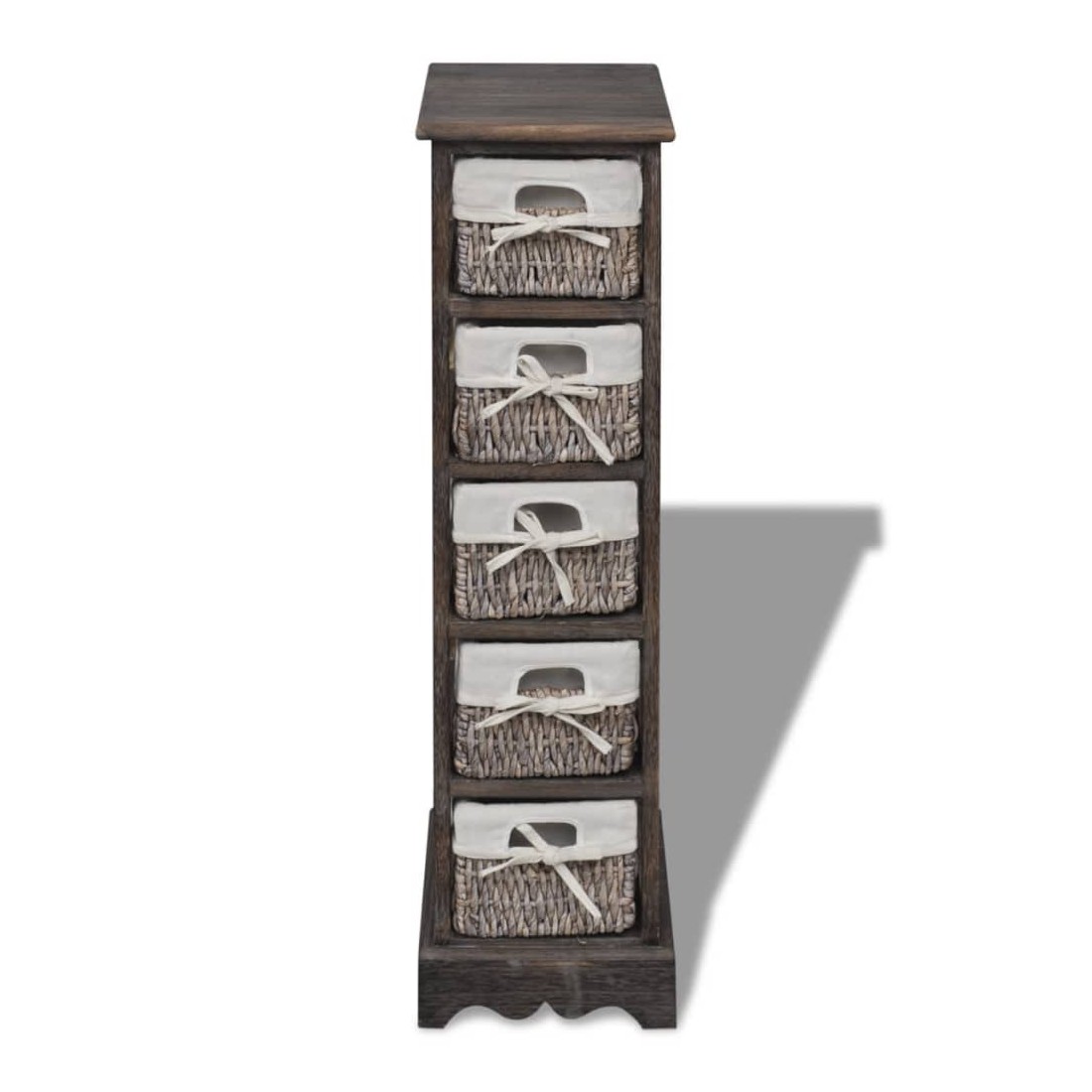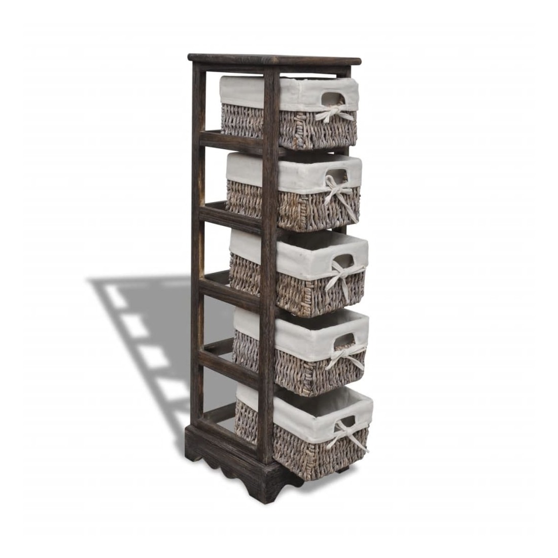 Ce magnifique support de rangement, à 5 couches, en bois de haute qualité, présente un design simple mais élégant. Il stocke non seulement vos affaires mais améliore également le décor de votre chambre. Livré avec cinq paniers en tissage, ce support en bois durable vous offre suffisamment d'espace pour ranger vos objets de valeur et, en même temps, apporte un style campagnard à votre pièce. Notre support en bois sera sûrement l'un de vos meubles préférés dans n'importe quelle pièce. Attention : pour éviter qu'il ne soit renversé, ce produit doit être utilisé avec le dispositif de fixation au mur fourni.