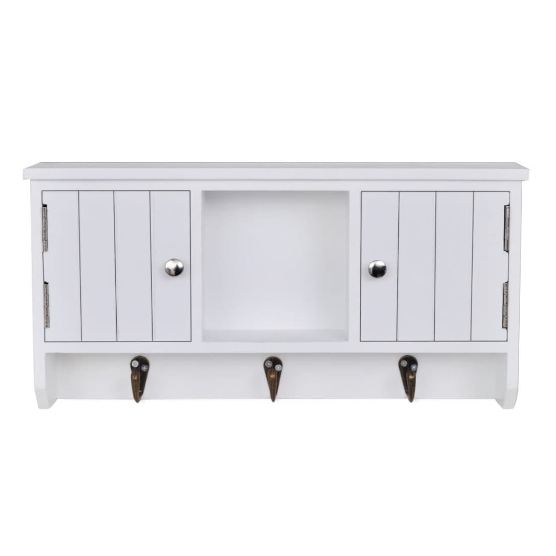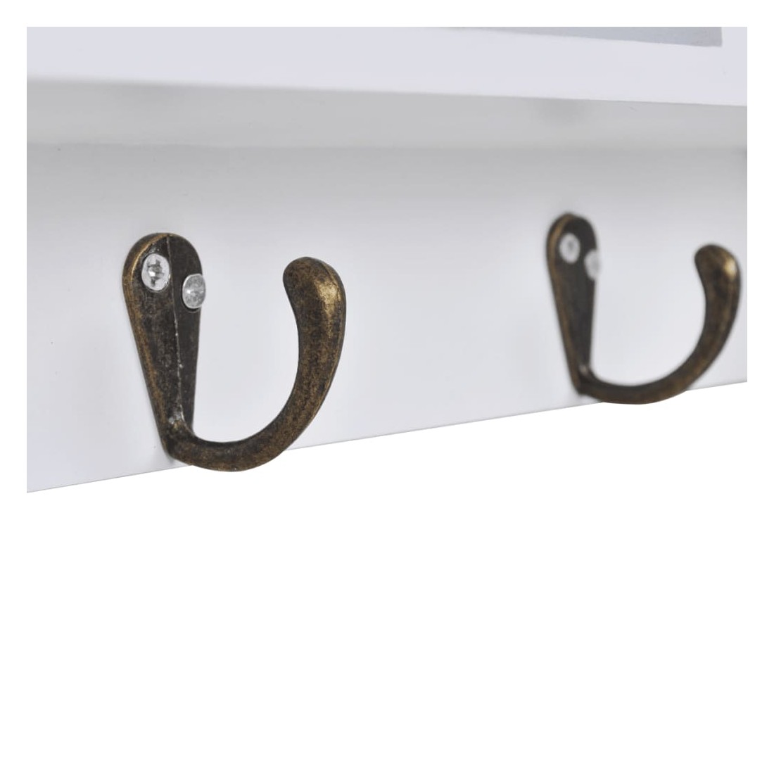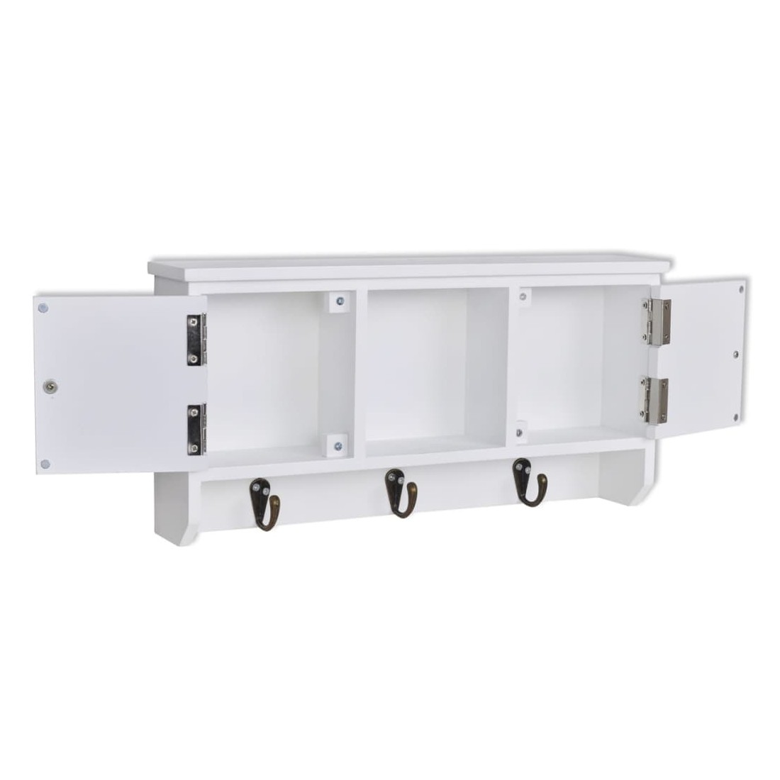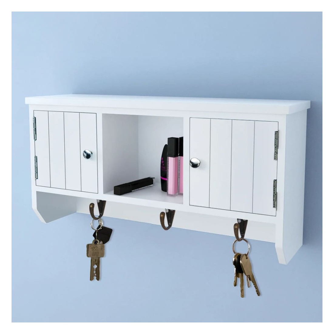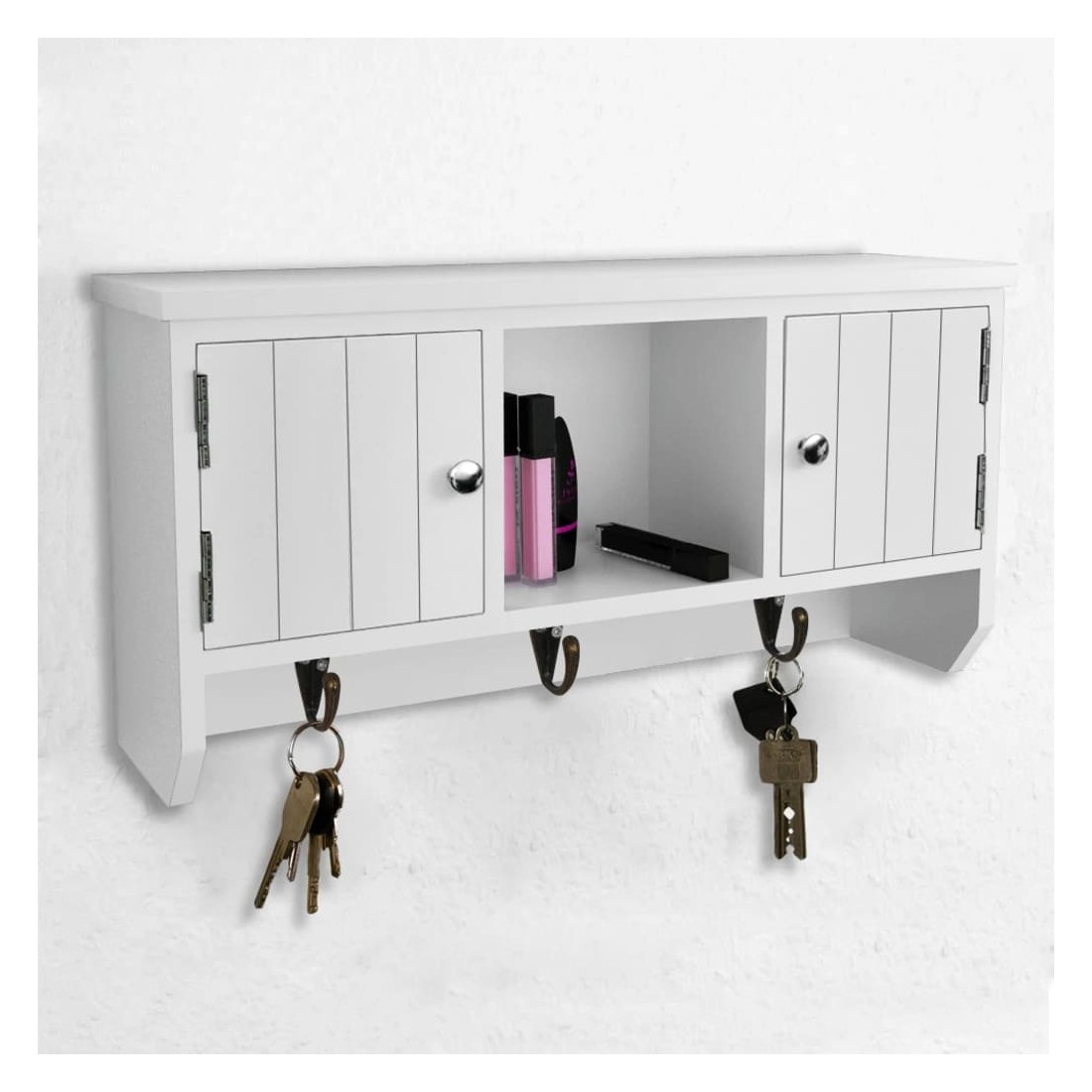 Cette armoire à clés en blanc antique, au design simple mais élégant, sera un supplément décoratif ainsi que fonctionnel à votre décoration intérieure, car vous pourrez l'utiliser pour ranger vos clés et d'autres objets essentiels du quotidien. L'armoire murale dispose de trois crochets métalliques pour placer les clés. Les deux compartiments avec portes et l'étagère centrale offrent beaucoup d'espace pour ranger les portefeuilles, les téléphones portables, les lunettes de soleil, les bijoux ou d'autres accessoires. La construction en MDF rend l'armoire solide et durable. L'armoire peut être fixée solidement au mur. La finition en peinture blanche la rend facile à nettoyer avec un chiffon humide.