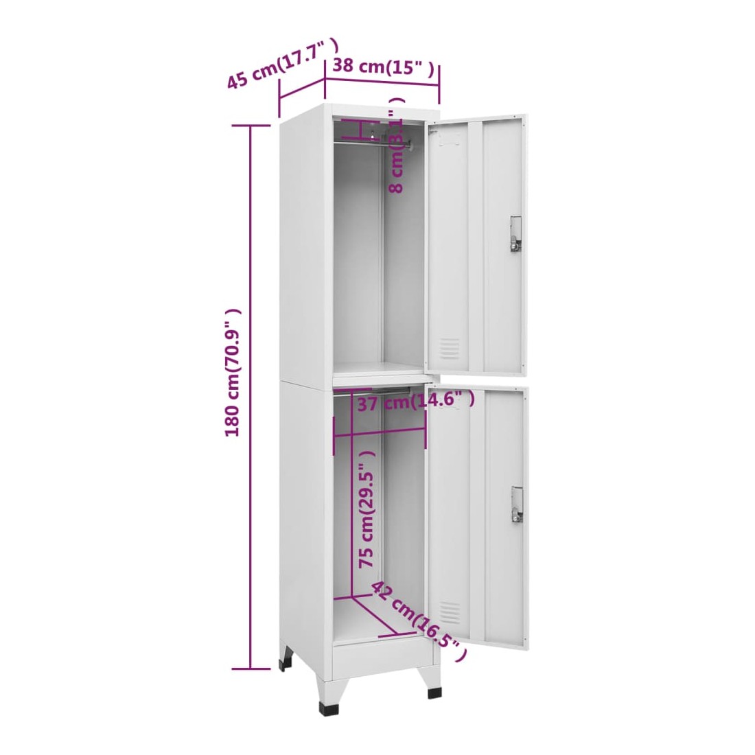 Cette armoire à casier sera non seulement idéal pour les vestiaires sportifs ou les vestiaires d’entreprise, mais peut également ajouter une touche cool et industrielle à votre décor. Avec 2 compartiments avec porte verrouillable, cette armoire à casier dispose d'un grand espace de rangement pour garder les vêtements et autres effets personnels en sécurité. Chaque compartiment dispose d'une barre de penderie et d'un porte-carte nominatif. De plus, cette armoire à casier est faite d'acier de haute qualité, ce qui la rend durable et facile à nettoyer. L'assemblage est vraiment facile.