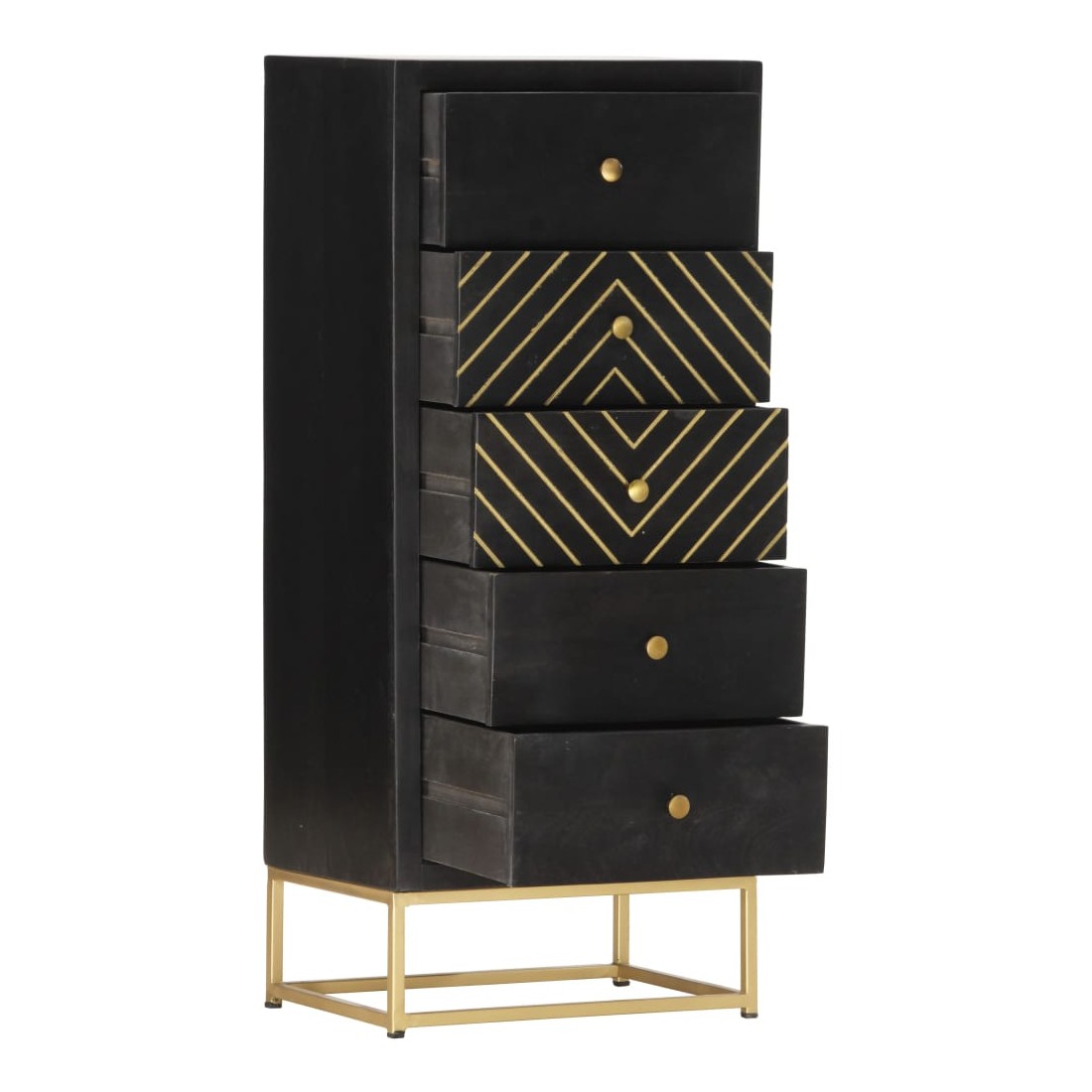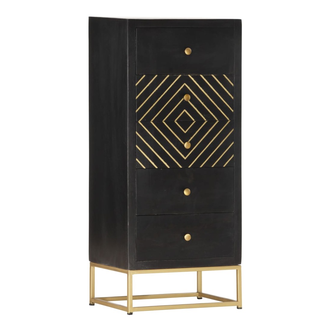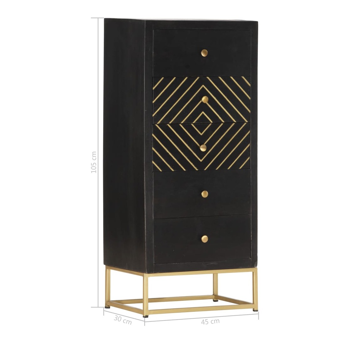 Notre armoire à tiroirs en bois a une finition noire et dorée et sera le centre d'attraction de votre intérieur. Cette commode est fabriquée en bois de manguier massif, stable et durable. Le cadre en acier enduit de poudre ajoute également à sa solidité. Le savoir-faire artisanal et les belles veines du bois font que chaque meuble soit unique et légèrement différent l'un de l'autre. En outre, ce buffet comporte 5 tiroirs, offrant un grand espace pour ranger vos vêtements, vos livres et divers autres articles. Remarque importante : les couleurs peuvent varier d'une pièce à l'autre, ce qui rend chaque pièce unique et légèrement différente l'une de l'autre ; La livraison est aléatoire, ce qui garantit l'exclusivité et l'individualité de votre produit.