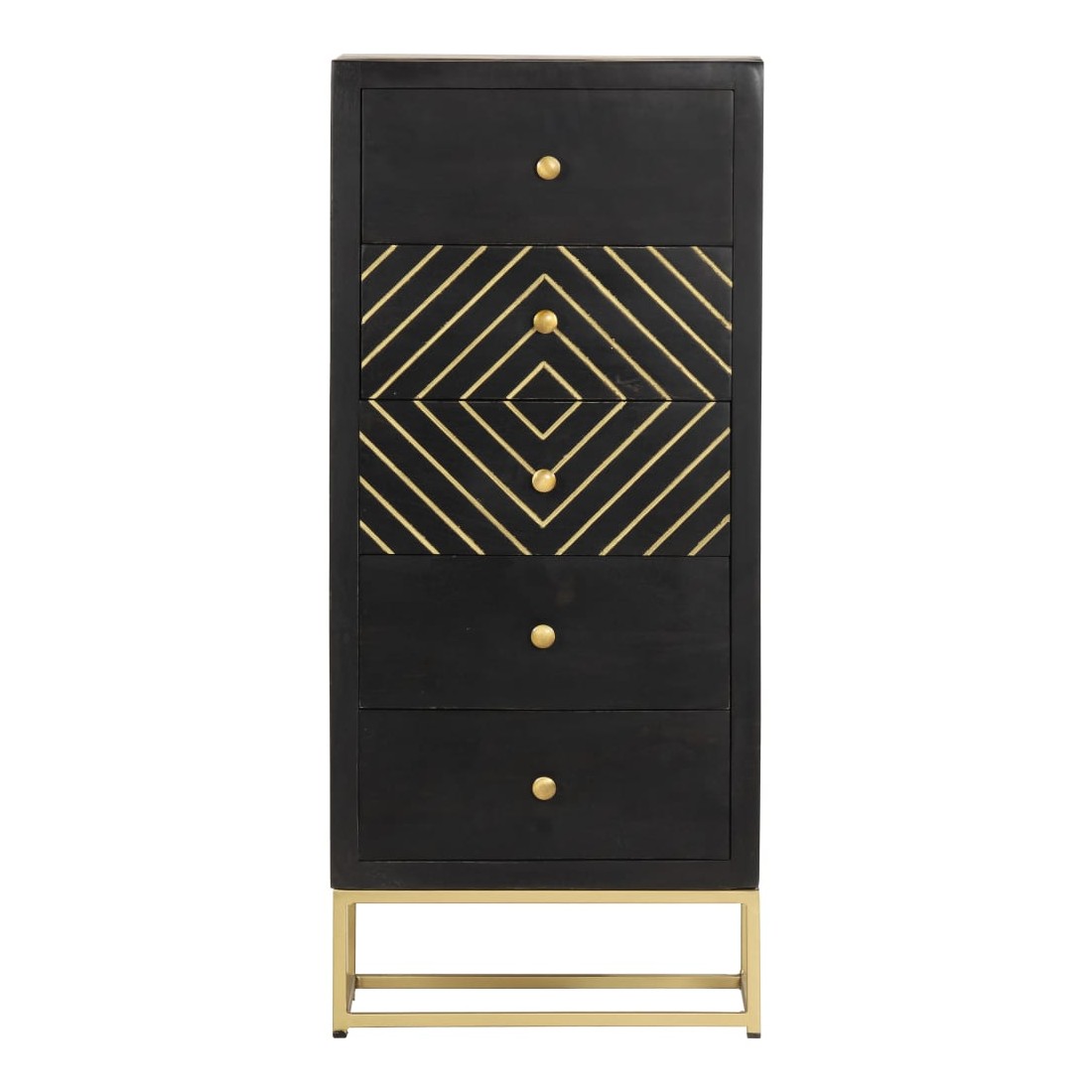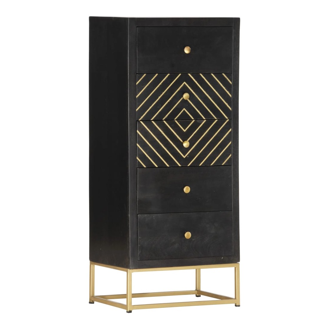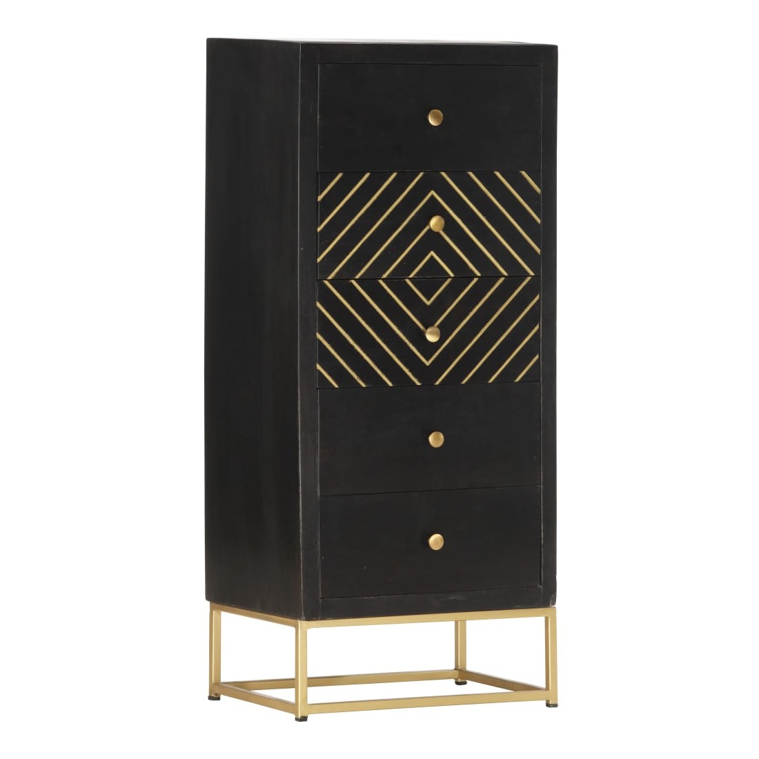 Notre armoire à tiroirs en bois a une finition noire et dorée et sera le centre d'attraction de votre intérieur. Cette commode est fabriquée en bois de manguier massif, stable et durable. Le cadre en acier enduit de poudre ajoute également à sa solidité. Le savoir-faire artisanal et les belles veines du bois font que chaque meuble soit unique et légèrement différent l'un de l'autre. En outre, ce buffet comporte 5 tiroirs, offrant un grand espace pour ranger vos vêtements, vos livres et divers autres articles. Remarque importante : les couleurs peuvent varier d'une pièce à l'autre, ce qui rend chaque pièce unique et légèrement différente l'une de l'autre ; La livraison est aléatoire, ce qui garantit l'exclusivité et l'individualité de votre produit.