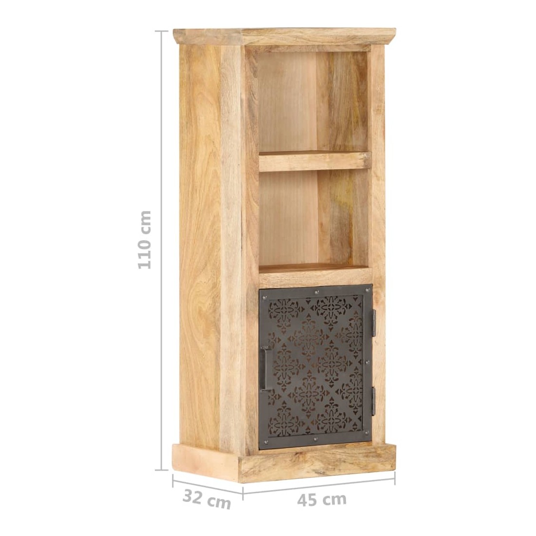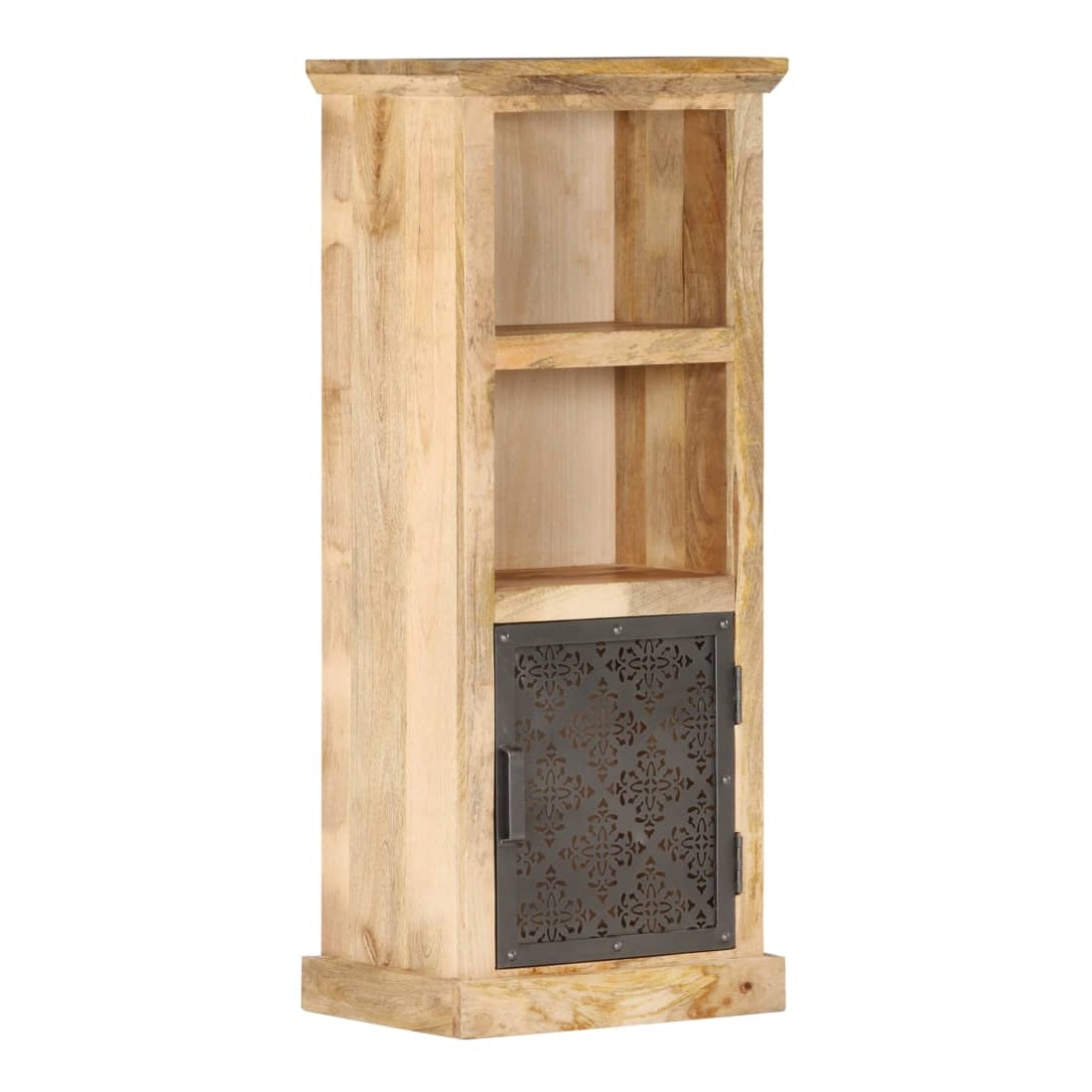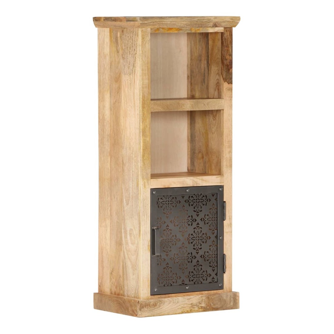 Notre buffet élégant est un véritable accroche-regard pour votre décoration intérieure, offrant une solution idéale pour garder vos articles organisés et hors de vue. Cette armoire haute est en bois de manguier massif, avec une belle finition par polissage, peinture et laquage, ce qui lui confère un aspect raffiné. Les portes en acier au design creux ajoutent à la beauté de l'armoire. Elle comprend deux étagères ouvertes et une porte, offrant un grand espace de rangement pour ranger et afficher vos livres, magazines, plantes en pot, photos encadrées et autres effets personnels.