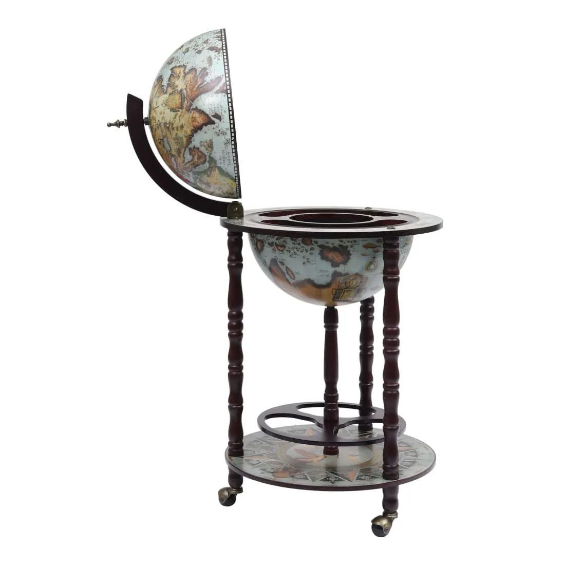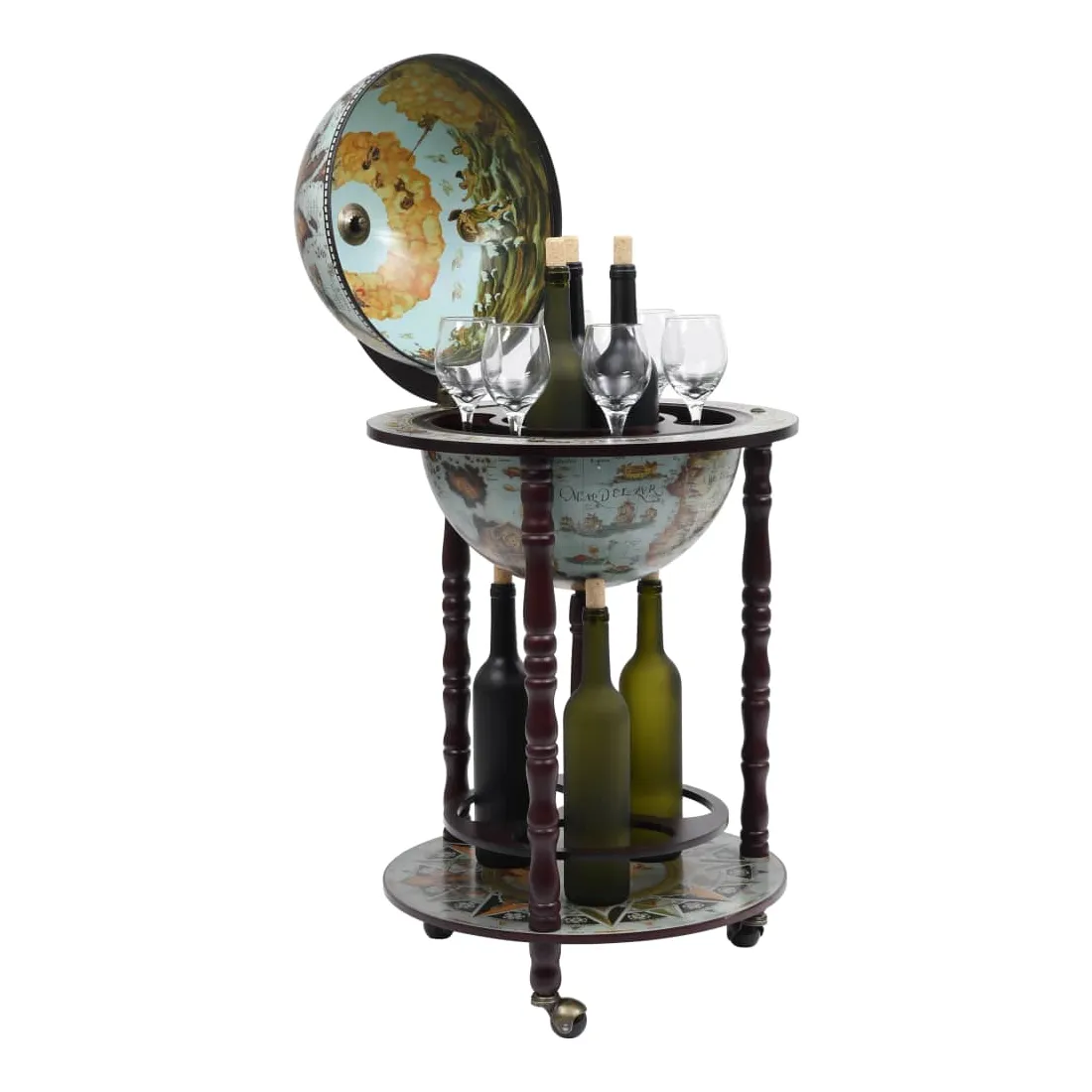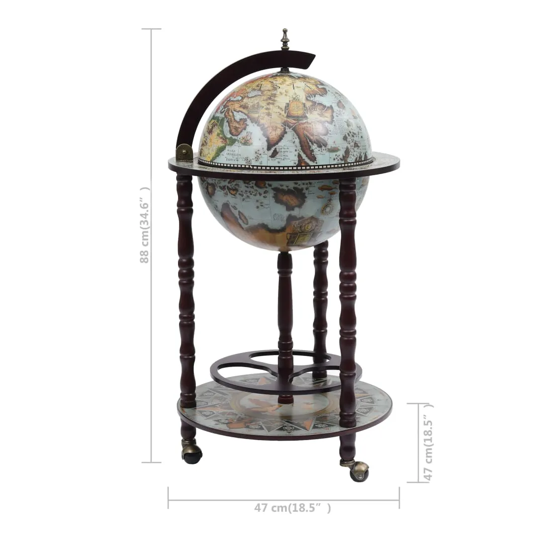 Cet élégant globe de bar est idéal pour ranger plusieurs bouteilles et verres. Fait de bois solide, il peut être utilisé à la maison, au bureau ou partout où vous souhaitez recevoir des invités de manière élégante. Ce bar sous forme de globe repose sur des roues, donc il est facile à déplacer. Il dispose d'une carte du monde antique. Avec un porte-bouteille et porte-verre, il est parfait pour contenir plusieurs bouteilles et verres. Veuillez noter que les bouteilles et les verres ne sont pas inclus.