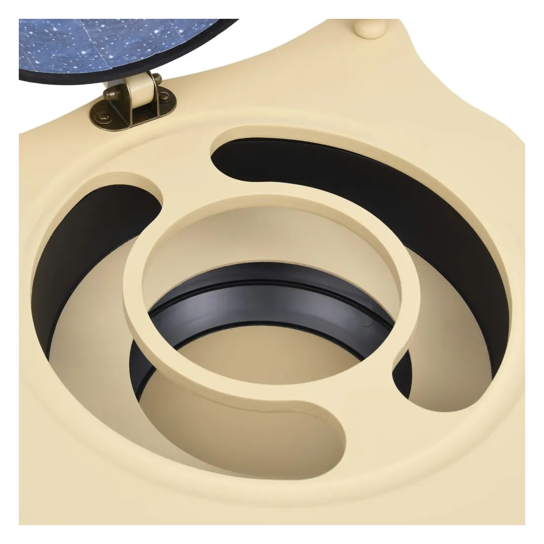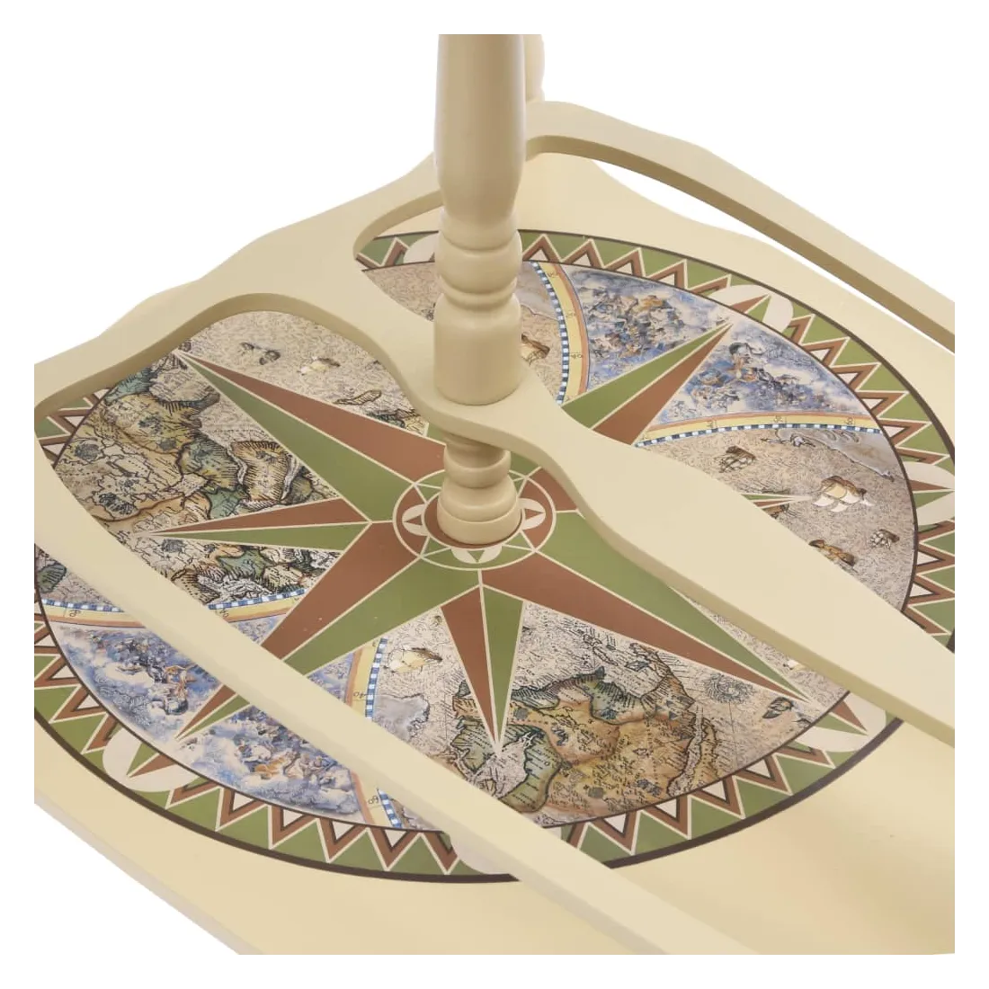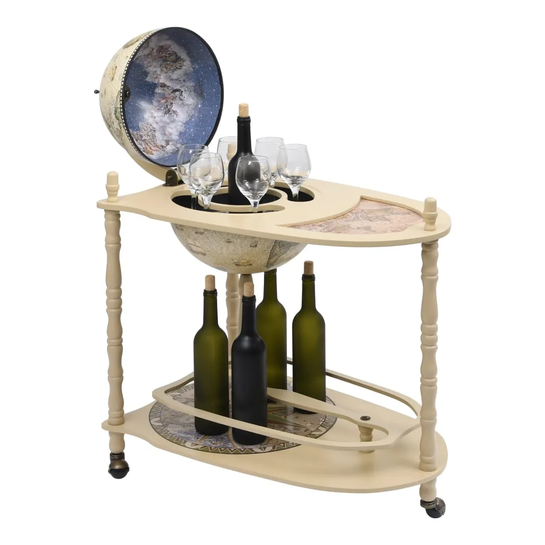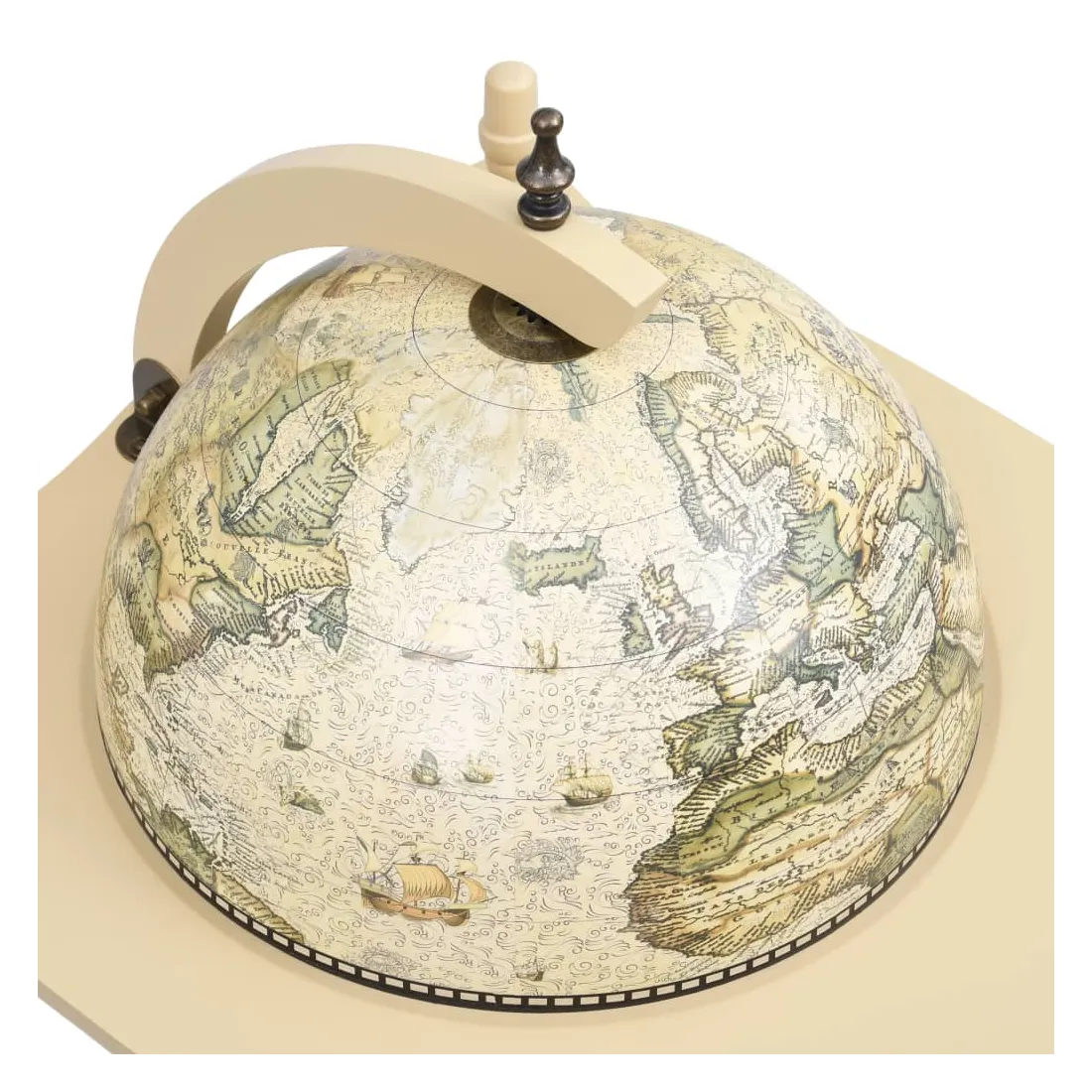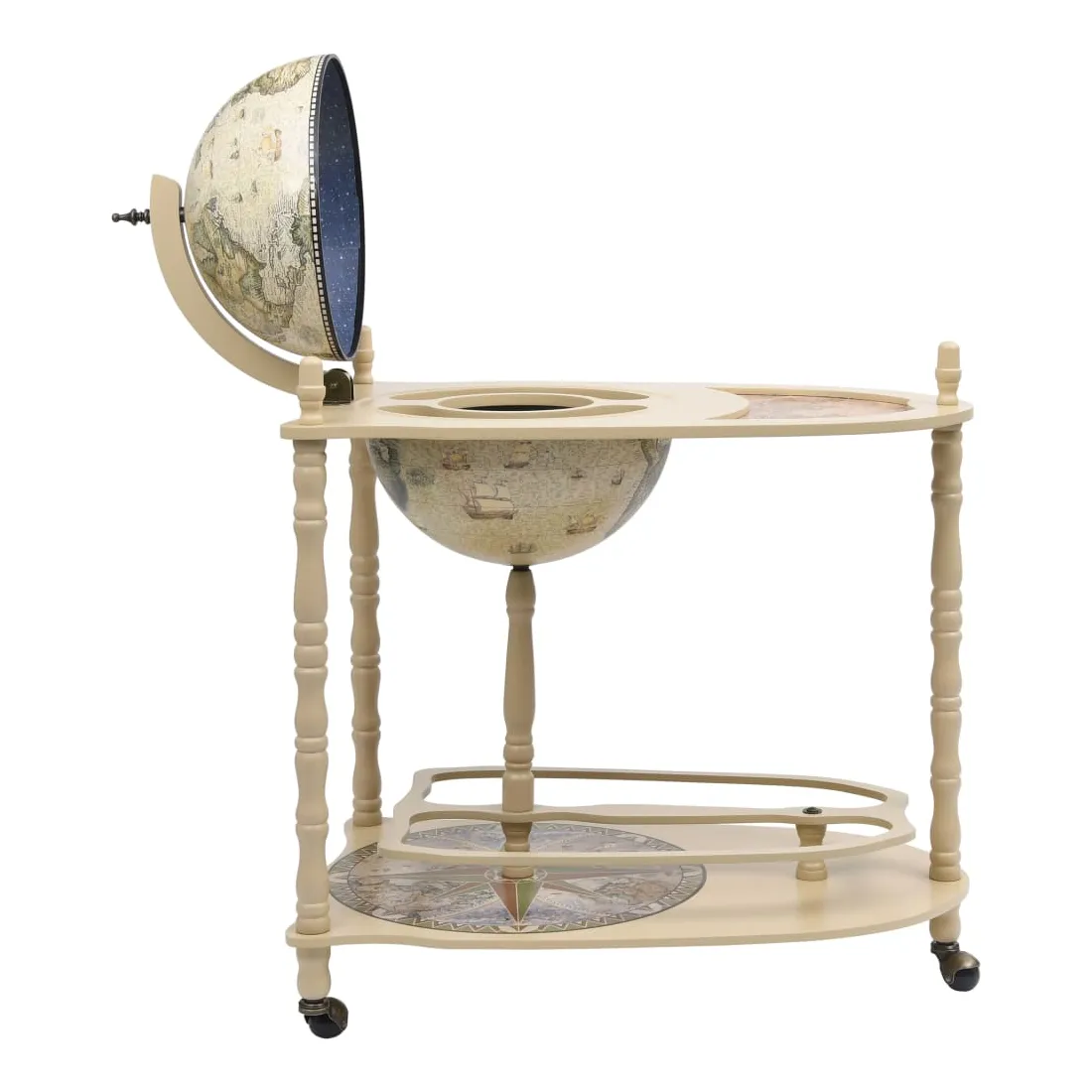 Le globe en bois s'ouvre pour révéler un grand bar avec beaucoup d'espace pour le vin, les spiritueux, la boisson et les verres à pied, ainsi vous pouvez afficher vos bouteilles et verres dans l'ordre dans l'espace caché tout en assurant l'accès facile. Équipé de table étendue et de base inférieure, vous pouvez également mettre des bouteilles et des verres à pied sur la table ou à la base inférieure. La surface extérieure du globe est recouverte d'une vieille carte nautique, tandis que la table, la base et l'intérieur du globe présentent des peintures de l'époque de la Renaissance, ce qui fait du bar un objet d'art et une bonne décoration pour la maison ou le bureau. Le meuble est équipé de roulettes, ce qui rend le déplacement de l'armoire une tâche plus facile. Vous êtes en mesure de déplacer l'armoire à vin à n'importe quel coin de votre pièce avec facilité. Cette armoire de bar sous forme de globe avec table et roues est sans aucun doute une combinaison parfaite de fonctions de stockage et esthétiques.