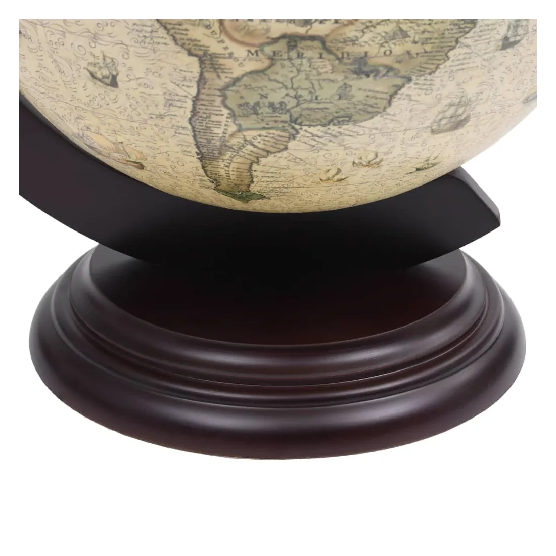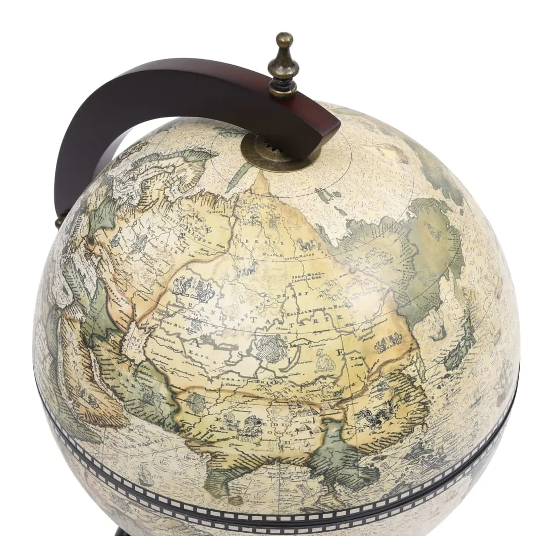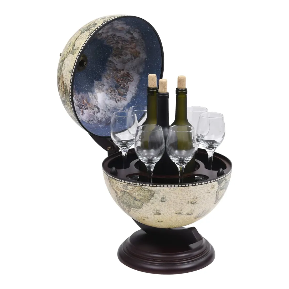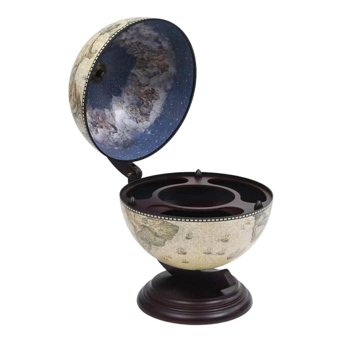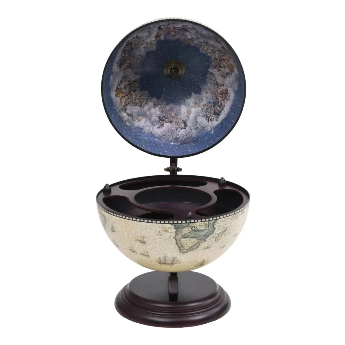 Le bar globe en bois s'ouvre pour révéler un grand bar tournant avec beaucoup d'espace pour le vin, les spiritueux, la boisson et les verres à pied, ainsi vous pouvez afficher votre vin et verres dans l'ordre dans l'espace caché tout en assurant l'accès facile. La surface extérieure du globe est recouverte de répliques de cartes nautiques du 16ème siècle, et les fresques de répliques antiques à l'intérieur, faisant du bar sous forme de globe une œuvre d'art et une jolie décoration pour la maison ou le bureau. Ce bar sous forme de globe est sans aucun doute une combinaison parfaite de fonctions de stockage et esthétiques.